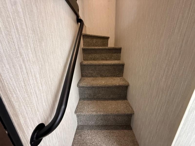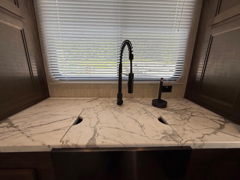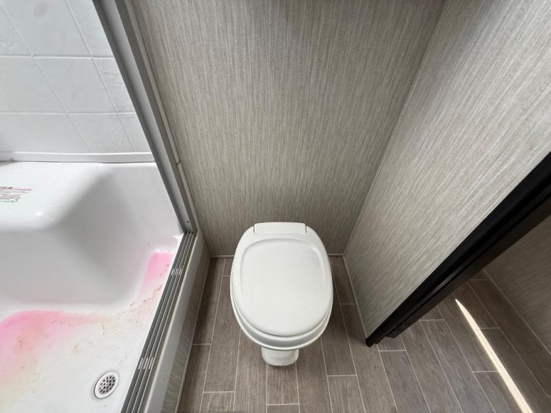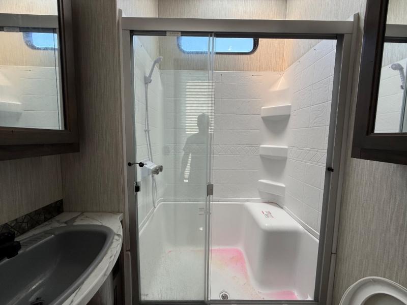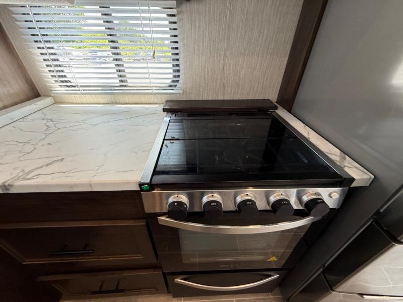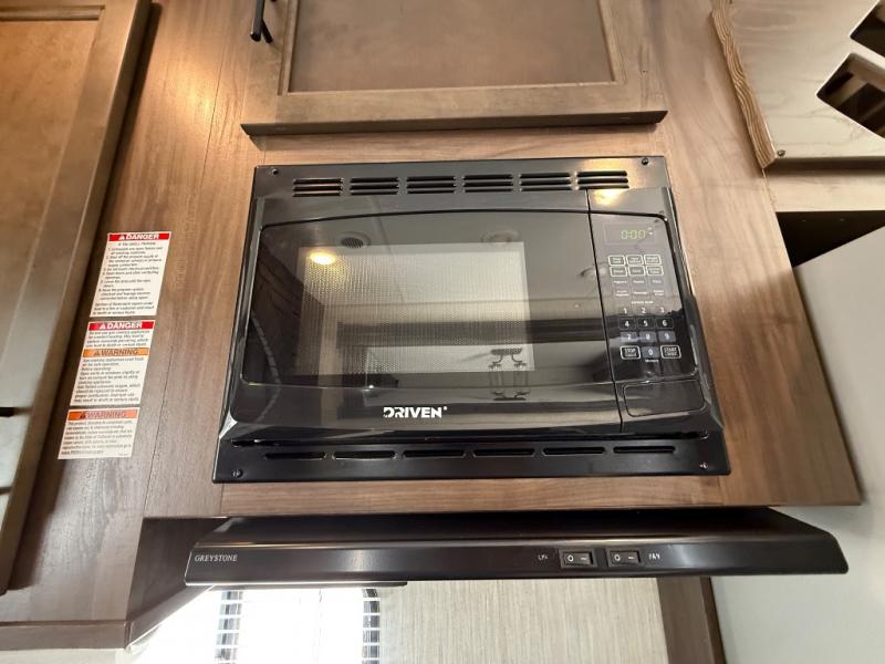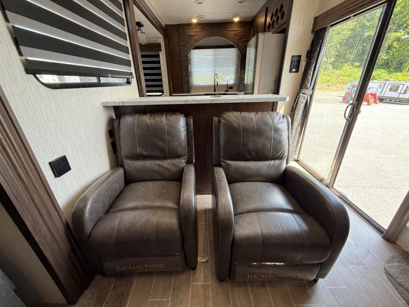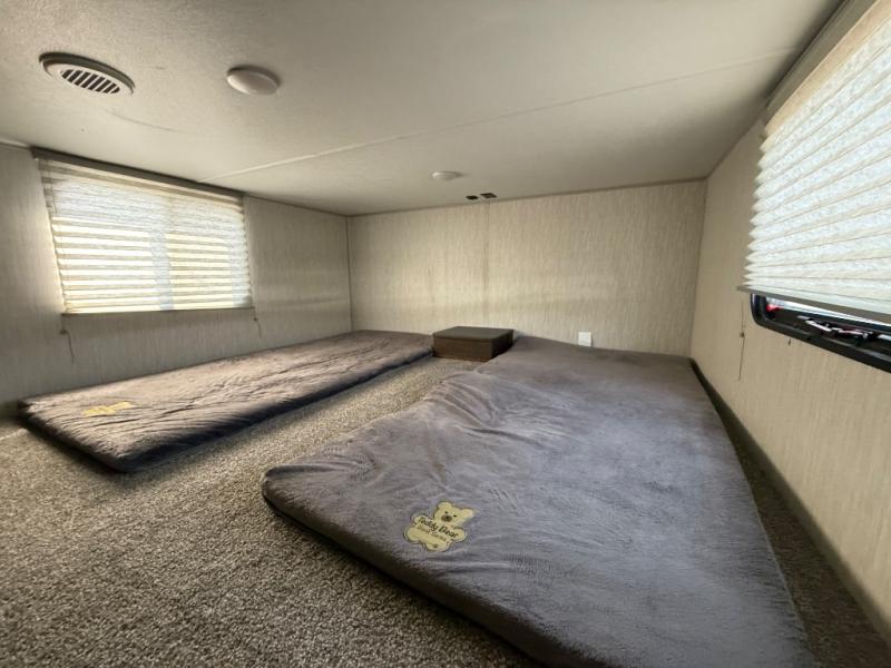 This separate kitchen offers ample counter space, a breakfast bar with two stools, a great view of your place out of the front window, and a free-standing dinette with more windows. After eating a meal together everyone can relax in the separate living area with dual opposing slide outs with hide-a-bed sofas plus there are two overstuffed recliners to watch a show on the massive flat screen TV. Take turns getting ready for bed in the full bathroom, and the kids will quickly head up stairs to the loft with two mats and storage while you retire to your spacious rear bedroom with a queen bed and your own storage.