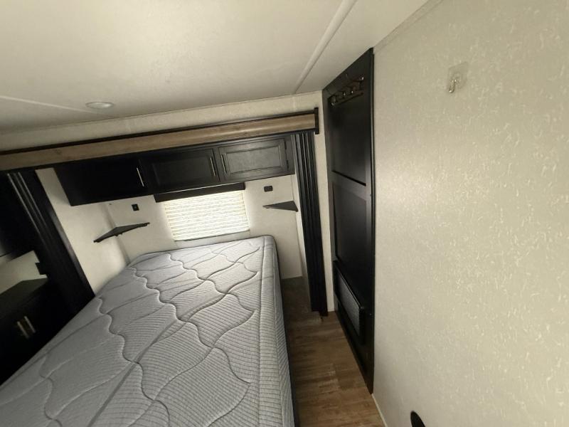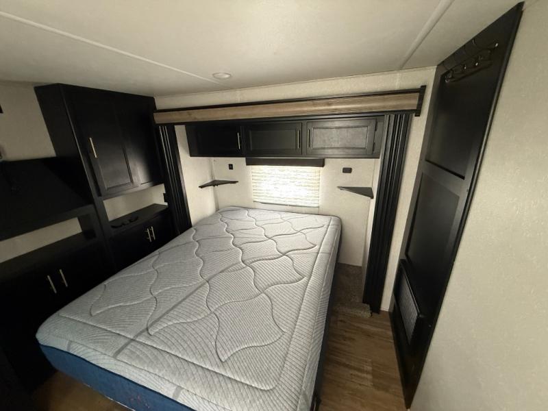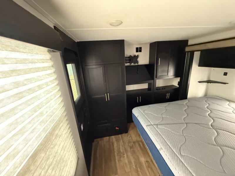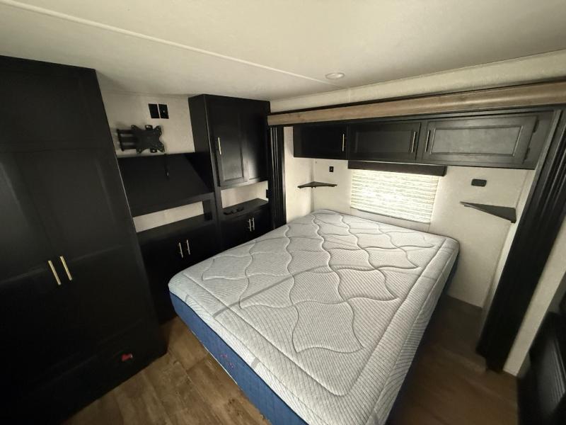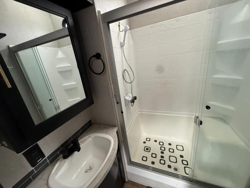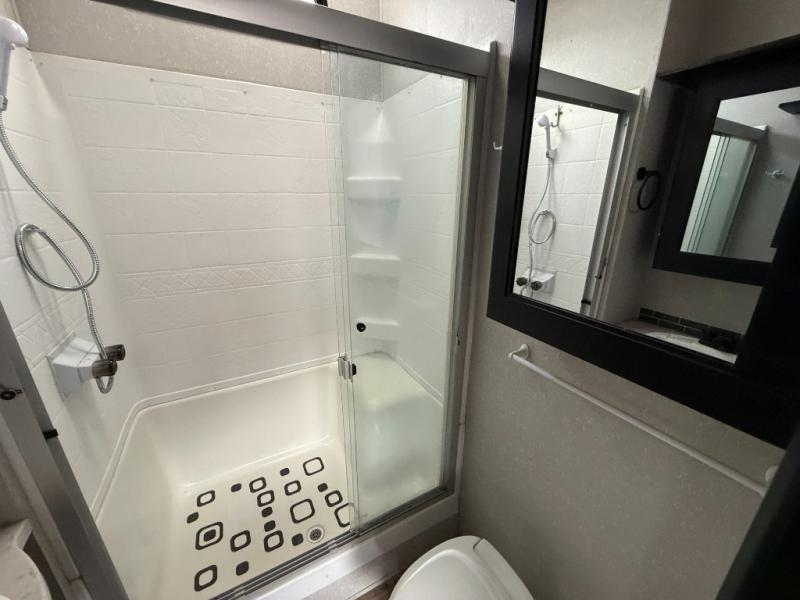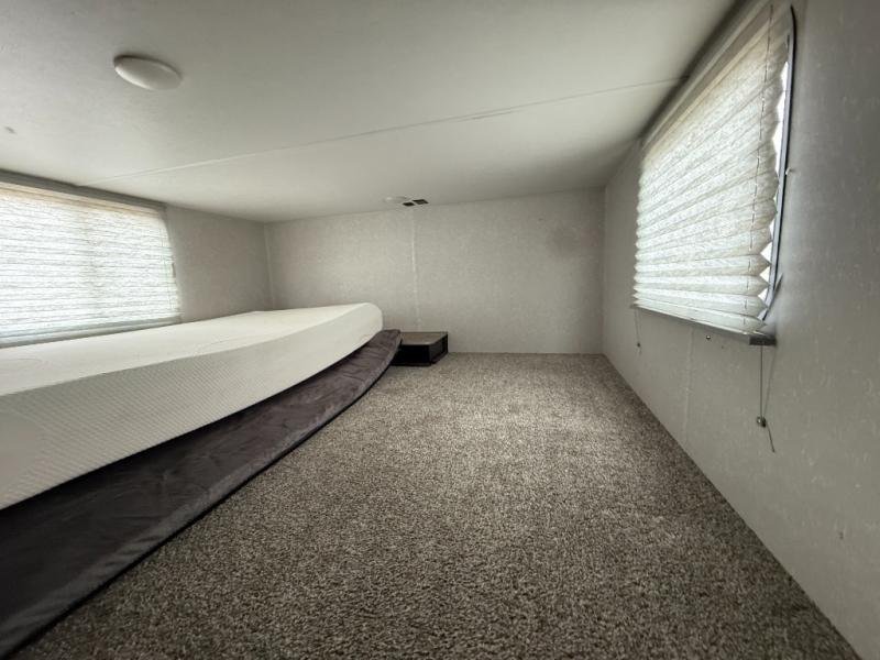 This separate kitchen offers ample counter space, a breakfast bar with two stools, a great view of your place out of the front window, and a free-standing dinette with more windows. After eating a meal together everyone can relax in the separate living area with dual opposing slide outs with hide-a-bed sofas plus there are two overstuffed recliners to watch a show on the massive flat screen TV. Take turns getting ready for bed in the full bathroom, and the kids will quickly head up stairs to the loft with two mats and storage while you retire to your spacious rear bedroom with a queen bed and your own storage.