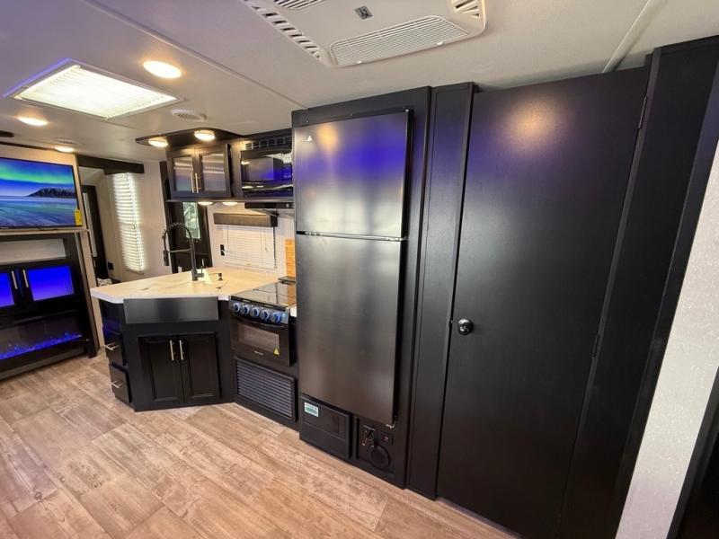 LARGE LIVING AREA WITH THEATER SEATING & TRIFOLD SLEEPER SOFA. ELECTRIC FIREPLACE & BIG FLAT SCREEN TV. BEAUTIFUL KITCHEN with residential refrigerator, STAINLESS STEEL APPLIANCES, and LOTS OF CABINET STORAGE.