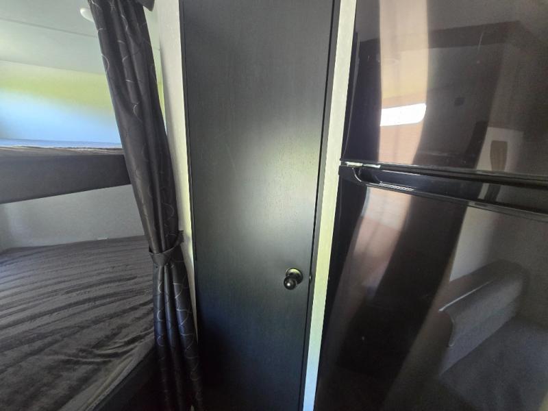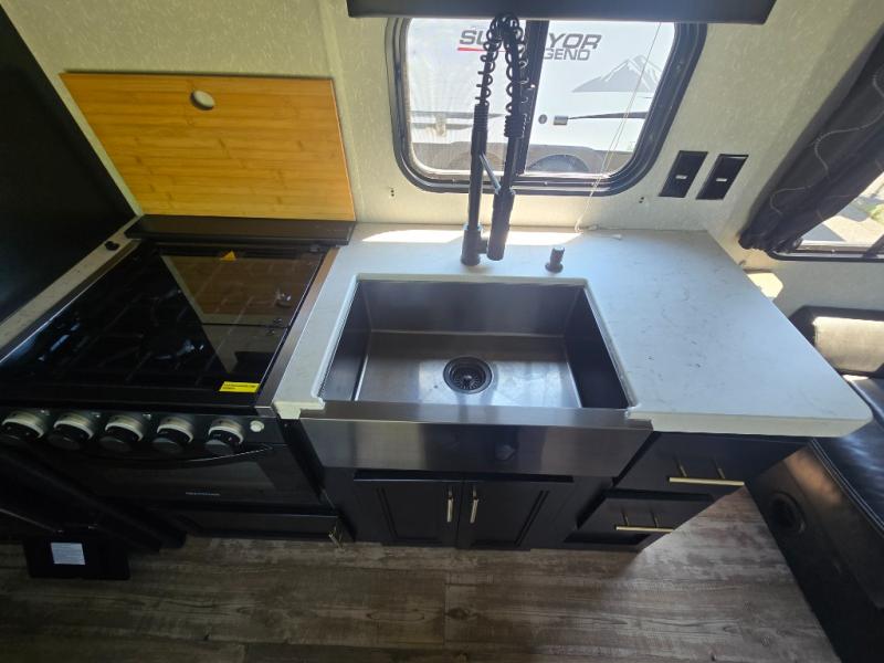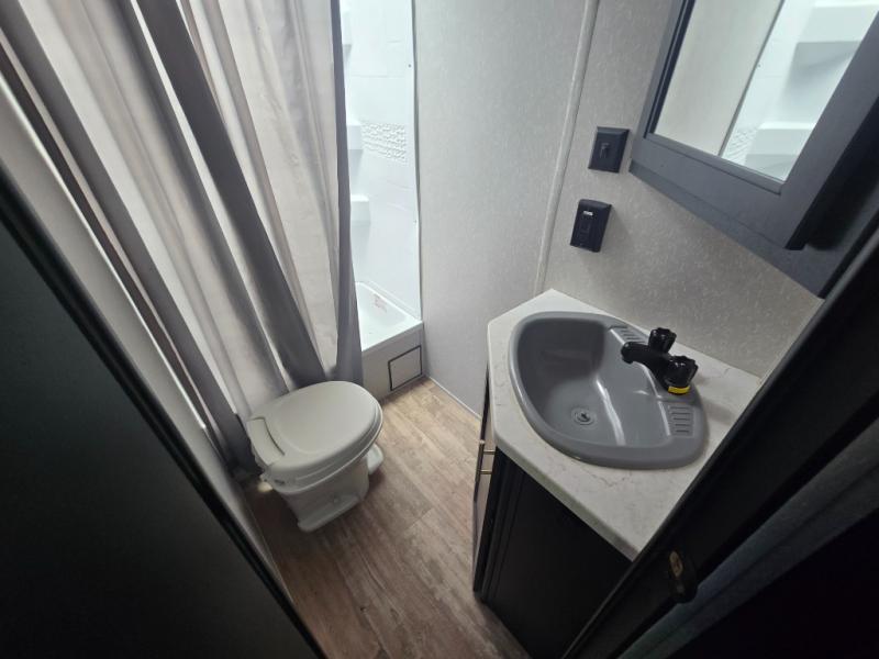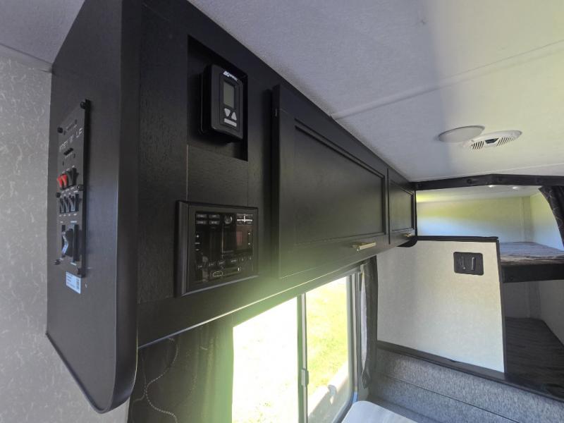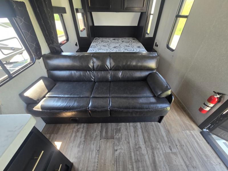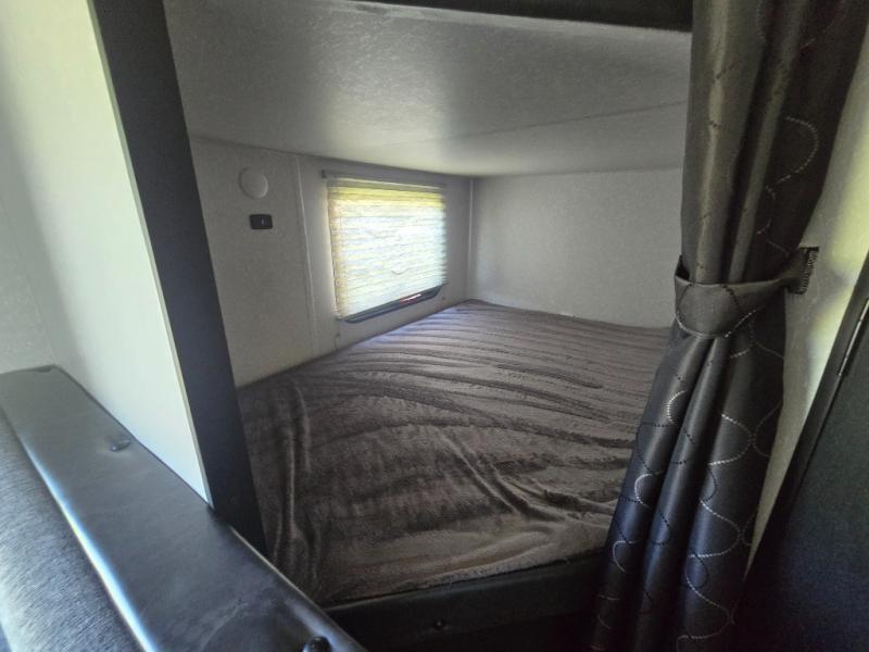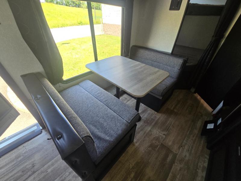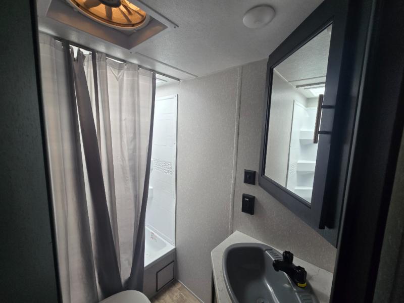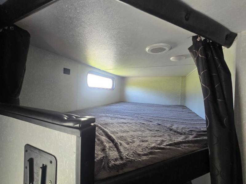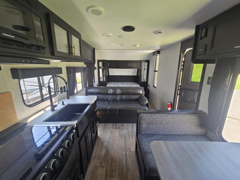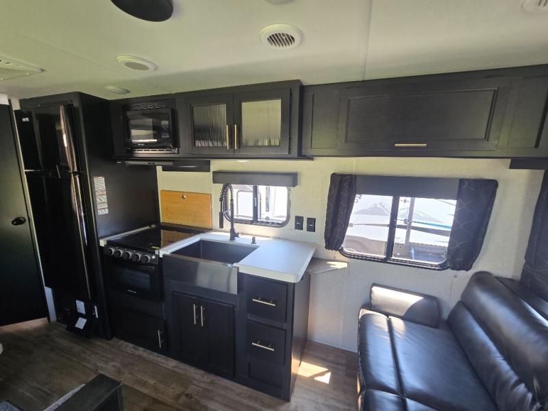Enjoy cooking for your family of nine in this Cherokee Grey Wolf travel trailer. With a three-burner cooktop, an overhead microwave, and an oven, you can easily cook just like home. The residential farm-style stainless steel sink makes cleaning your larger pots and pans quite simple, and the large overhead cabinets make storage an easy task as well. There is plenty of seating for the whole gang with the sofa and the booth dinette to play a game or two after you have enjoyed your delicious meal. Your kiddos are sure to love having their own set of double-size bunks conveniently located next to the rear bath, and you will love having your own front semi-private bedroom when you close the privacy curtain. You can also create some outdoor living space beneath the 15' power awning so that you can enjoy the great outdoors whether rain or shine!