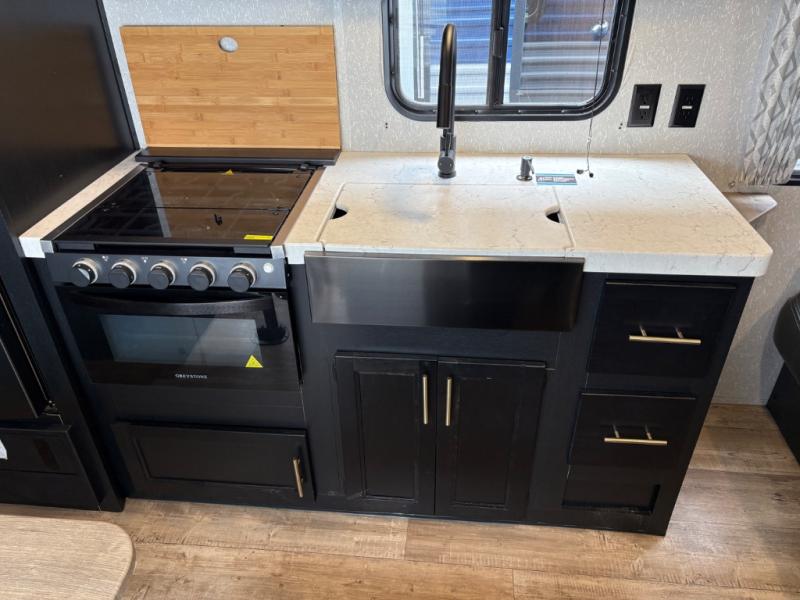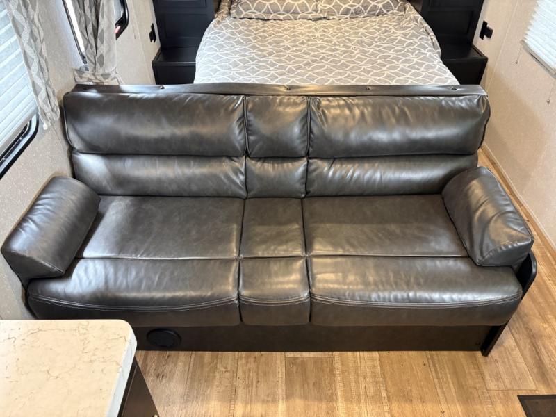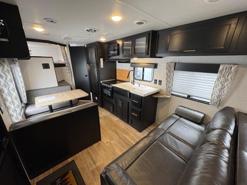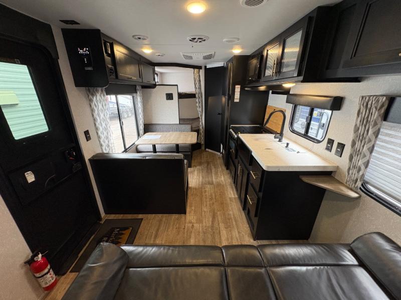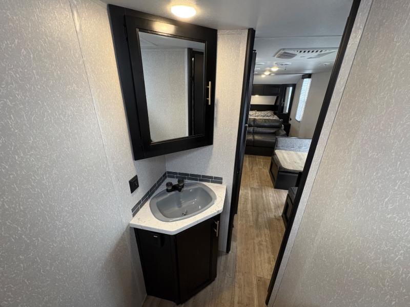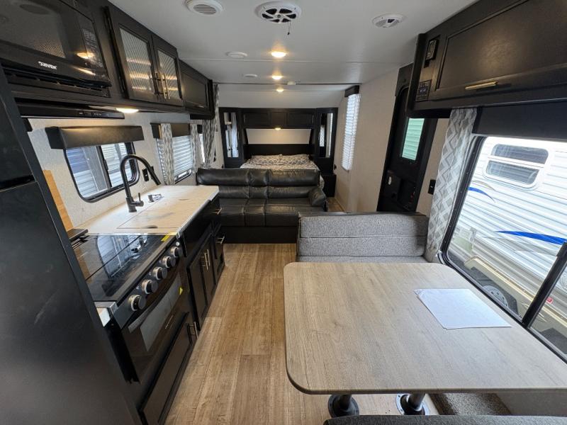 Enjoy cooking for your family of nine in this Cherokee Grey Wolf travel trailer. With a three-burner cooktop, an overhead microwave, and an oven, you can easily cook just like home. The residential farm-style stainless steel sink makes cleaning your larger pots and pans quite simple, and the large overhead cabinets make storage an easy task as well. There is plenty of seating for the whole gang with the sofa and the booth dinette to play a game or two after you have enjoyed your delicious meal. Your kiddos are sure to love having their own set of double-size bunks conveniently located next to the rear bath, and you will love having your own front semi-private bedroom when you close the privacy curtain. You can also create some outdoor living space beneath the 15' power awning so that you can enjoy the great outdoors whether rain or shine!