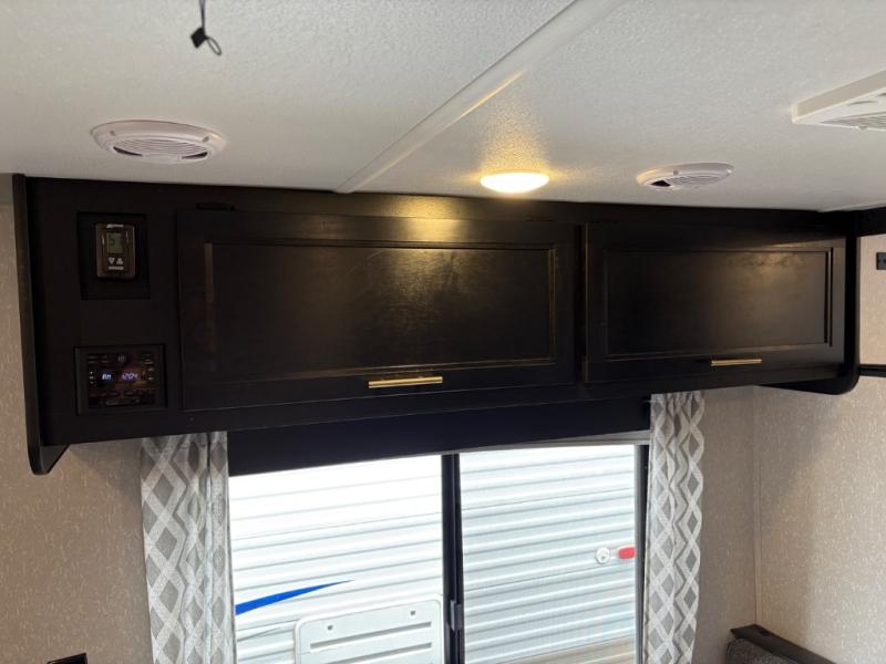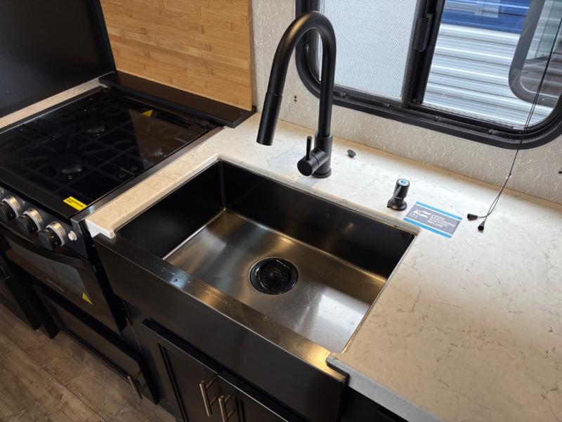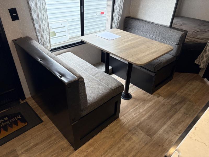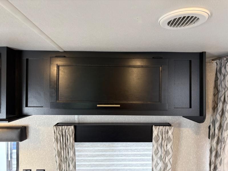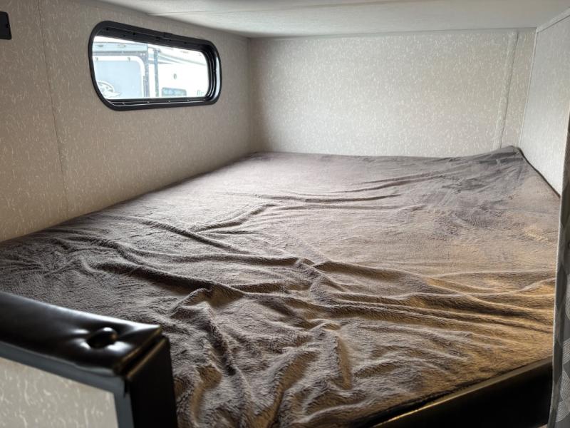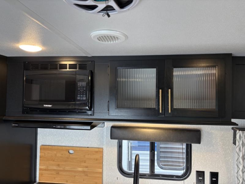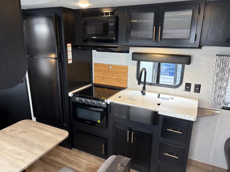 Enjoy cooking for your family of nine in this Cherokee Grey Wolf travel trailer. With a three-burner cooktop, an overhead microwave, and an oven, you can easily cook just like home. The residential farm-style stainless steel sink makes cleaning your larger pots and pans quite simple, and the large overhead cabinets make storage an easy task as well. There is plenty of seating for the whole gang with the sofa and the booth dinette to play a game or two after you have enjoyed your delicious meal. Your kiddos are sure to love having their own set of double-size bunks conveniently located next to the rear bath, and you will love having your own front semi-private bedroom when you close the privacy curtain. You can also create some outdoor living space beneath the 15' power awning so that you can enjoy the great outdoors whether rain or shine!