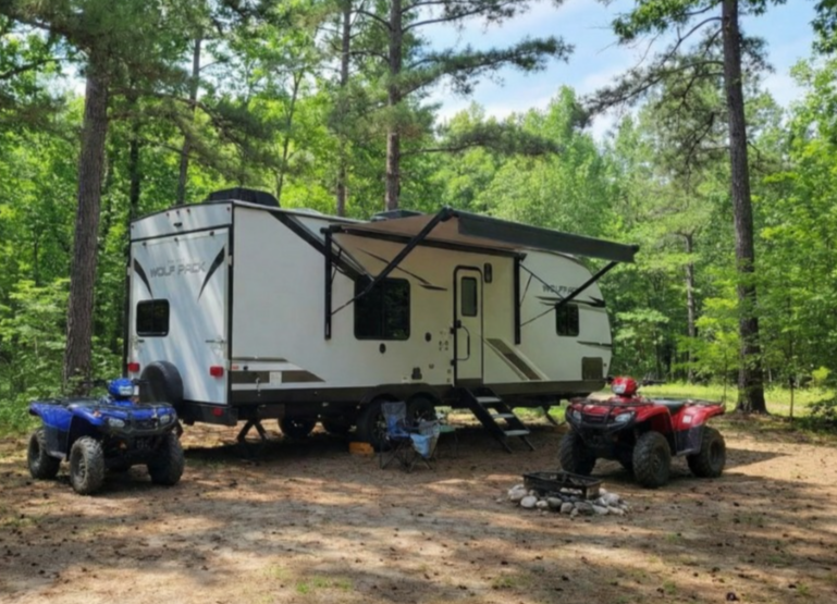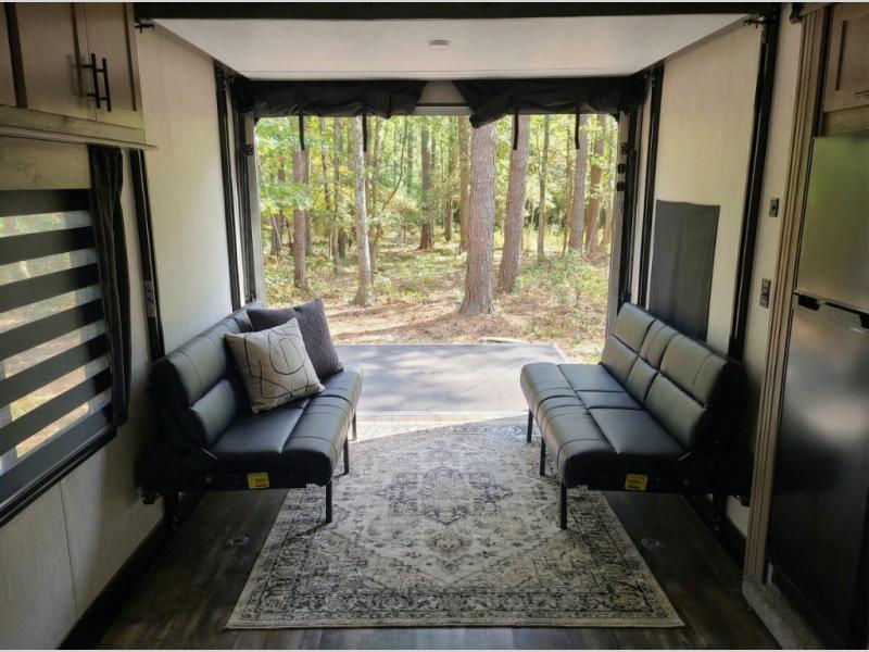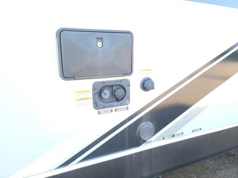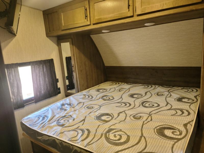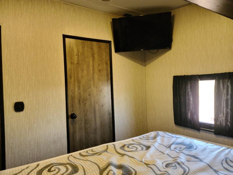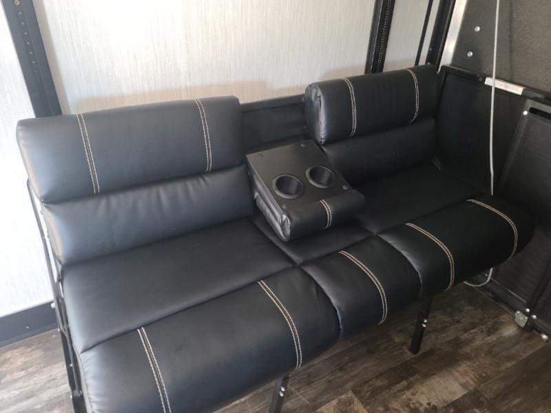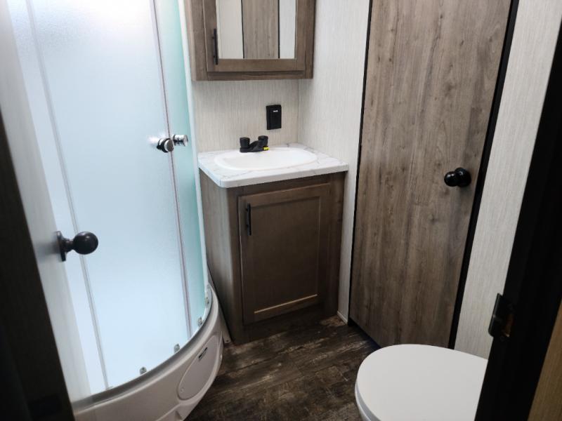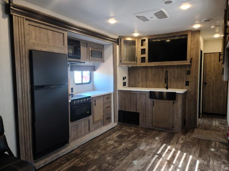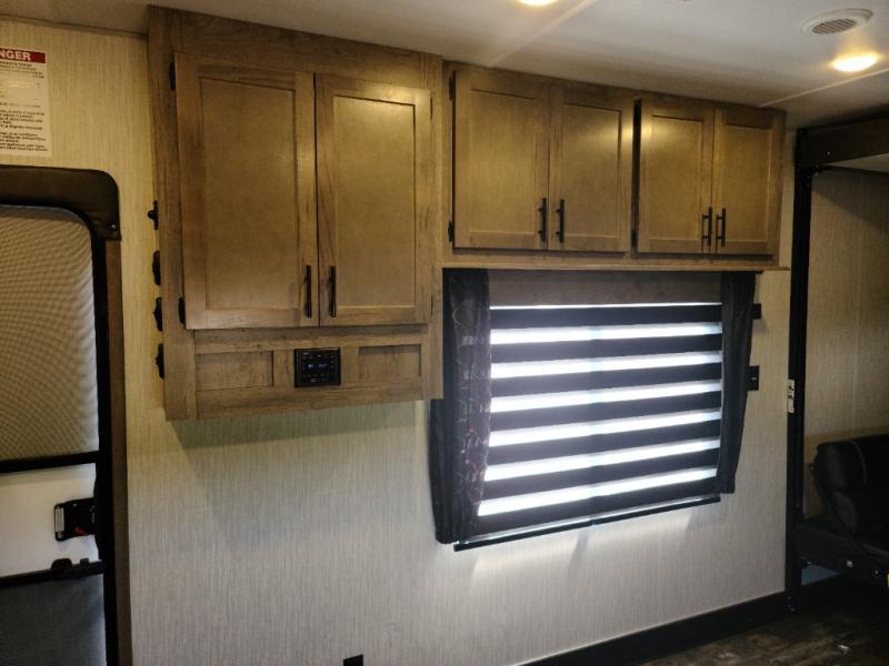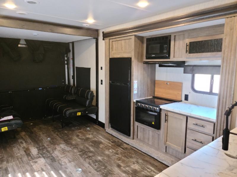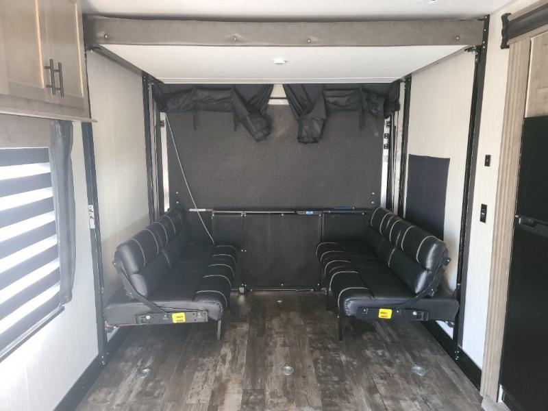 The versatile Cherokee Wolf Pack toy haulers are ready for all your excursions! Each model includes a true high gloss gel coat, a 102" wide body design, and a forced air heated underbelly and enclosed holding tanks so you can camp year around. You will enjoy hassle-free features such as, the in cab tire pressure monitor system, the Happijac bed lift system, and the 100 gallon fresh water capacity. Each model includes a shower skylight, LED interior/exterior lights, Zebra shades in the living area, and a black stainless steel farm sink for that added touch-of-home. The fifth wheels include stabilizer jacks, a second 15K A/C unit in the bedroom, and 50 Amp service. You will appreciate 30 Amp service in the travel trailers, a power tongue jack, and ramp door cables. These toy haulers also include USB charging stations to keep all your gadgets charged and ready to go, premium Teddy Bear bunk mats for comfortability, and a reverse activated light and backup camera for easy loading and unloading!