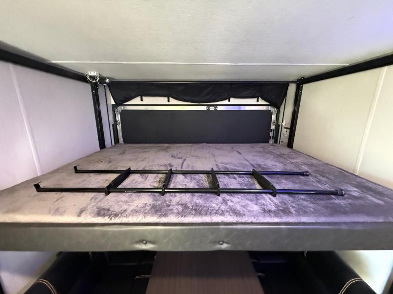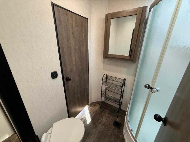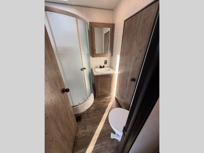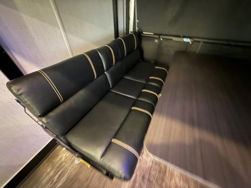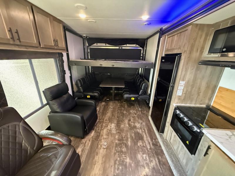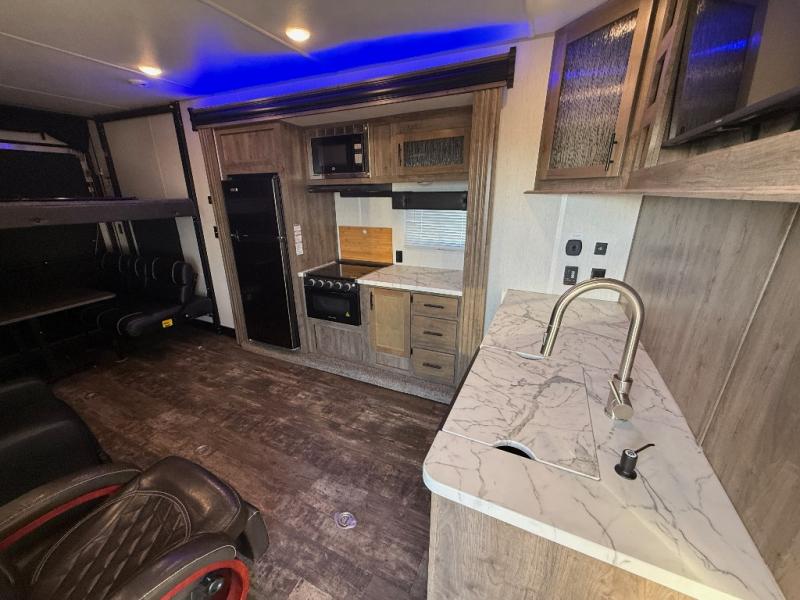 Camping with your favorite ride-on toys just got a whole lot easier in this toy hauler travel trailer. Once your toys are unloaded from the 15' garage, enjoy a cold drink at the removable dinette table before heading out on a trail. The radius shower in the dual entry bath will allow you to clean up once you return, and you'll find all the kitchen appliances needed to prepare dinner after your shower. The kids will find sleeping space on the two sofa beds, and the Happijac power bed above, while you and your spouse enjoy the Wolf Pack king bed in the front master bedroom!