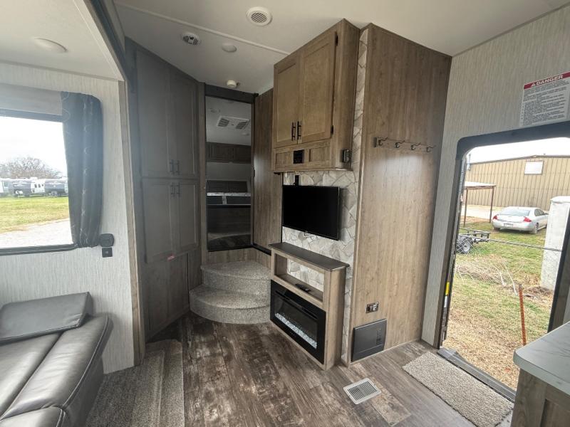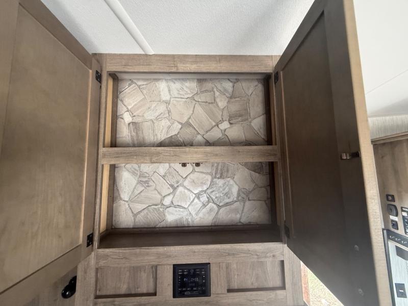 Enjoy space to relax and have fun in this toy hauler fifth wheel that can easily be converted into a bunkhouse model. Once you unload your four wheeler or dirt bikes from the 12' garage, set up the ramp door "party patio" for extra fun. The kids can enjoy lunch on the removable dinette table, or sit at the booth dinette in the main living area. There are dual entry doors for added convenience, and a large slide out so you won't trip over the napping dog. The chef of the family can prepare meals in the spacious kitchen, and the fireplace right across from the jack knife sofa will make it feel more like home. You and your spouse will love the front master bedroom that includes a Wolf Pack king bed, three wardrobes, plus your own private entrance into the dual entry bath!
