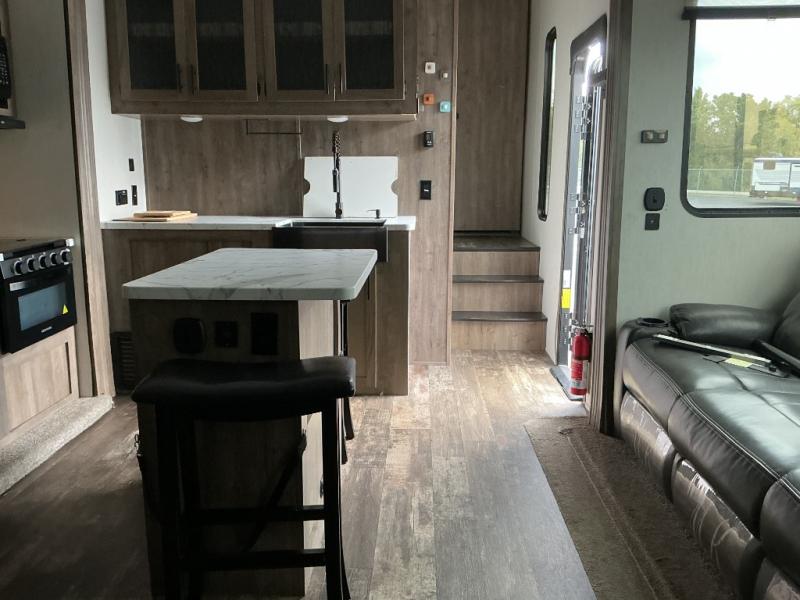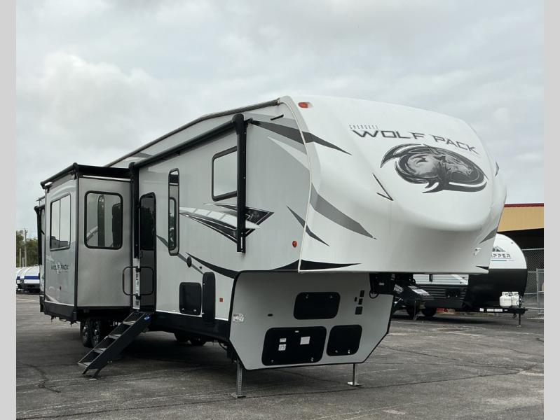 The versatile Cherokee Wolf Pack toy haulers are ready for all your excursions! Each model includes a true high gloss gel coat, a 102" wide body design, and a forced air heated underbelly and enclosed holding tanks so you can camp year around. You will enjoy hassle-free features such as, the in cab tire pressure monitor system, the Happijac bed lift system, and the 100 gallon fresh water capacity. Each model includes a shower skylight, LED interior/exterior lights, Zebra shades in the living area, and a black stainless steel farm sink for that added touch-of-home. The fifth wheels include stabilizer jacks, a second 15K A/C unit in the bedroom, and 50 Amp service. You will appreciate 30 Amp service in the travel trailers, a power tongue jack, and ramp door cables. These toy haulers also include USB charging stations to keep all your gadgets charged and ready to go, premium Teddy Bear bunk mats for comfortability, and a reverse activated light and backup camera for easy loading and unloading!