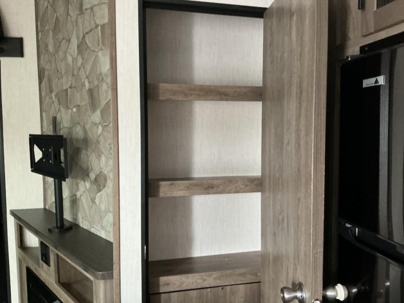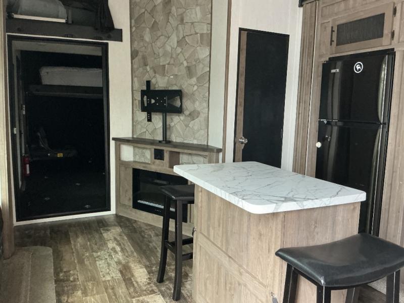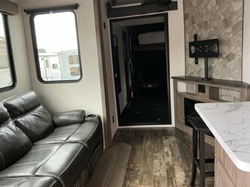 This toy hauler fifth wheel is packed full of features your family is sure to love. Your guests will have their own space in the 14' separate garage that includes a half bath, sleeping space for five with the loft included, plus a private exterior entrance door. Everyone will enjoy the ramp door that converts to a party patio for visiting friends with a cold drink. The kitchen and main living area will feel just like home with its fireplace and entertainment center, a party recliner sofa, plus a bar top with stools. The chef of the family will have everything they need to prepare meals each day, including a three burner cooktop, ample counter space, plus a pantry to store dry ingredients. You and your spouse will love the front master suite that includes a king bed, two wardrobes, and your own private entrance into the dual entry bath!