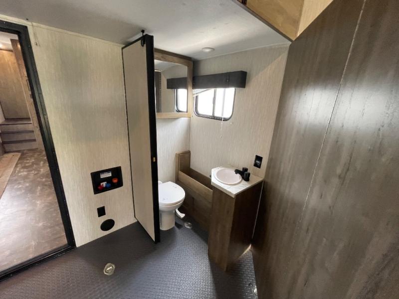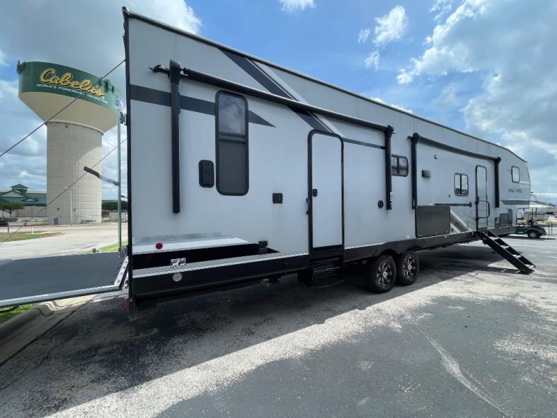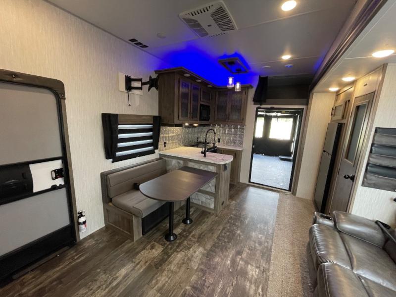 If your outdoors excursions include an ATV, dirt bikes, and plenty of riding gear, you need this spacious toy hauler fifth wheel. The 15' 10" separate garage includes its own half bath with folding walls so you can easily load your toys, plus the loft above provides sleeping space for the kids! The main living area is sure to be a big hangout spot with the party recliner sofa within the large slide, the table with bench seating, and the fireplace. If the weather is nice, you may just spend your whole day outdoors with the outside kitchen, and the two power awnings for maximum shade! After a day of entertaining, you will love retreating to the front master bedroom that includes a Wolf pack king bed, a slide out wardrobe and night stand, and your own door to the dual entry bath!