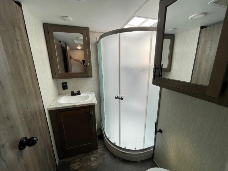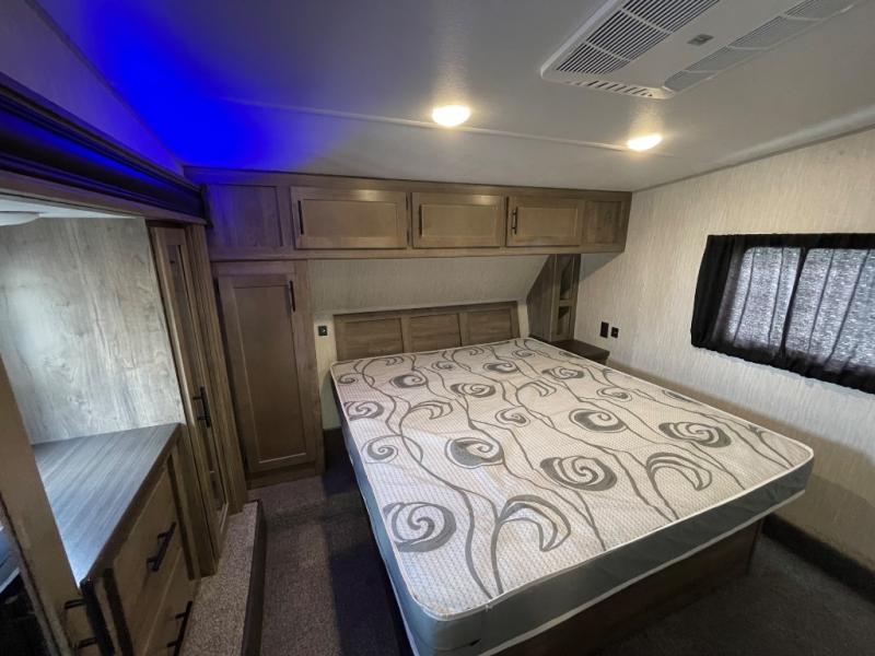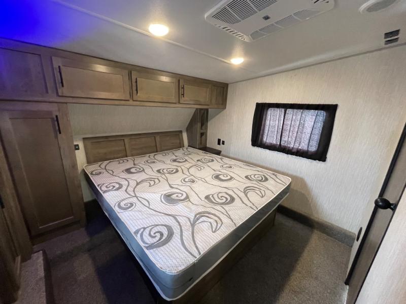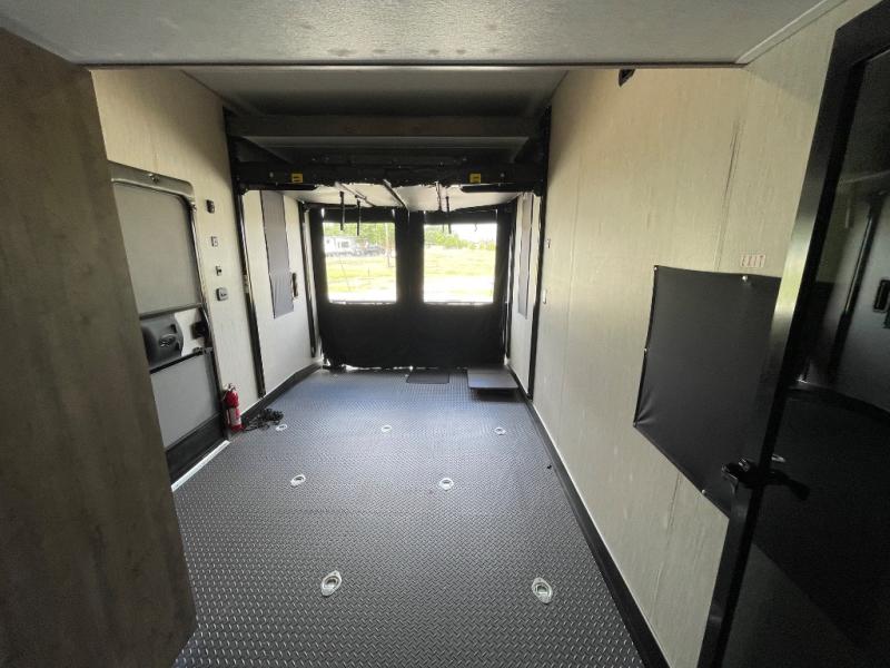 The versatile Cherokee Wolf Pack toy haulers are ready for all your excursions! Each model includes a true high gloss gel coat, a 102" wide body design, and a forced air heated underbelly and enclosed holding tanks so you can camp year around. You will enjoy hassle-free features such as, the in cab tire pressure monitor system, the Happijac bed lift system, and the 100 gallon fresh water capacity. Each model includes a shower skylight, LED interior/exterior lights, Zebra shades in the living area, and a black stainless steel farm sink for that added touch-of-home. The fifth wheels include stabilizer jacks, a second 15K A/C unit in the bedroom, and 50 Amp service. You will appreciate 30 Amp service in the travel trailers, a power tongue jack, and ramp door cables. These toy haulers also include USB charging stations to keep all your gadgets charged and ready to go, premium Teddy Bear bunk mats for comfortability, and a reverse activated light and backup camera for easy loading and unloading!