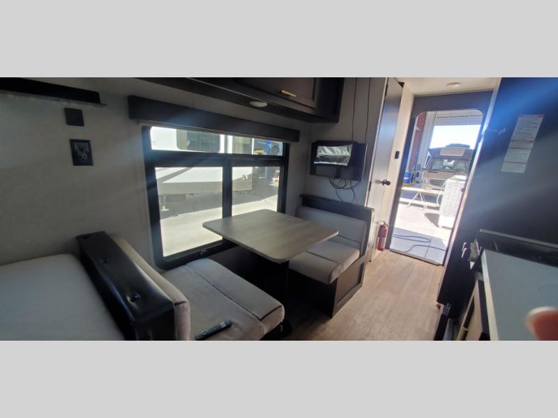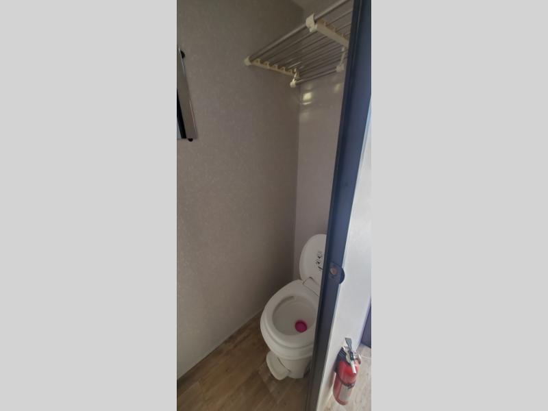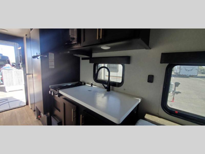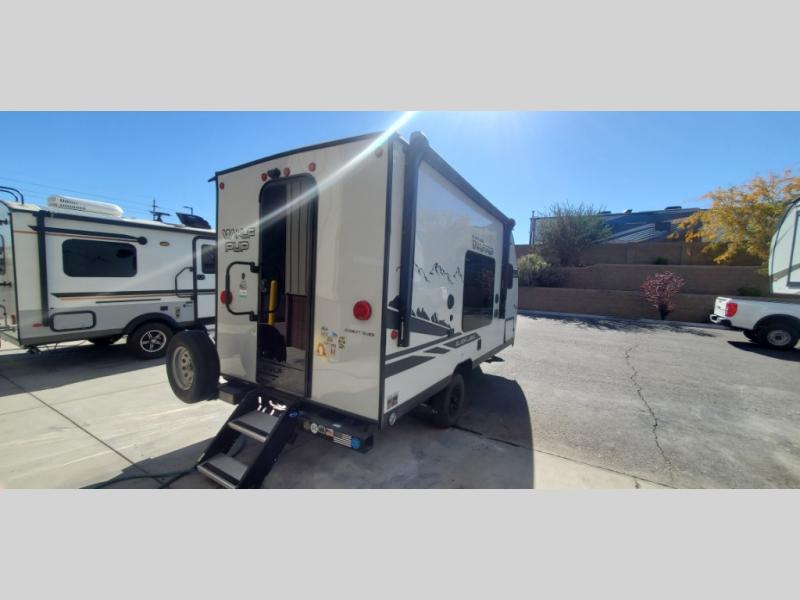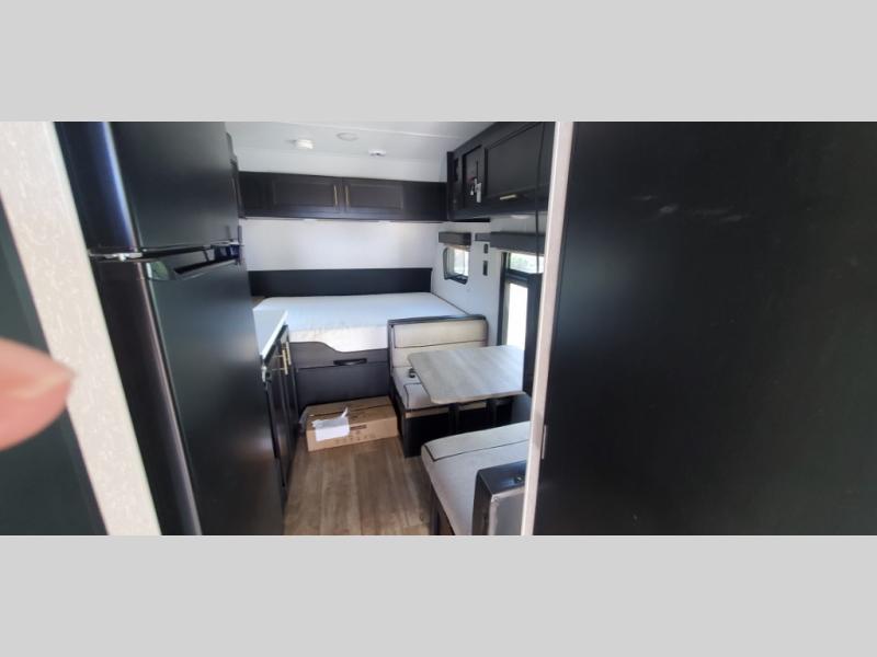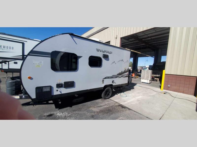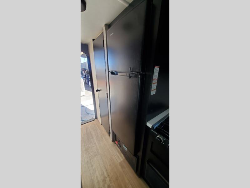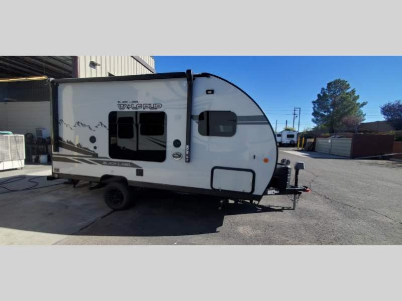 This Cherokee Wolf Pup travel trailer with its unique rear entry door allows you to set up at the campsite with a view as you walk outside each morning. You can relax under the power awning before going fishing or taking a walk around the lake. When you get hungry, the high-output cooktop and microwave allow you to make hot meals, and you can store your drinks in the 11-cubic foot refrigerator. Have a seat at the dinette for meals or playing games, and offer the dinette to an overnight guest for a place to sleep. The queen bed up front allows you to sleep on your own bedding each night with overhead cabinets for your clothing and a shelf to set your cell phone and keys on. And the separated bath offers a private toilet room and a private shower on the opposite side so that two people can get ready at once.