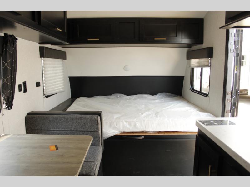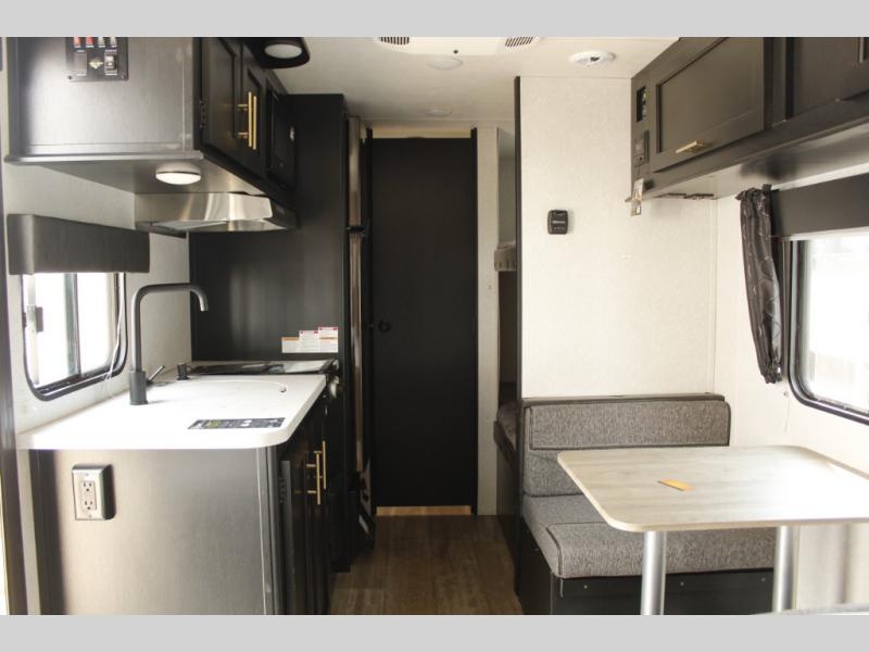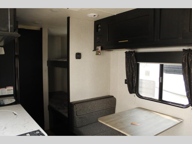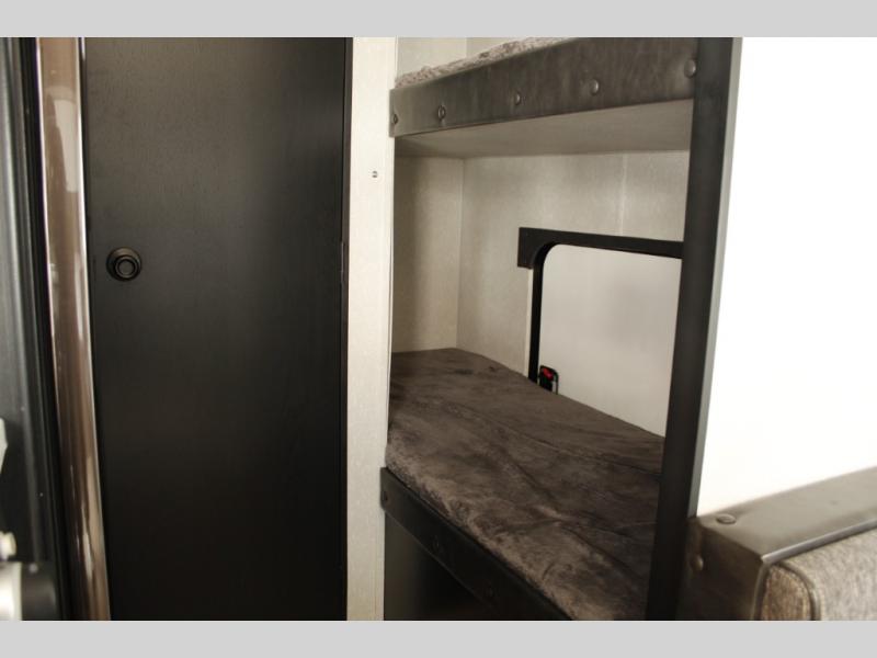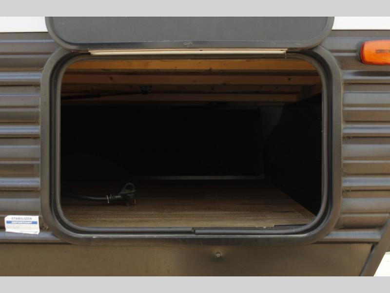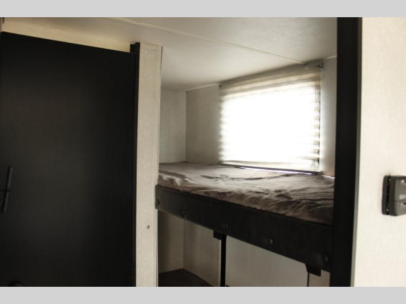 Imagine your kids on the rear bunk beds in this Cherokee Wolf Pup travel trailer while you enjoy the front queen bed before everyone gets up to make breakfast and head out for a hike. The kitchen includes a high-output cooktop and microwave, as well as a refrigerator to store your leftovers and a sink to wash the dishes. You will find storage in the overhead cabinets, and there is a shelf by the queen bed. Your hiking gear can also be stowed out in the outside storage.