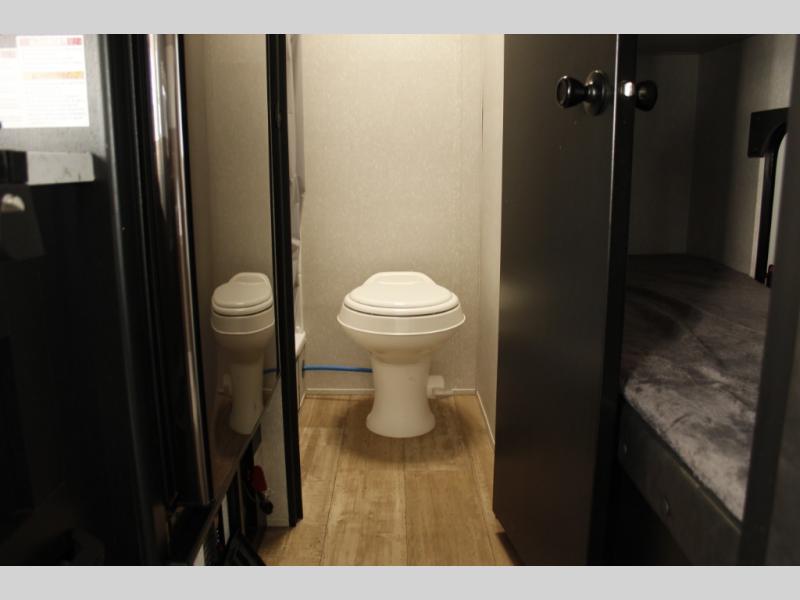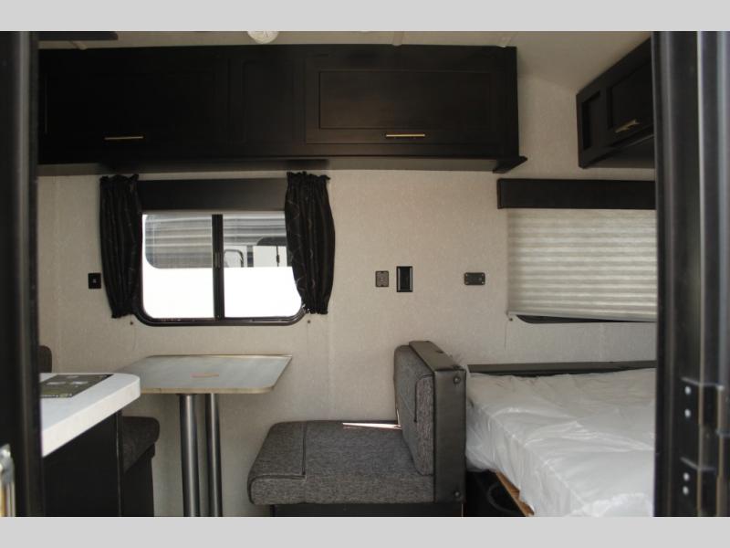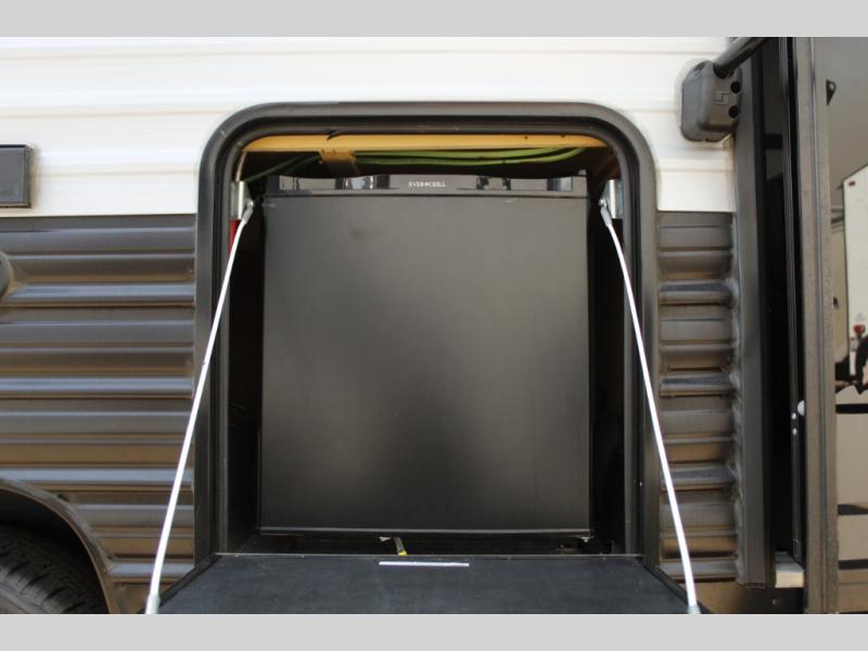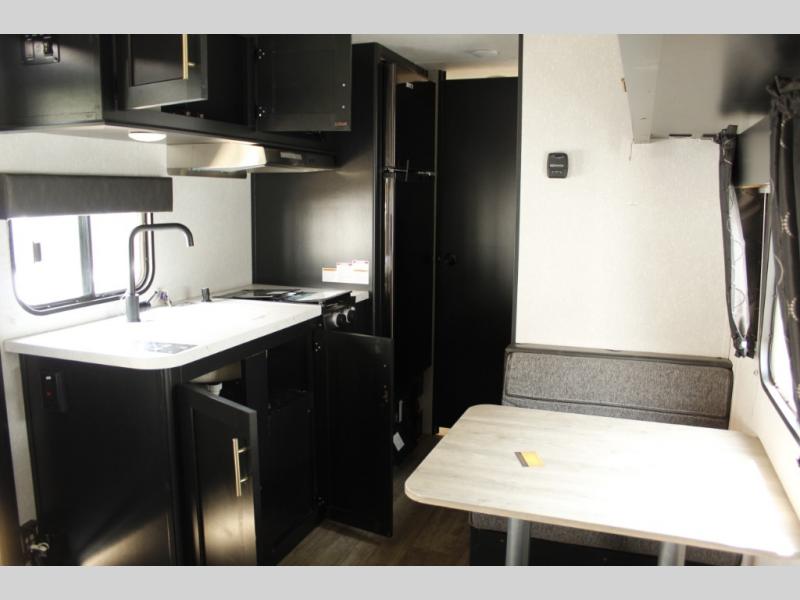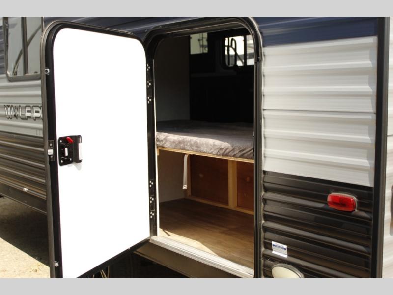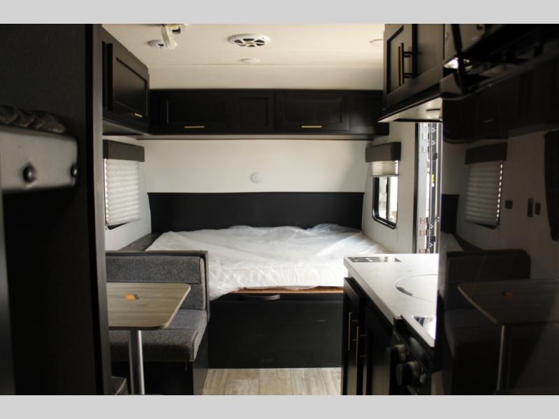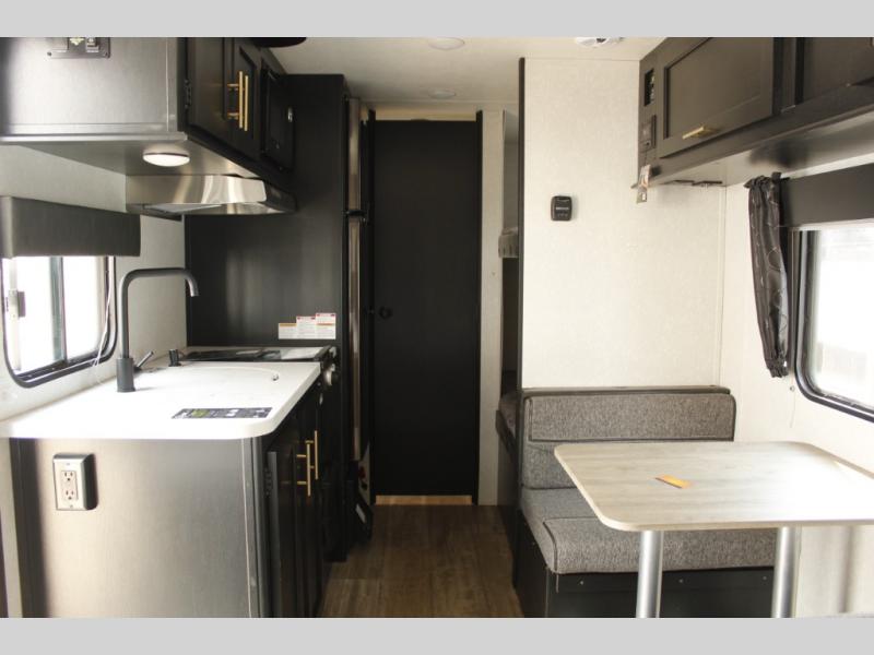 Imagine your kids on the rear bunk beds in this Cherokee Wolf Pup travel trailer while you enjoy the front queen bed before everyone gets up to make breakfast and head out for a hike. The kitchen includes a high-output cooktop and microwave, as well as a refrigerator to store your leftovers and a sink to wash the dishes. You will find storage in the overhead cabinets, and there is a shelf by the queen bed. Your hiking gear can also be stowed out in the outside storage.