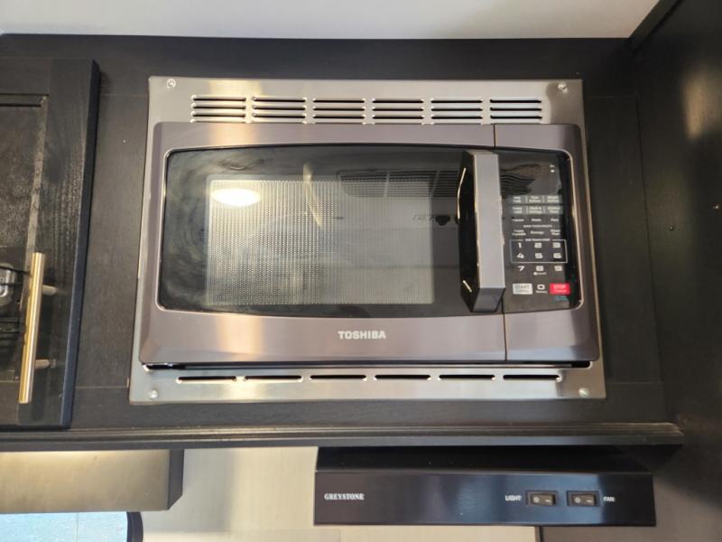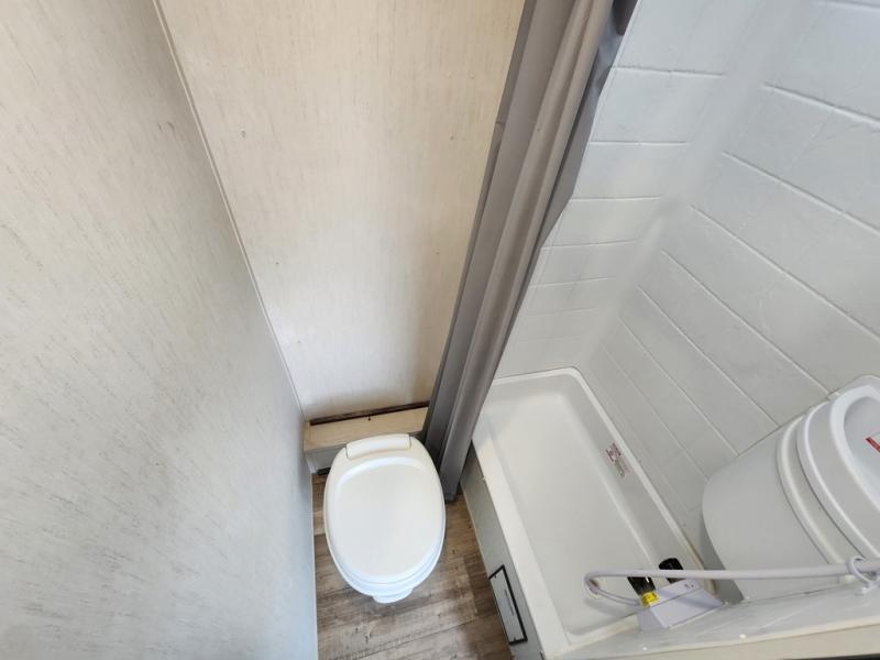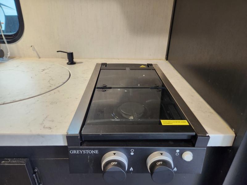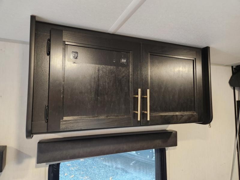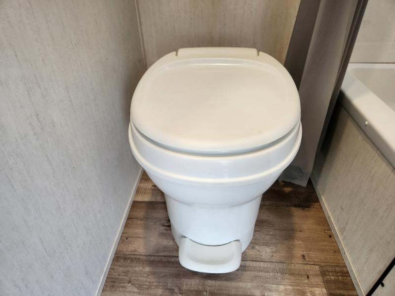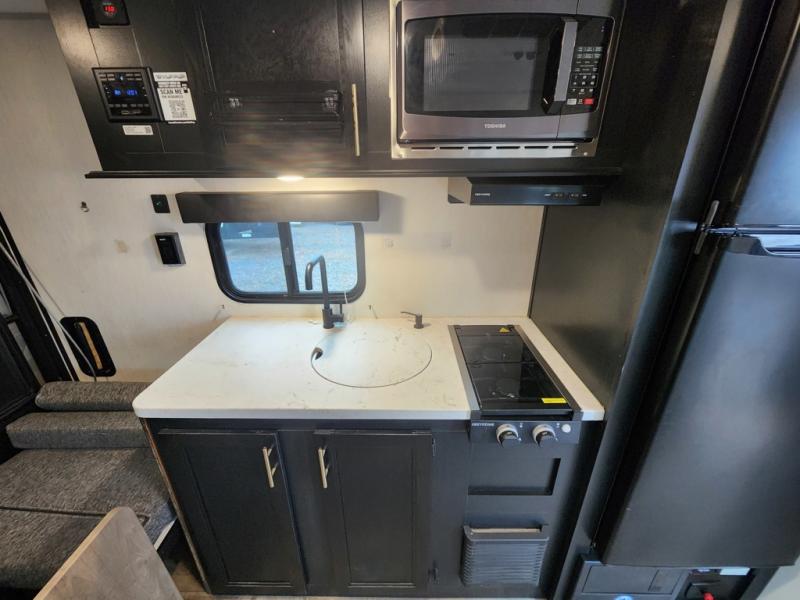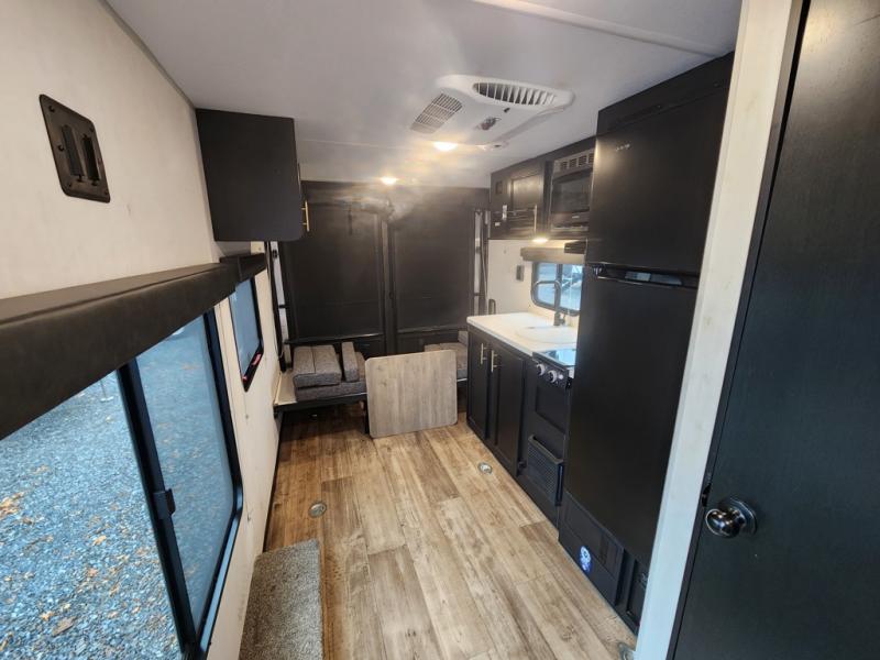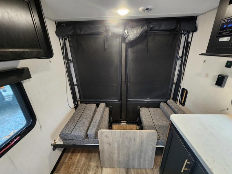 It's time to have fun on your off-road toys away from the daily grind with this Cherokee Wolf Pup toy hauler. You can easily load up your motorcycles through the ramp door, and the main entry door allows you to get to the shelf and overhead cabinets by the bed to stow away your clothing and such. Once at your destination, easily unload your gear to hit the trails and then return to your own hot shower in the private bathroom and your own queen bed in the front of this trailer. If you want a warm meal, the high-output cooktop and microwave are ready for use. There is also a dinette with removable table so that you can sit down inside to eat your meals each night.