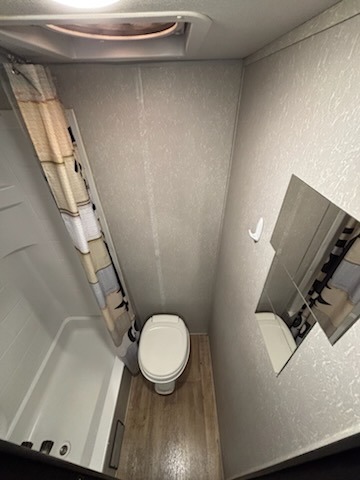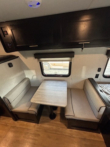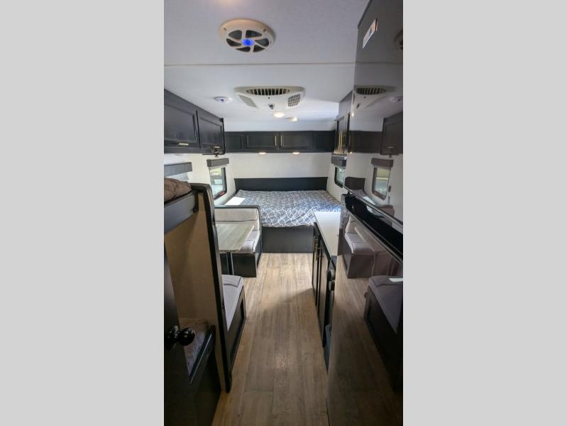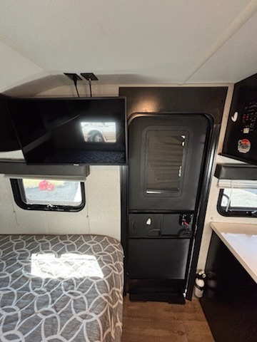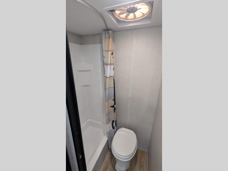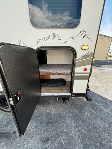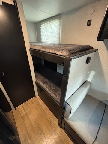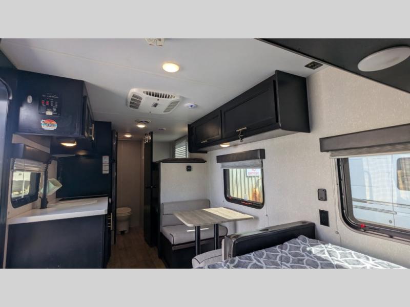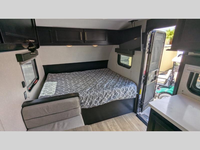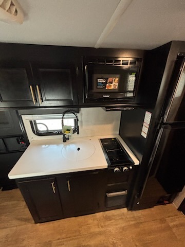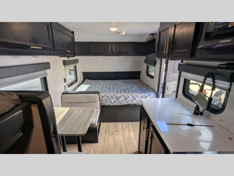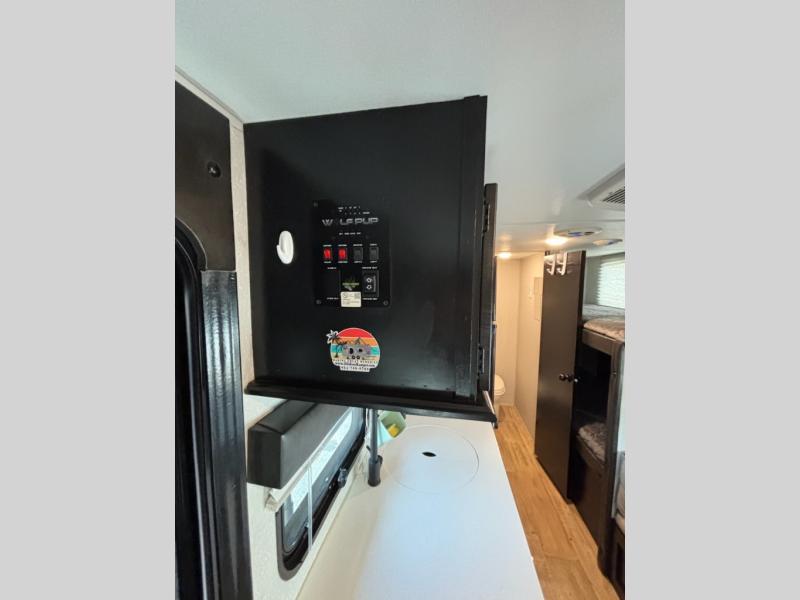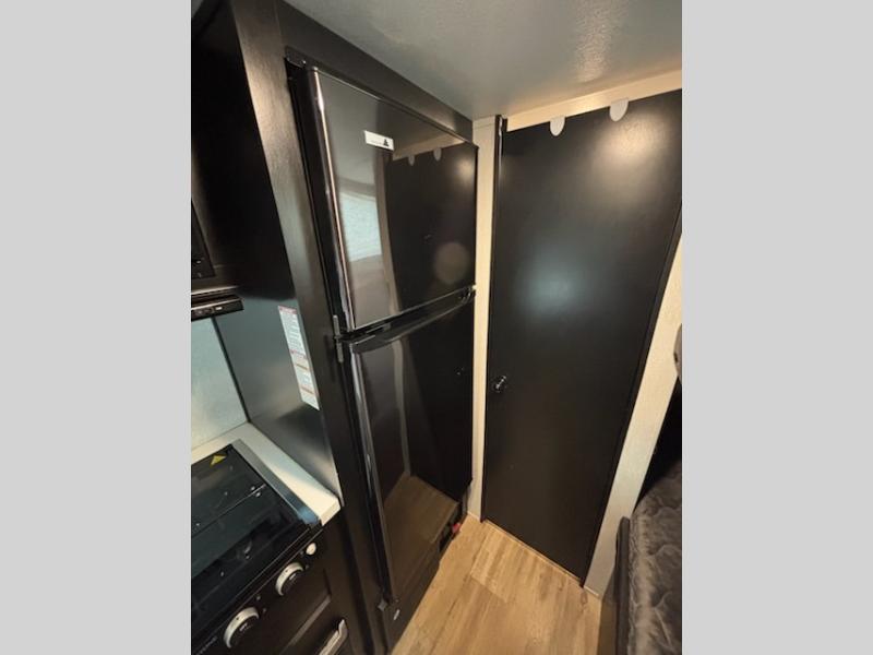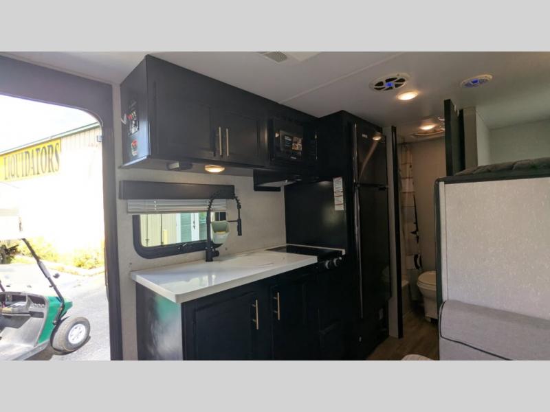 Imagine your kids on the rear bunk beds in this Cherokee Wolf Pup Black Label travel trailer while you enjoy the front queen bed before everyone gets up to make breakfast and head out for a hike. The kitchen includes a cooktop and microwave, as well as an 11-cu. ft. refrigerator to store your leftovers and a sink to wash the dishes. You will find storage in the overhead cabinets, and there is a shelf by the queen pillowtop mattress. Your hiking gear can be stowed in the outside storage or even under the bunks through the storage plus door. Start hiking today!