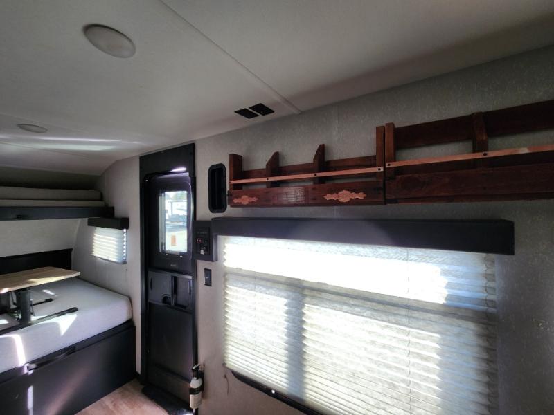 It's time to have fun on your off-road toys away from the daily grind with this Cherokee Wolf Pup Black Label toy hauler. You can easily load up your motorcycles through the ramp door, and the main door allows you to get to the shelf and overhead cabinets by the bed to stow away your clothing and such. Once at your destination, easily unload to hit the trails before returning to your own hot shower in the private bathroom and your own pillowtop queen mattress in front. If you want a warm meal, the cooktop and microwave are ready for use.