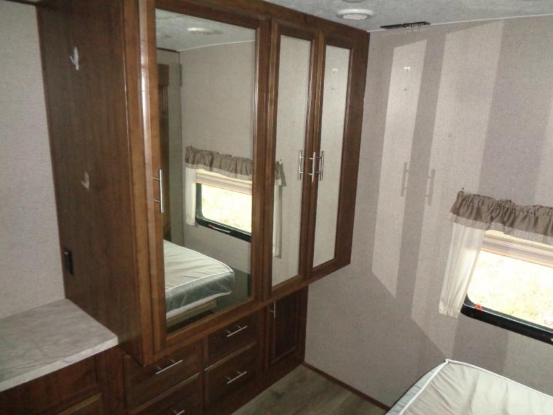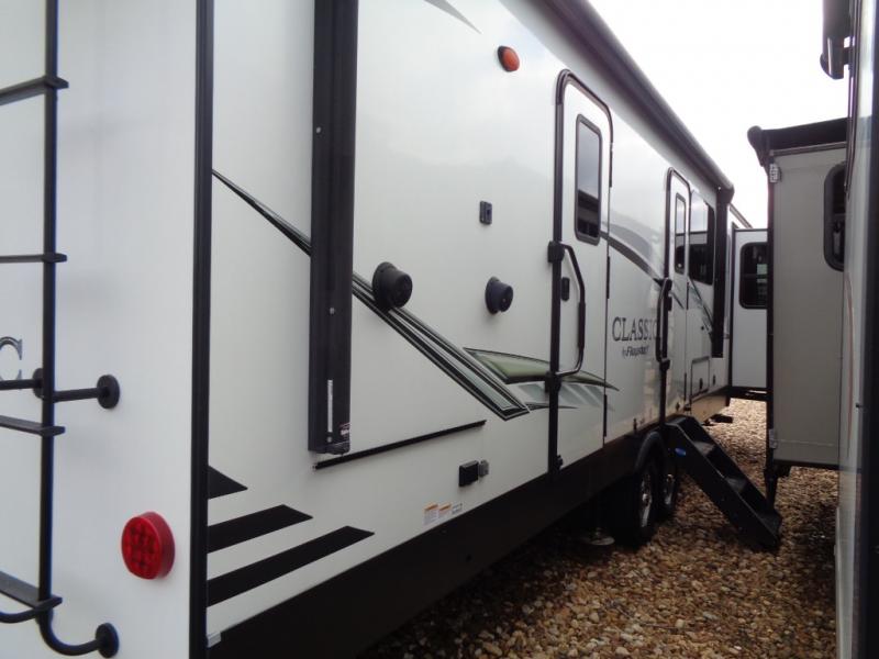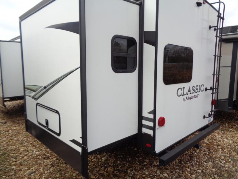 With each Forest River Flagstaff Classic fifth wheel or travel trailer you begin with a fully aluminum frame for lightweight towing, a vacuum laminated one piece roof and walls, an enclosed underbelly to be able to travel all year long, tinted bonded frameless windows for scenic views, and a fiberglass exterior with a high gloss finish. You will feel right at home with the comfortable furniture, the full kitchen amenities with solid surface countertops, the hidden hinge cabinet doors and residential full extension metal soft close drawer guides, plus the spacious interior and generous storage space in every Flagstaff Classic. Make your selection and enjoy the views either outdoors or inside through the many windows!