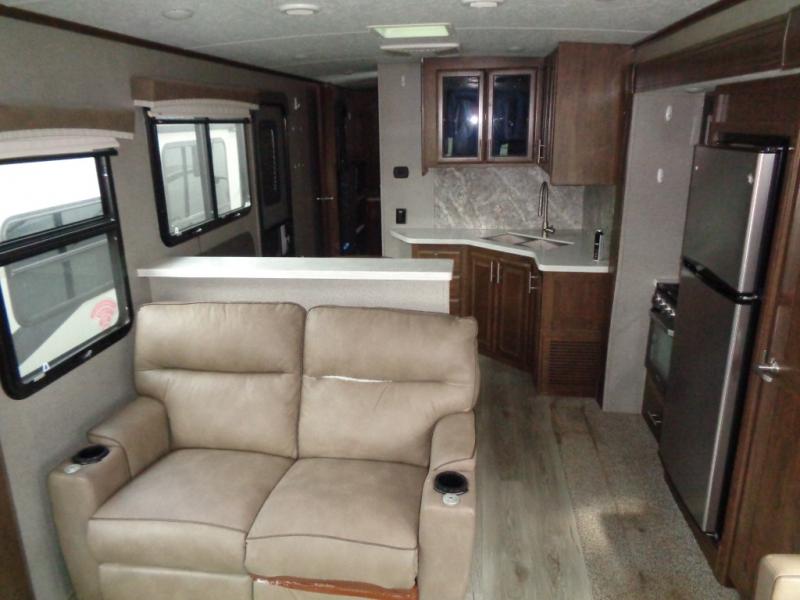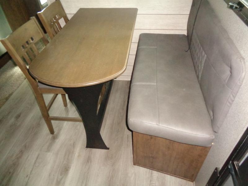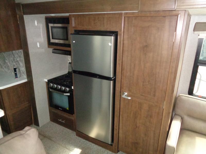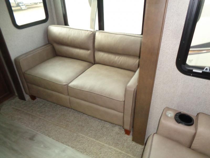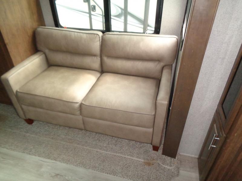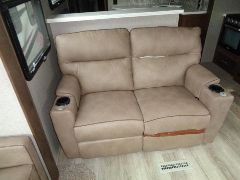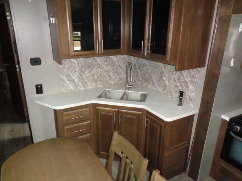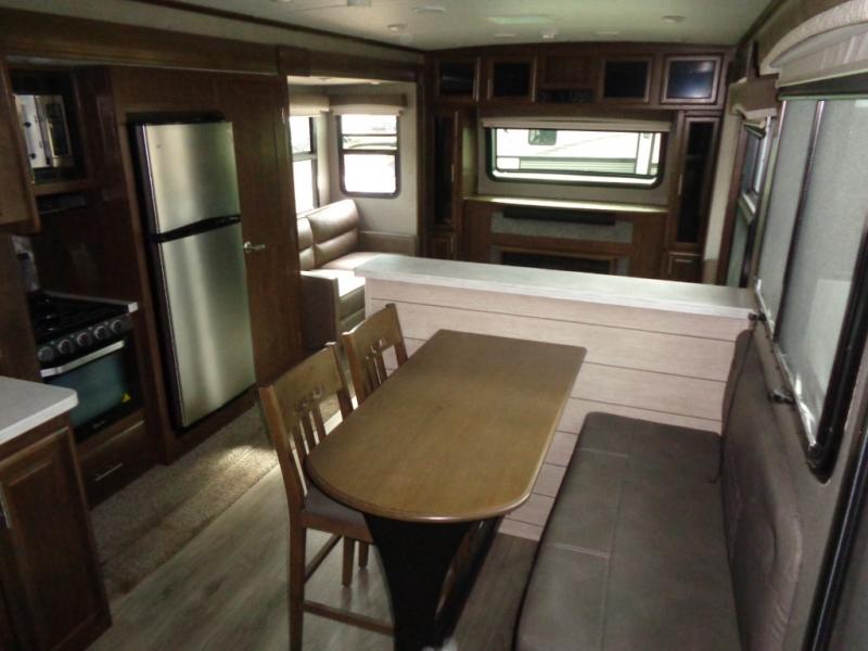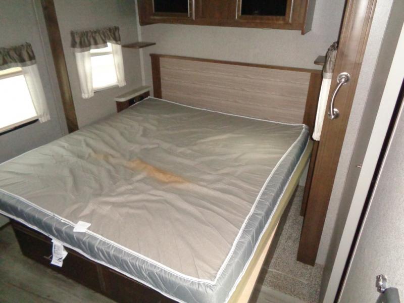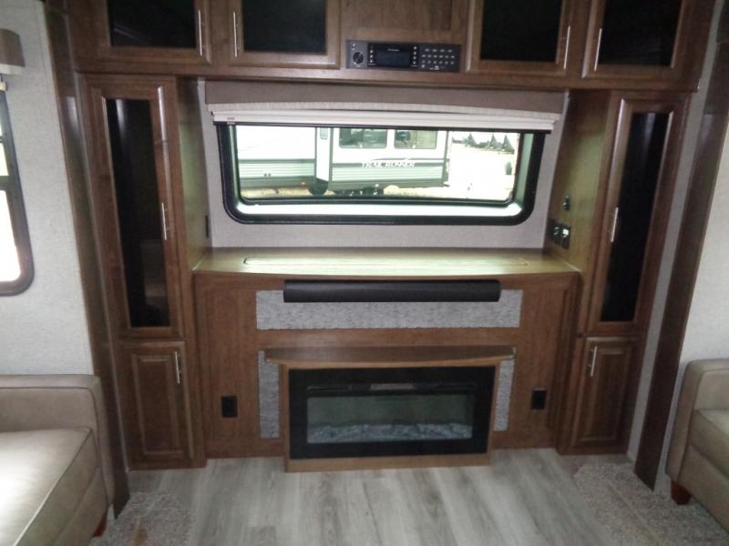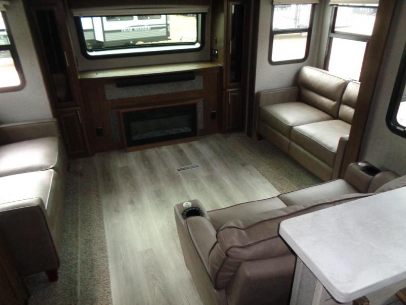 Enjoy your family time outdoors at your favorite state park with the comforts of home inside this trailer. Your kids will love having the front living area to themselves at night with two opposing 60" hide-a-bed sofas, 60" theater seats, an LED TV with entertainment center and a fireplace. The kitchen offers a table with chairs and bench seating on the other side where you can enjoy your morning coffee at, and the kids will find their cereal in the pantry. This model also includes a rear master bedroom with its own exterior entry door, a king bed slide out, and access into the dual entry bath for convenience. There has even been a space prepped so you can add a washer/dryer option if you choose. And the exterior offers more storage, Solid Step entry steps, a 20' power awning, a ladder and a 2" receiver hitch.