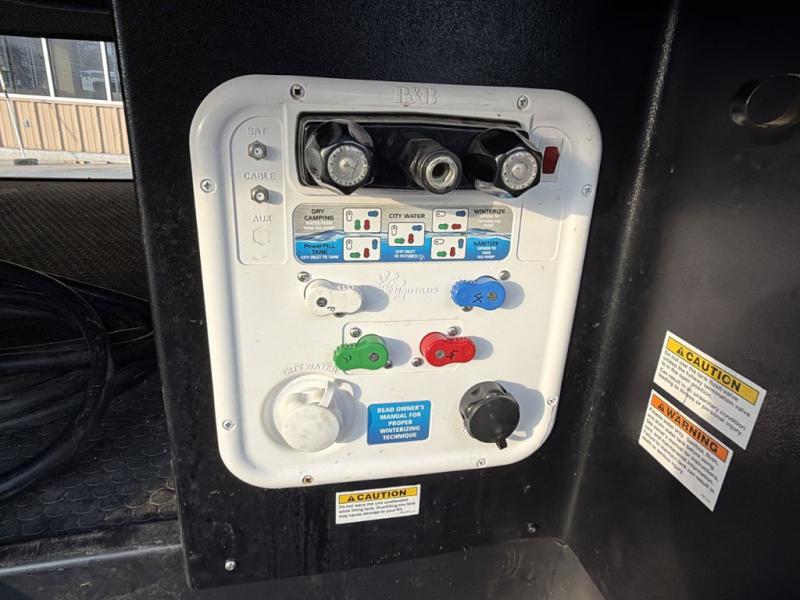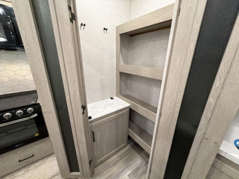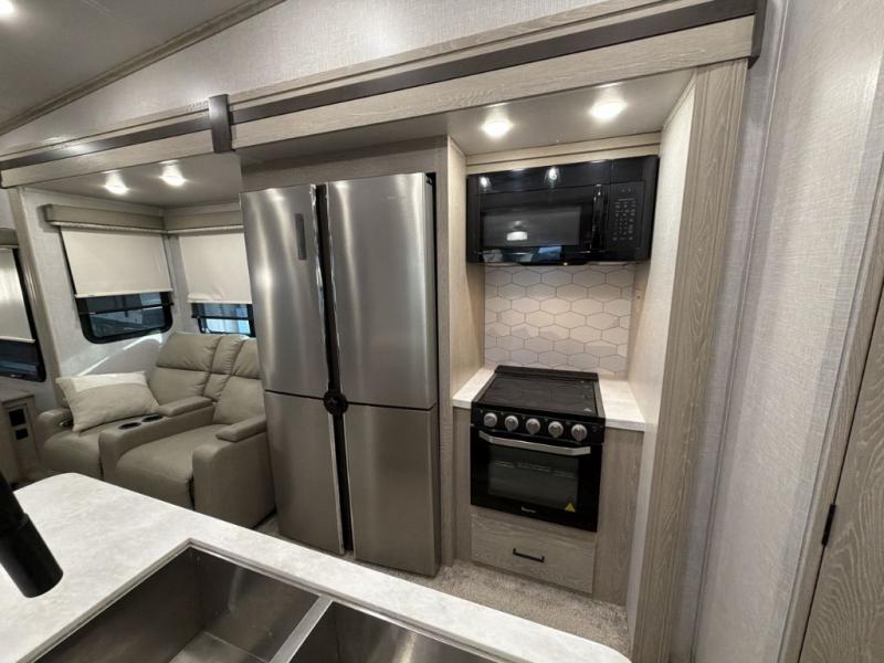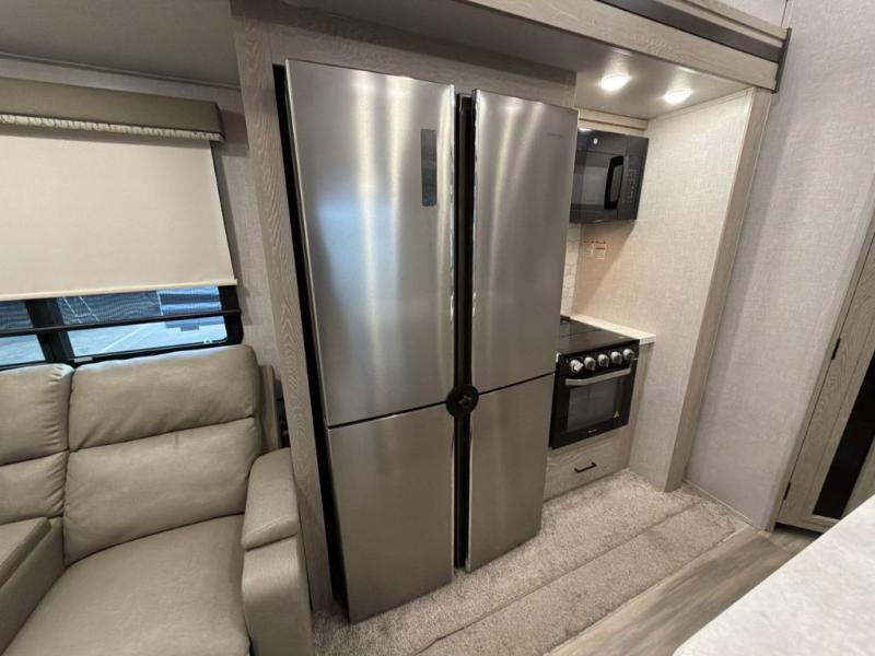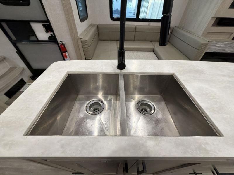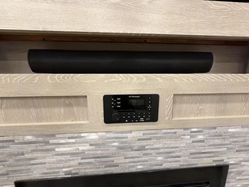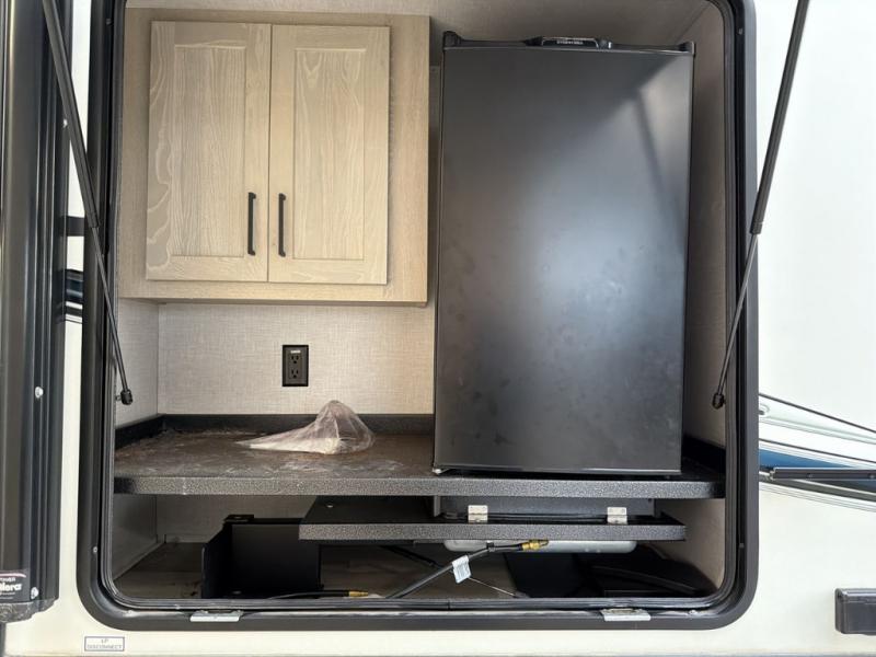 Whether you are traveling full-time or over a few weekends in a year, you and your spouse will enjoy the spacious kitchen and living area with a residential refrigerator and center island, a large rear window, dual opposing slides, and plenty of seating to enjoy the views. You will even have the convenience of cooking on the outside kitchen with a 4 cu. ft. refrigerator to store more beverages. And the large corner walk-in pantry beside the curio offers lots of snack and dry good storage. The 44" x 81" king U-shaped dinette is a great place to enjoy your delicious meals, play some card games, and provides extra sleeping space just like the rear 76" hide-a-bed sofa. What better way to wind down your nights than to relax at the 60" theater seating across from the fireplace while you watch your favorite movie on the LED TV!