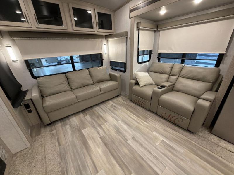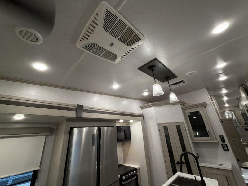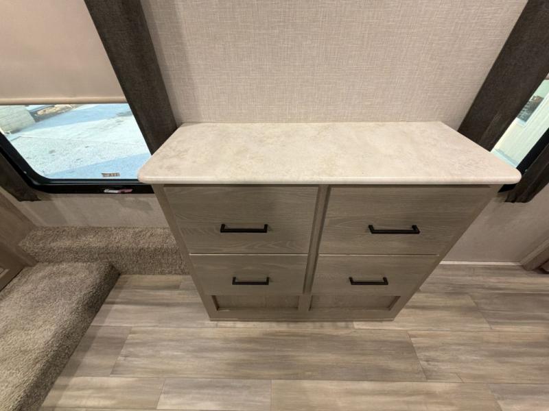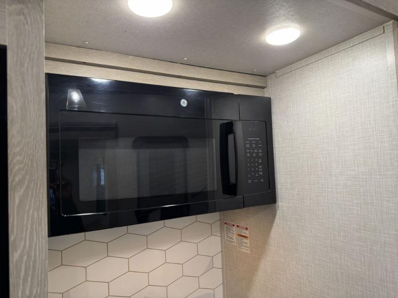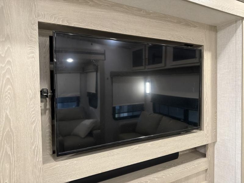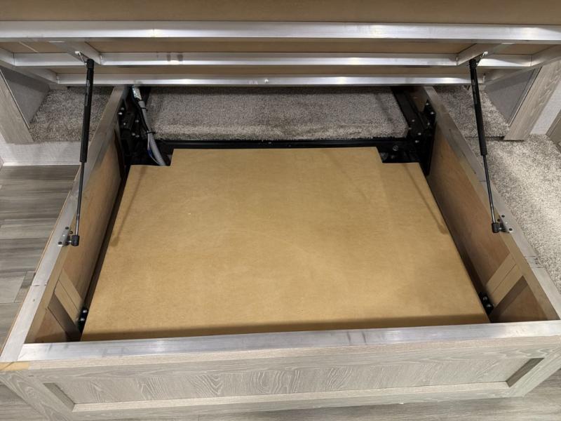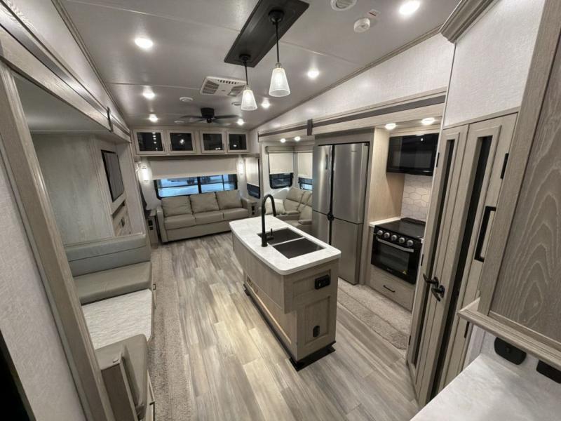 Whether you are traveling full-time or over a few weekends in a year, you and your spouse will enjoy the spacious kitchen and living area with a residential refrigerator and center island, a large rear window, dual opposing slides, and plenty of seating to enjoy the views. You will even have the convenience of cooking on the outside kitchen with a 4 cu. ft. refrigerator to store more beverages. And the large corner walk-in pantry beside the curio offers lots of snack and dry good storage. The 44" x 81" king U-shaped dinette is a great place to enjoy your delicious meals, play some card games, and provides extra sleeping space just like the rear 76" hide-a-bed sofa. What better way to wind down your nights than to relax at the 60" theater seating across from the fireplace while you watch your favorite movie on the LED TV!