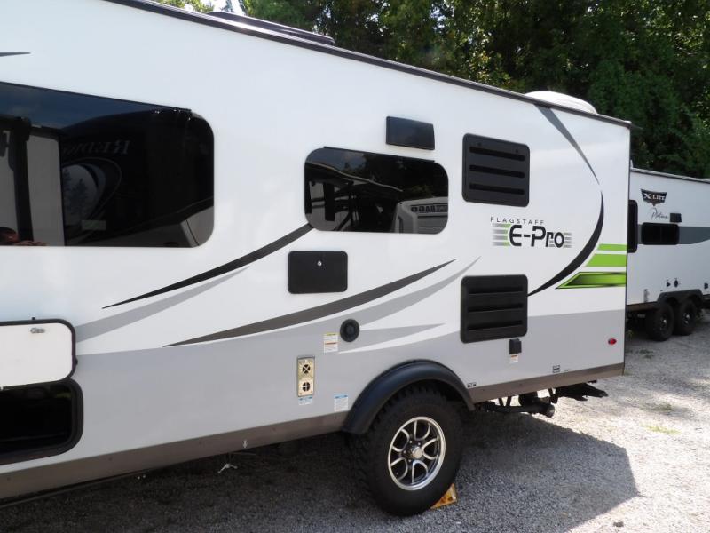 Forest River has custom designed each one of these Flagstaff E-Pro travel trailers and toy haulers to be towed by your fuel-efficient, smaller SUV! They may be light in weight, but they are heavy in features and options. Some of these features include an AM/FM Bluetooth stereo with USB ports to play your favorite tunes, a 190W roof-mount solar panel, and a Shower Miser water saver on most models. Their six-sided aluminum cage construction, frame-mounted stabilizer jacks, and vacuum laminated roof and walls will hold up through every adventure you throw their way. You even get a Sport Tire & Wheel Package which includes 15" Mud Rover radial tires and a lift kit. Come see all that these models have to offer!
