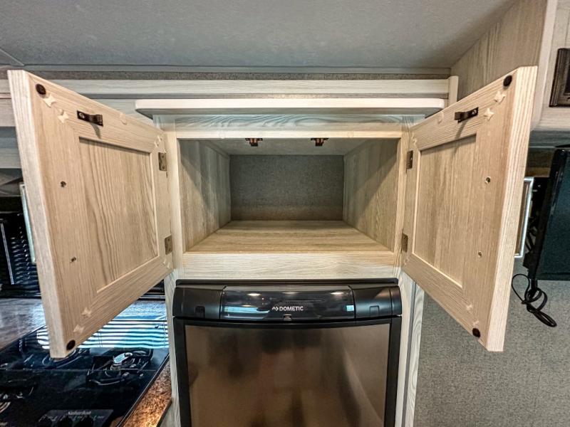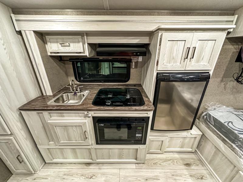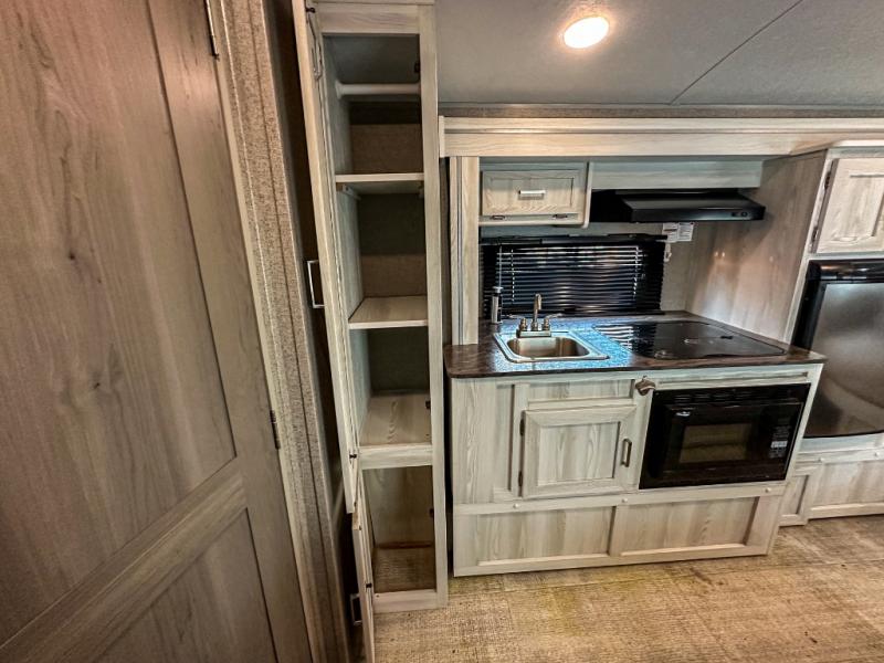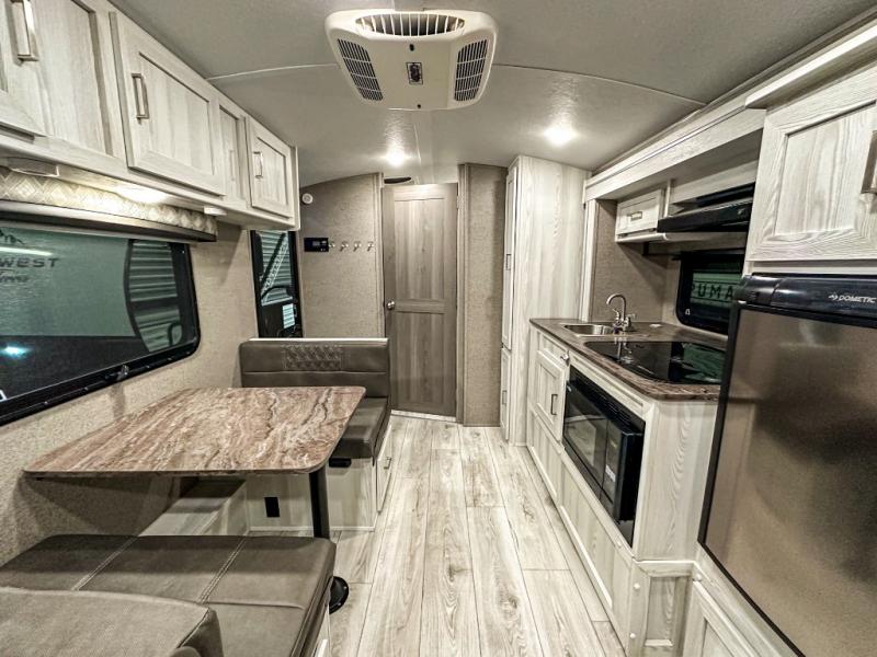 Whether you like to take adventures or relax, this Flagstaff E-Pro travel trailer will be the perfect complement to each of your vacations. You can sleep three people each night with the queen bed and the booth dinette, and you can use the radius shower in the rear full bathroom to freshen up each morning. You will have more interior floor space to move around and cook with the kitchen slide out. If you love to take in as much fresh air as possible, then you will certainly love having an outdoor gas griddle when making meals and relaxing under the 11' power awning.