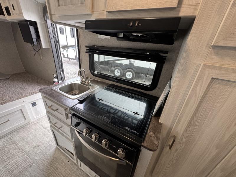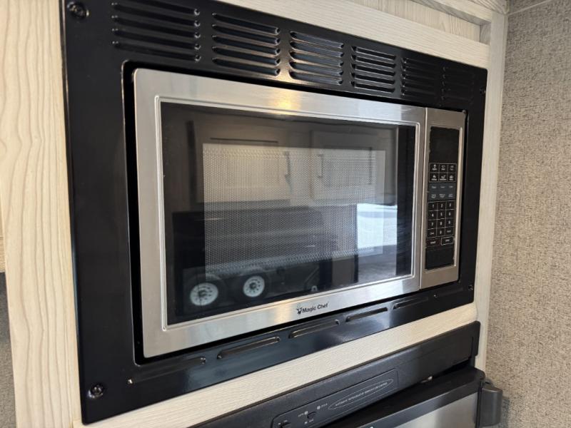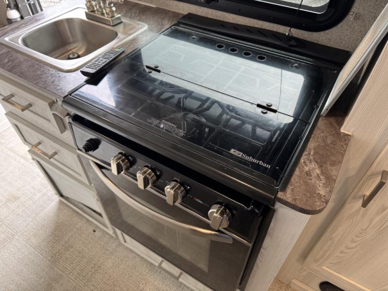 Cook up your favorite camp meal on the three-burner cooktop, in the microwave, or on the outdoor griddle with this Flagstaff E-Pro travel trailer. You can eat at the 52" x 82" booth dinette or under the 13' power awning which provides protection for an outdoor living area. The dinette also doubles as extra sleeping space for two and includes overhead storage for your things. You can stay clean having a full bathroom, watch a movie on the 12V TV with DVD player, and even grab a snack from the 12V refrigerator.
