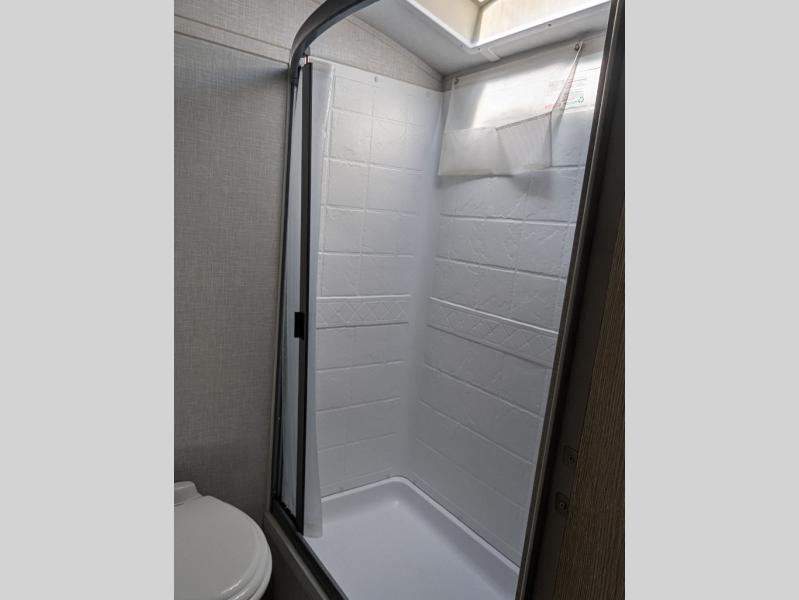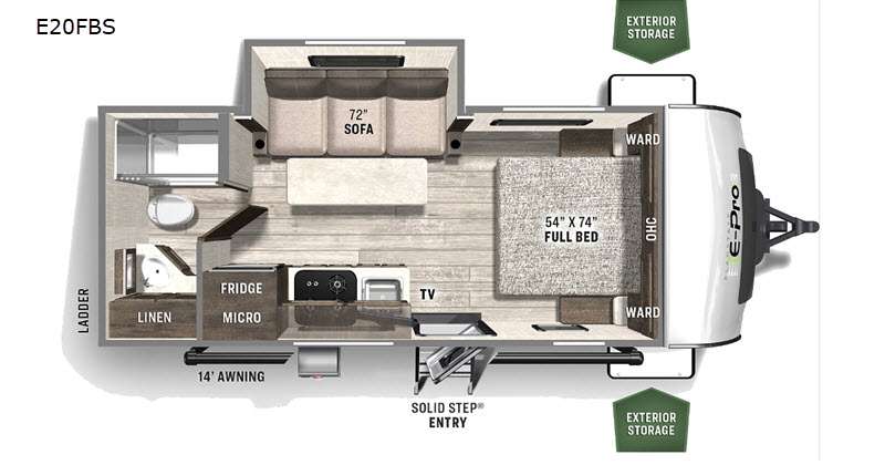 Forest River heard your comments and gave you what you want with this Flagstaff E-Pro travel trailer! One thing the public asked for was a full walk-around bed, and that is exactly what you will find up front. Plus, there are wardrobes on either side of the bed. The full rear bathroom has an oversized shower for you to freshen up in each morning and a linen closet close by to store your towels. The 72" sofa has a table for you to enjoy your meals, and it is conveniently across from the 12V TV for easy viewing. The sofa can also transform into a bed so that you can bring an extra guest along. A few exterior refinements include an outside griddle, a 14' power awning, and a front exterior storage area to keep your camping gear!