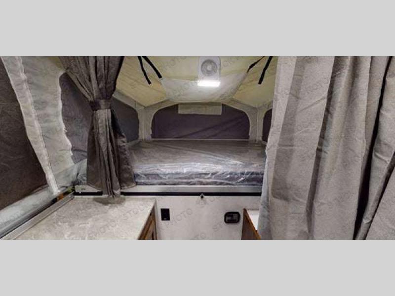 With any Forest River Flagstaff High Wall folding pop-up, the tent camper construction includes a fiberglass vacuum bonded radius roof with no center seam, five-piece Vinylon supreme tenting, EZ crank down stabilizer jacks with sand pads and full perimeter aluminum bed frames to mention a few features all on a powder coated tubular steel frame. More standard features include ProRac roof mounted cross bars with optional bike and kayak carrier attachments, solar prep on the frame, an outside shower to clean off the dirt from your shoes and toys, and a MORryde step. The indoors offers comfortable sleeping arrangements on the heated mattress on the tent bunk ends, raised panel cabinet doors, two bed end lights with a fan, privacy curtains with valances, and upgraded appliances. Make your lightweight camper selection today and start camping large!