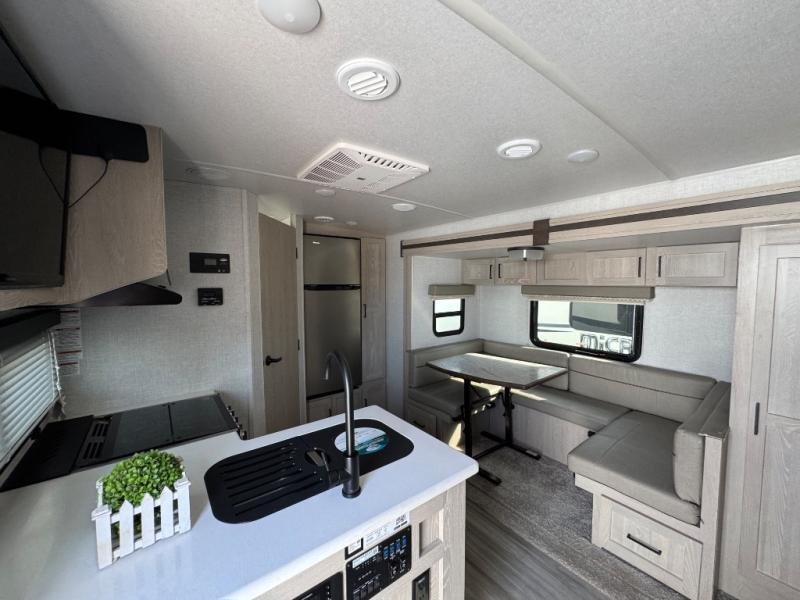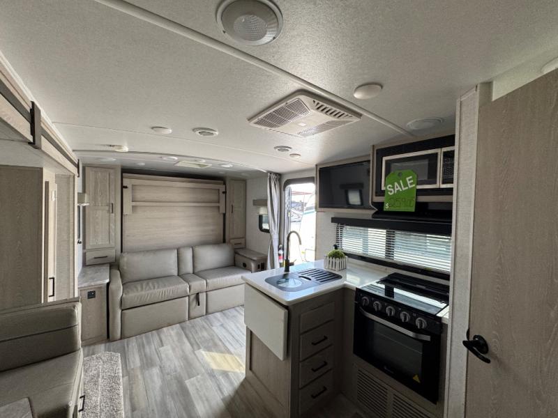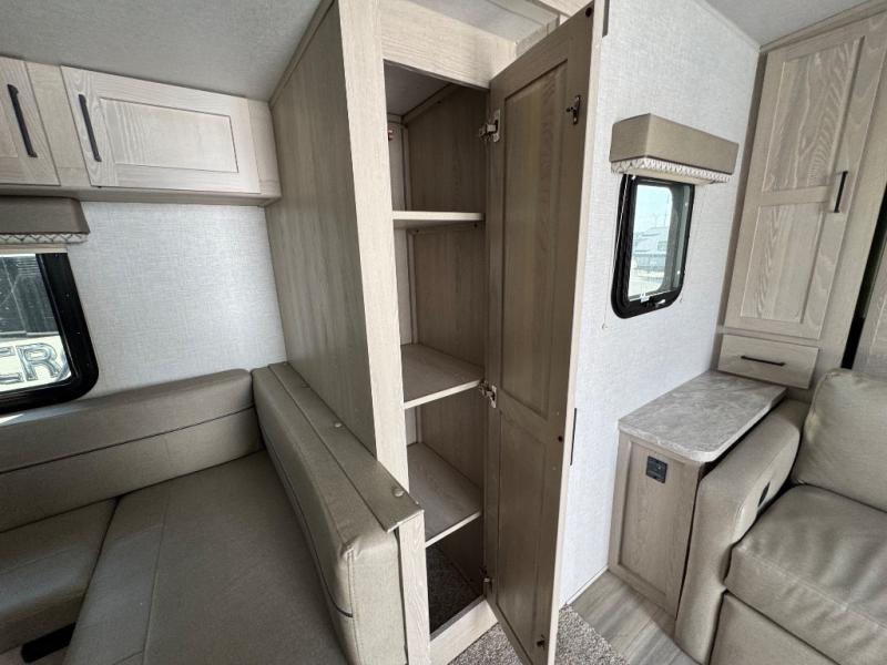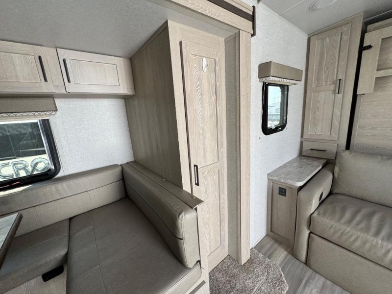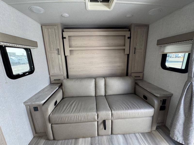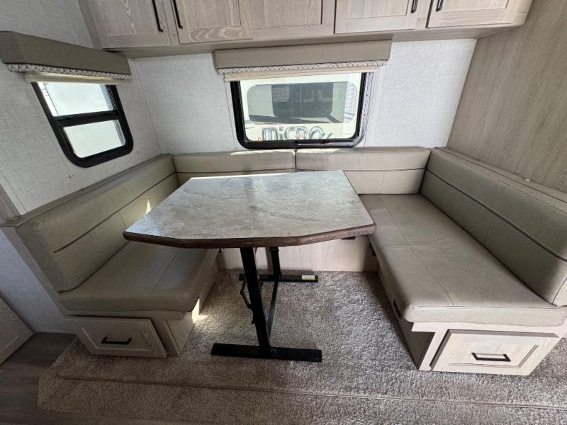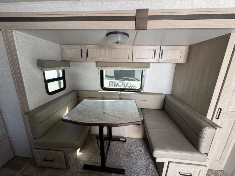 Pack your bags and get ready for your next camping trip with this Flagstaff Micro Lite travel trailer. You will enjoy the space the single slide provides, and within the slide is a U-shaped dinette where you can enjoy your meals. Fold out the Murphy bed each night for a good night's rest, and in the morning you can fold it away and enjoy a cup of coffee on the sofa. This unit features a kitchen with a three-burner cooktop and microwave, and you'll appreciate a pantry for snacks. Bring along the extra lawn chairs in the pass-through storage, and there is also an exterior storage for your luggage or tackle boxes
