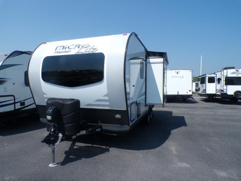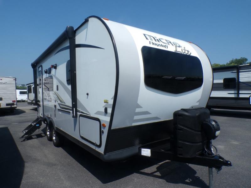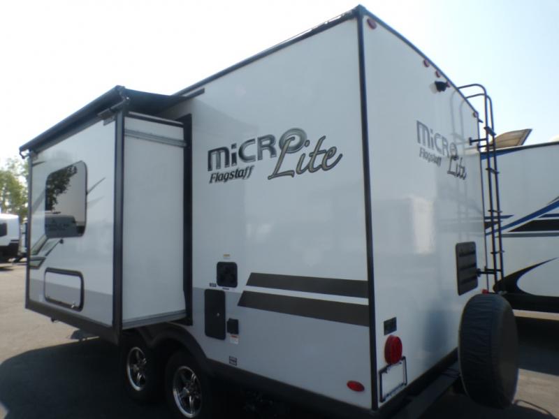 The Forest River Flagstaff Micro Lite travel trailer gives you the freedom to tow with your SUV or Minivan! Even though these trailers are lightweight, they still pack a punch when it comes to accommodating features and comfortable amenities. The Flagstaff Micro Lite has an enclosed underbelly, four frame-mounted stabilizer jacks, Torsion Axle, Rubber-Ryde suspension, a fully aluminum frame, and a lower front diamond plate panel. With its Teton All In One WiFi Booster/LTE prep, multi-zone stereo with DVD/CD/AM/FM/Bluetooth, MP3 player hook-up, and TV antenna with cable and satellite hook-up, you'll have plenty of modern technology to keep you occupied while you're away. Some other features that will make trips easier are the power awning with adjustable rain dump and LED lighting, the outside shower, an outside antifreeze station, and the 2" hitch receiver.