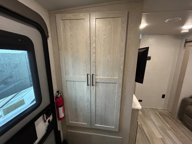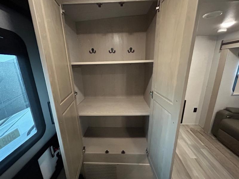 This Flagstaff Micro Lite travel trailer is going to make your camping dreams come true! With a queen bed slide and large wardrobe in the private bedroom, you will have all that you need for sleeping and storing your belongings. Plus, the second exterior entry door leads right into the bedroom so that you can escape for an early morning run without running through the entire trailer to get outside. The front kitchen is open and accommodating with its helpful tools, and the 67" theater seat is right next to the double-door refrigerator on the slide out. Right next to the front entry door is a coat closet so that you can keep your jackets readily available, and there is also a linen closet in the walk-through bath so that you can keep your towels ready for your shower.