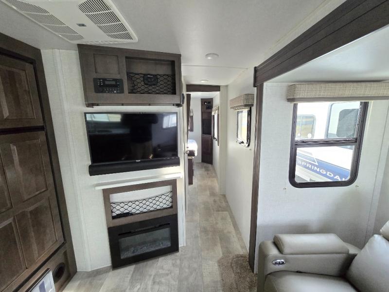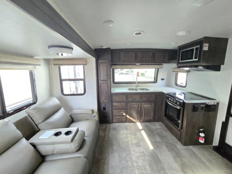 You're going to love this Flagstaff Micro Lite travel trailer with a front kitchen and a rear private bedroom. With sleeping space on the large U-shaped dinette or the RV queen bed, you can comfortably sleep four in this unit. The single slide with the U-shaped dinette opens up the living area and provides extra room in the front kitchen to cook your family dinners. You'll appreciate the pantry, as well as the ample counter space to prep your meals. Enjoy your evenings in front of the fireplace, or turn on the LED TV to make it a movie night with popcorn and snacks. This model also includes a pull-out grill for breakfast outside!
