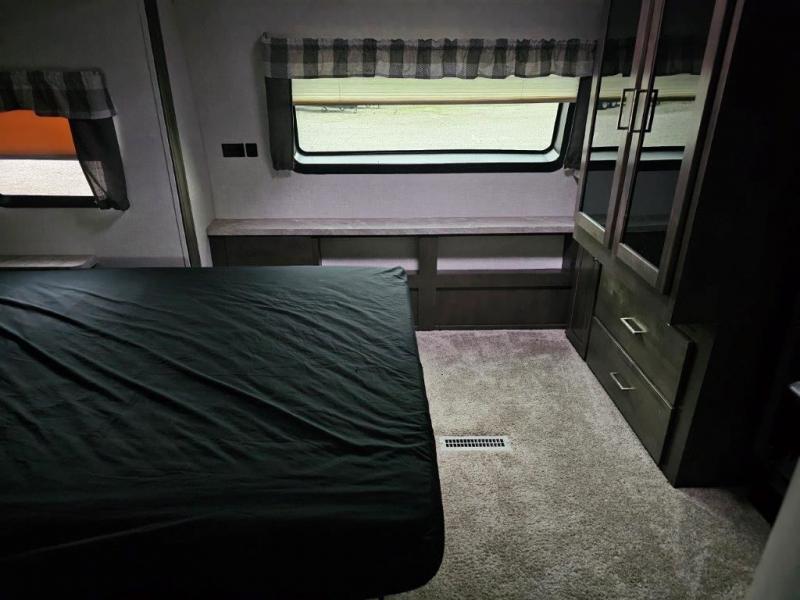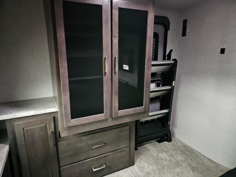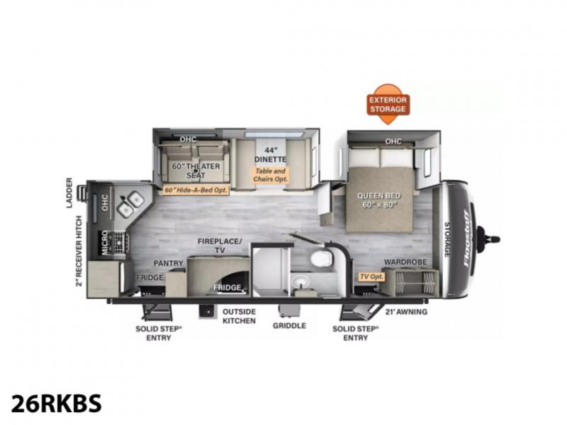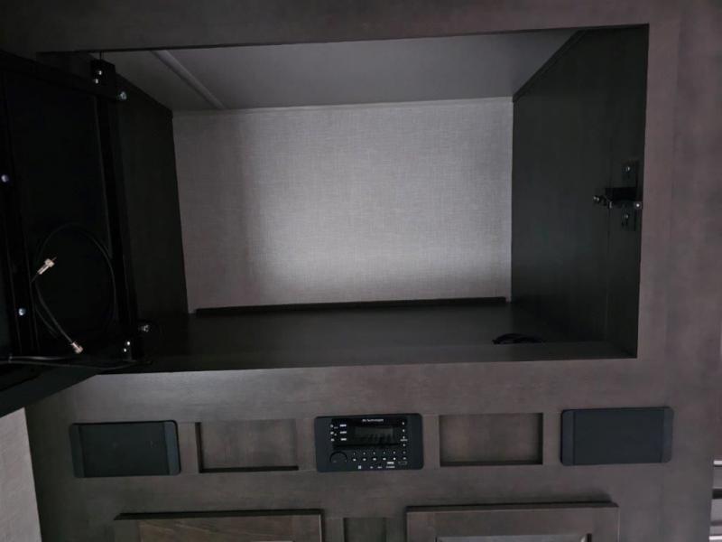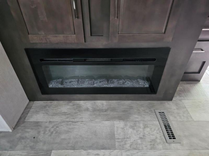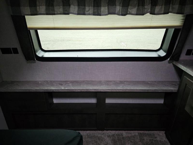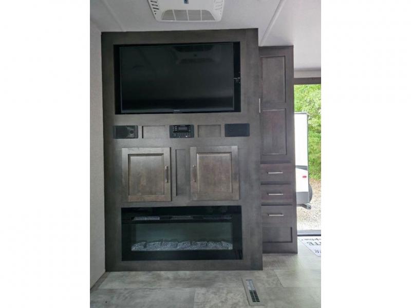 You and your spouse will enjoy your own bedroom up front with a space savings door, a slide out queen bed, a wardrobe, a front wall countertop with storage below and the second entry/exit door into the trailer. You won't have to go through the rear kitchen to exit the trailer for a morning walk or to relax under the power awning. You might like to make breakfast outside on the outdoor kitchen on occasion, yet if it's chilly head back inside to all the appliances needed to make a warm meal. Many nights you can watch the LED TV and enjoy the fireplace while relaxing on the 60" hide-a-bed sofa or 44" booth dinette slide or hangout outside under the 21' power awning.