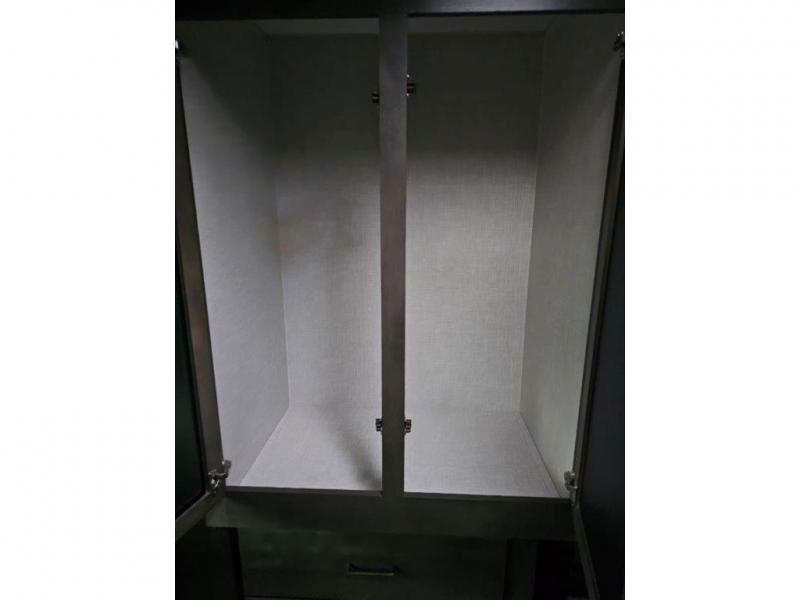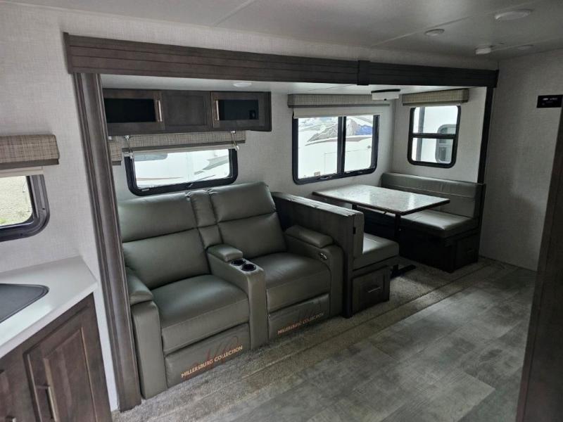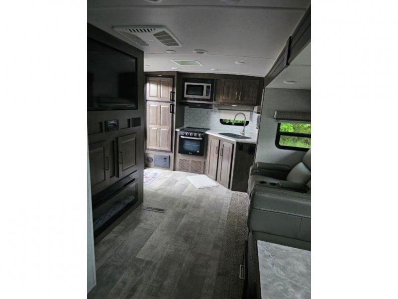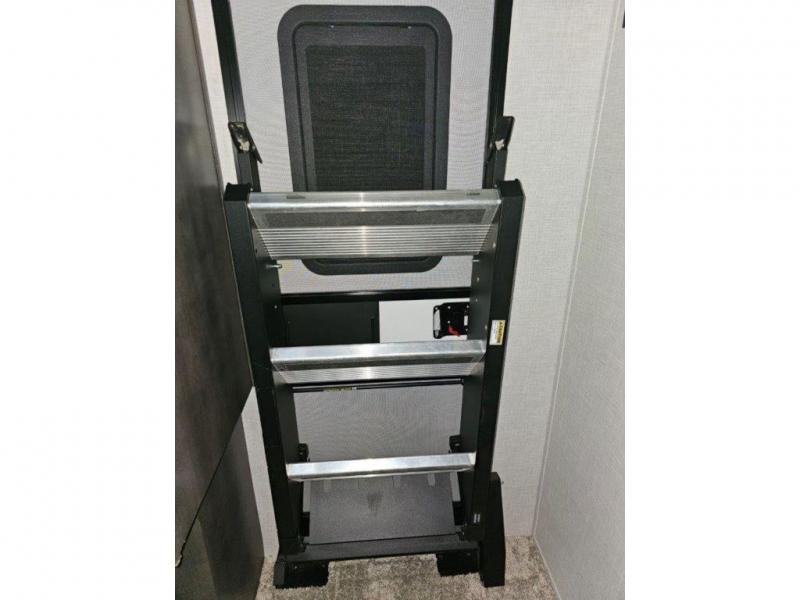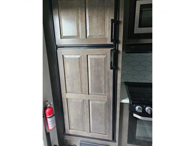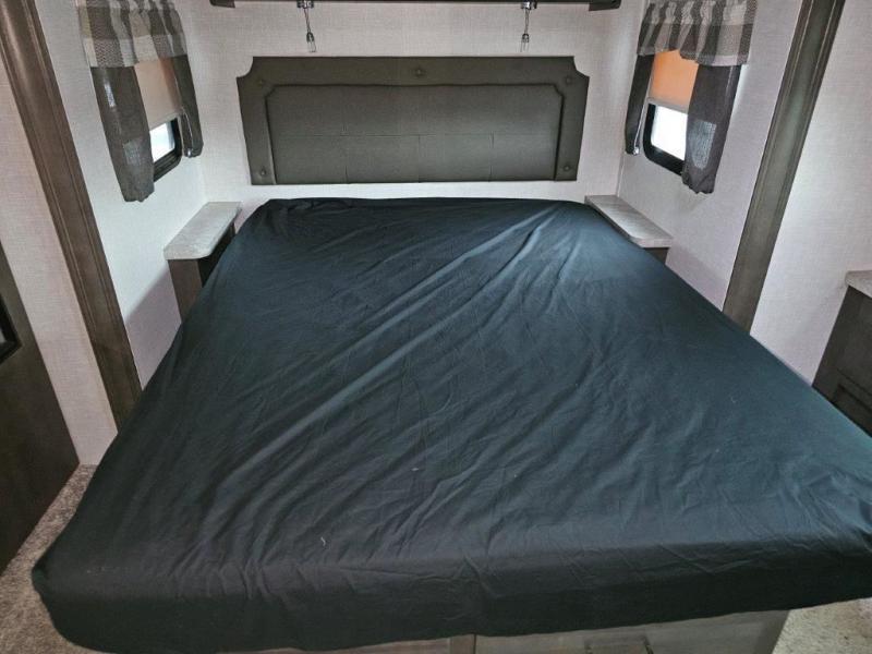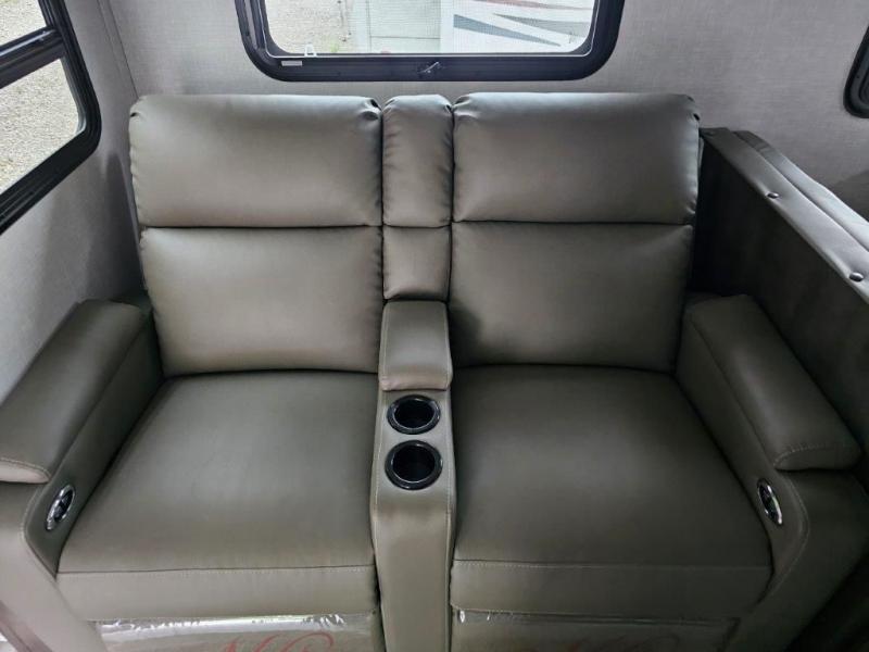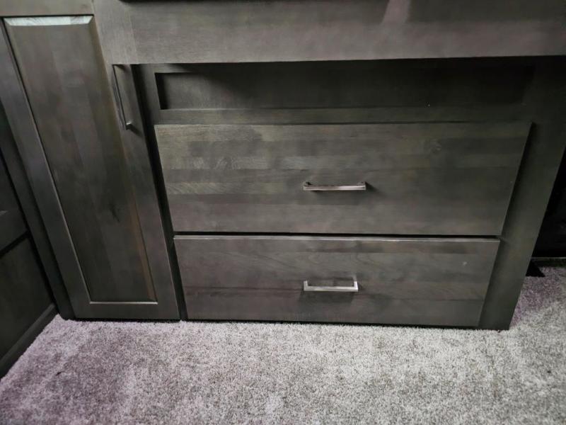You and your spouse will enjoy your own bedroom up front with a space savings door, a slide out queen bed, a wardrobe, a front wall countertop with storage below and the second entry/exit door into the trailer. You won't have to go through the rear kitchen to exit the trailer for a morning walk or to relax under the power awning. You might like to make breakfast outside on the outdoor kitchen on occasion, yet if it's chilly head back inside to all the appliances needed to make a warm meal. Many nights you can watch the LED TV and enjoy the fireplace while relaxing on the 60" hide-a-bed sofa or 44" booth dinette slide or hangout outside under the 21' power awning.
