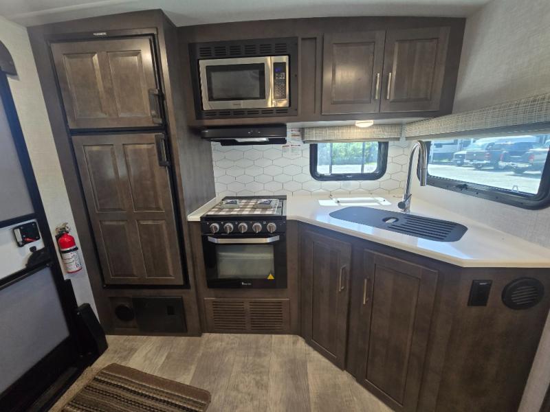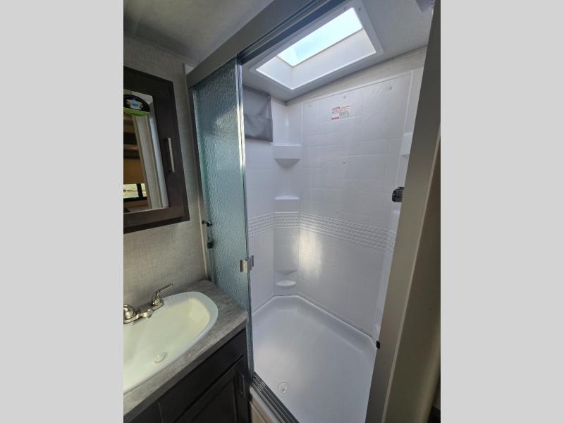 With any Flagstaff Super Lite travel trailer by Forest River you will experience a lightweight RV that is built with a 6 sided aluminum cage construction, vacuum laminated one-piece roof and walls, laminated fiberglass sidewalls, and an enclosed underbelly for four seasons of camping. The interior is just as impressive with a Shower Miser water saver system, hardwood cabinet doors and drawers, undermount double bowl kitchen sink with a residential style faucet, ceiling LED 12 volt interior lighting, and a monitor panel switch station with a OneControl app. Make your selection today!