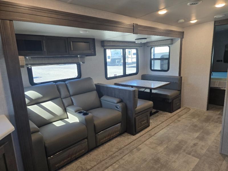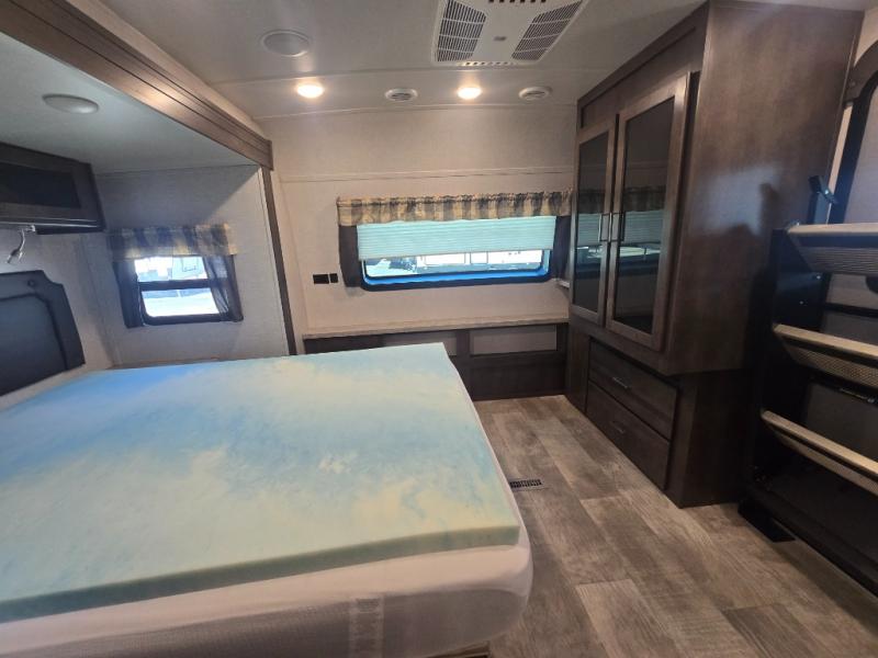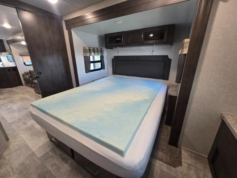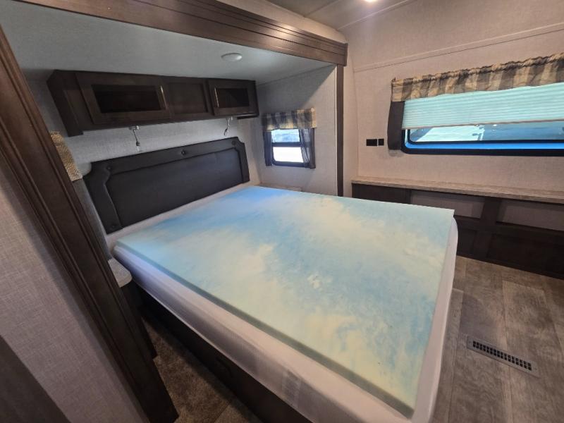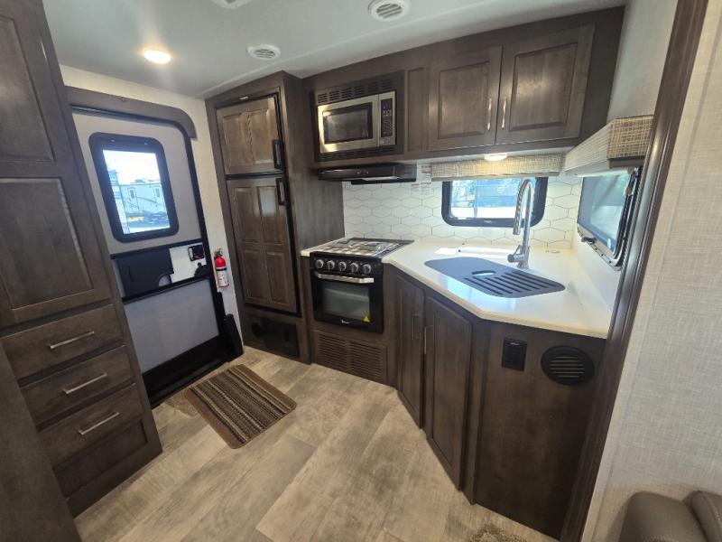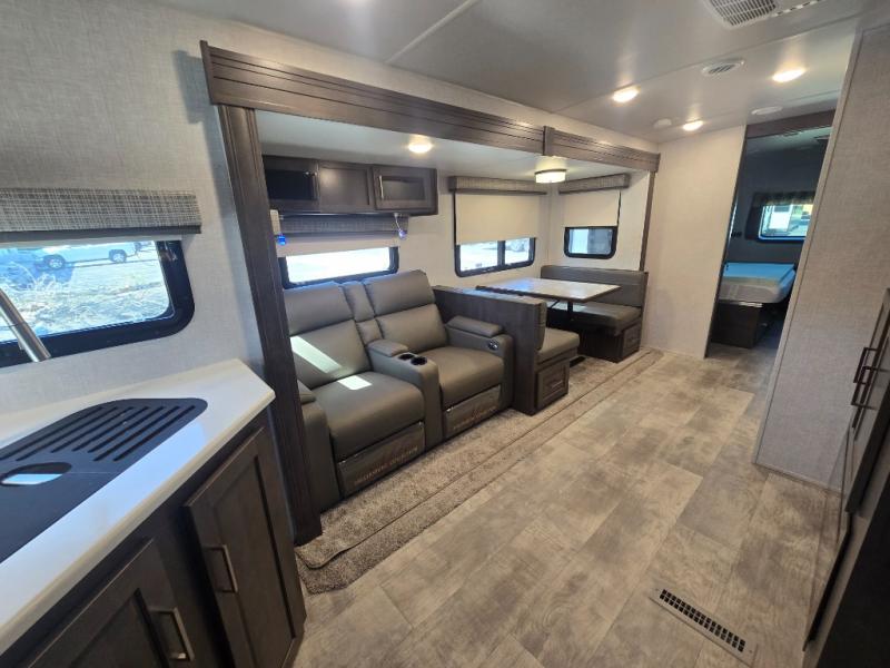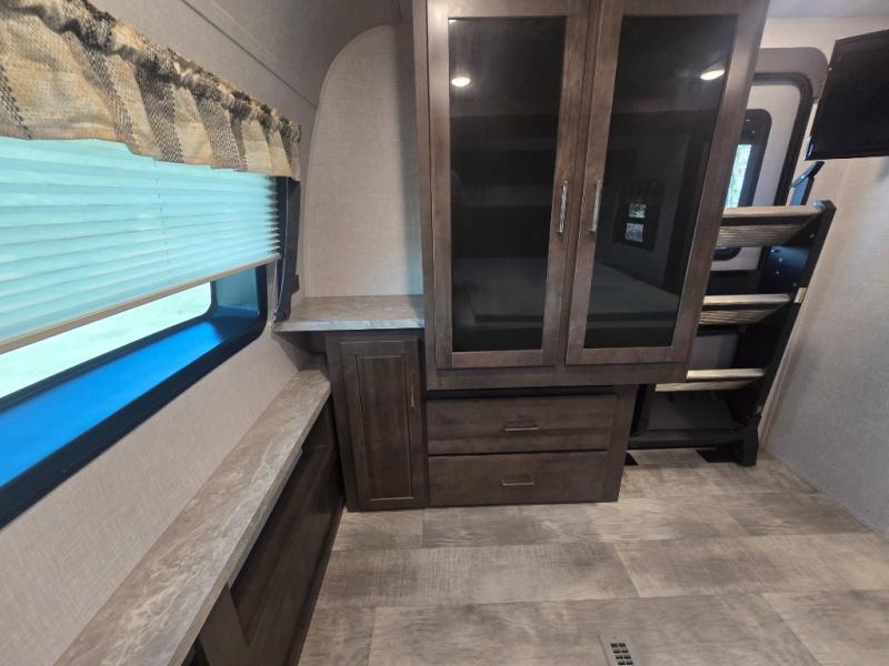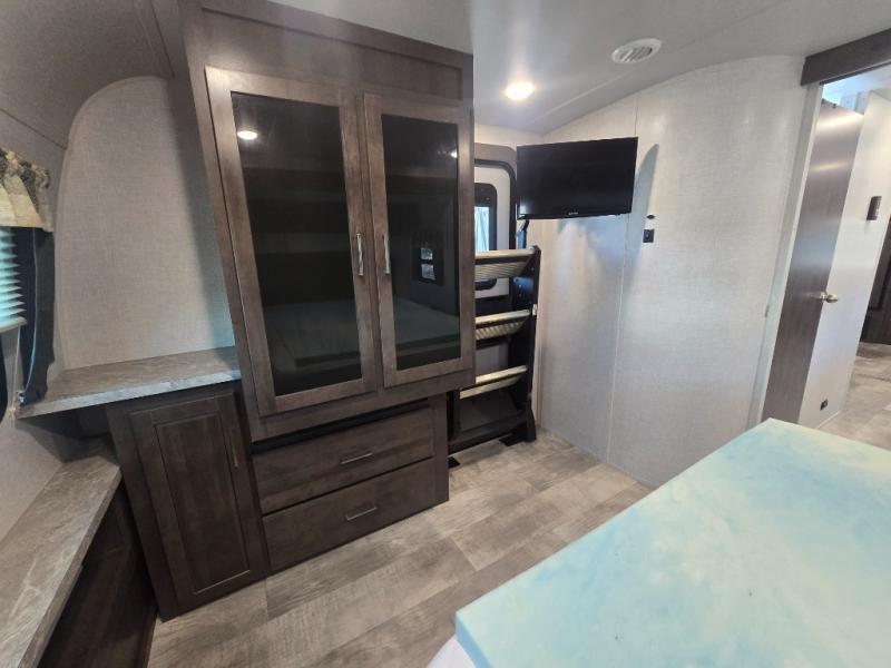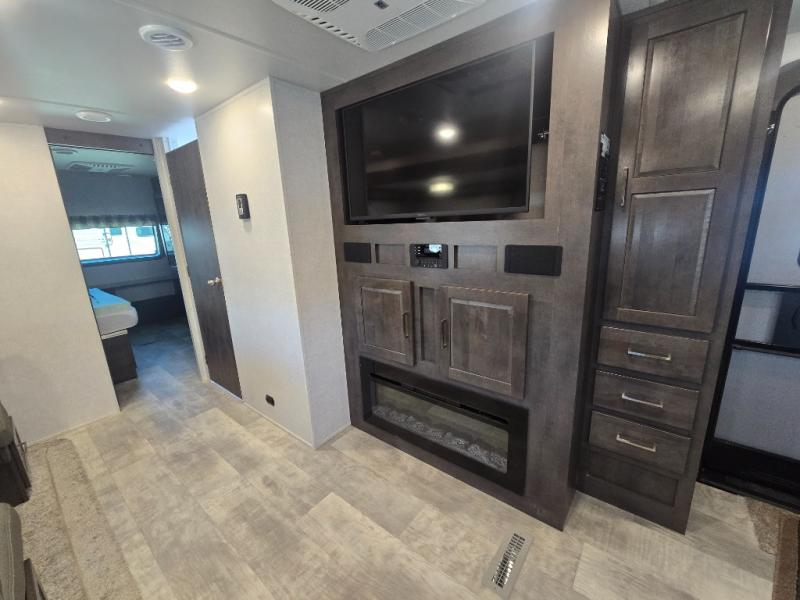 You and your spouse will enjoy your own bedroom up front with a space savings door, a slide out queen bed, a wardrobe, a front wall countertop with storage below and the second entry/exit door into the trailer. You won't have to go through the rear kitchen to exit the trailer for a morning walk or to relax under the power awning. You might like to make breakfast outside on the outdoor kitchen on occasion, yet if it's chilly head back inside to all the appliances needed to make a warm meal. Many nights you can watch the LED TV and enjoy the fireplace while relaxing on the 60" hide-a-bed sofa or 44" booth dinette slide or hangout outside under the 21' power awning.