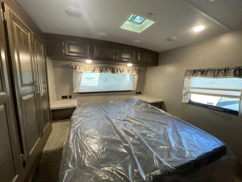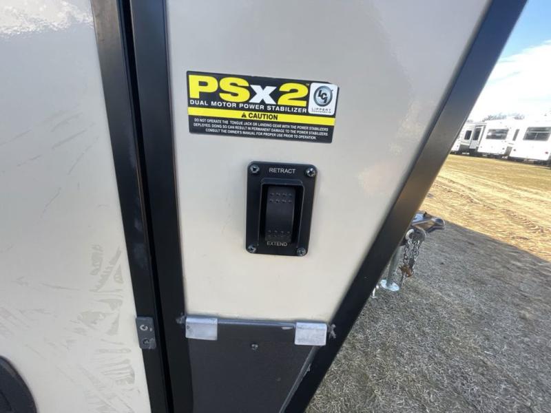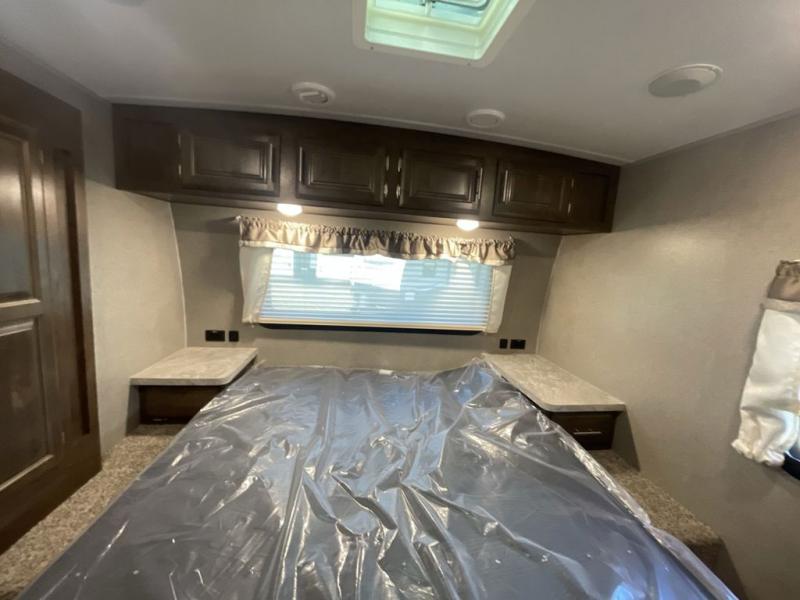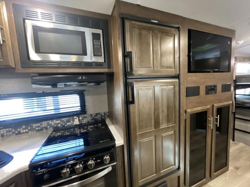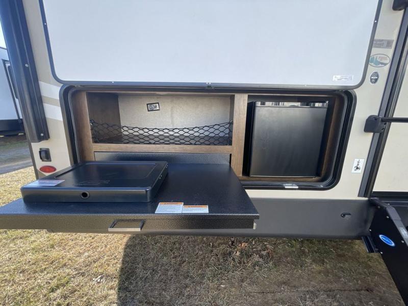 Camping just got a lot more comfortable with your family with your own walk-around queen bed, a slide out wardrobe and the second entry/exit into the front private bedroom. You might even like to add the TV option. The kids will have their own double size bunks to sleep on and the full bathroom is conveniently located a few steps away making those nighttime trips easier for them. You will soon find out that having dual entry doors keeps the flow of traffic moving especially when loading and unloading. You can cook inside with full amenities and store your cold food in the double door refrigerator, and/or cook outdoors using the outside kitchen with fridge. And you will find plenty of storage throughout the interior for everyone's things and along the exterior including in the drop frame pass-through storage.