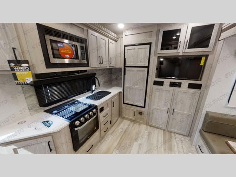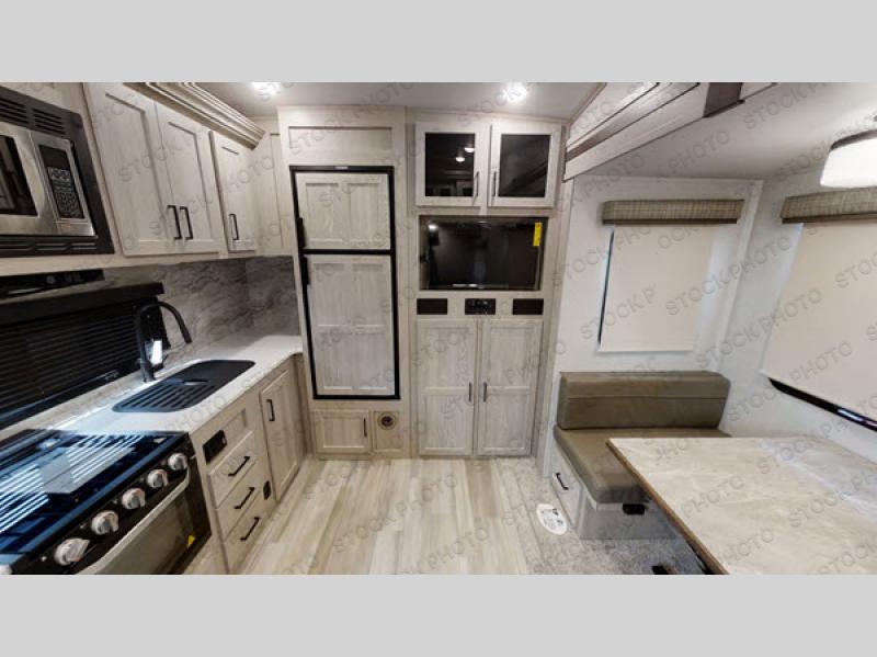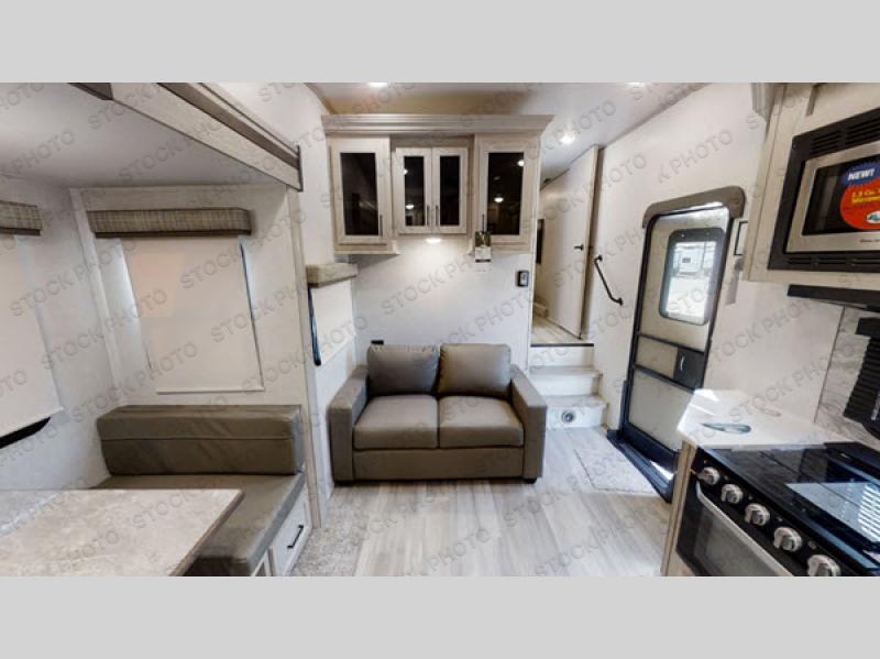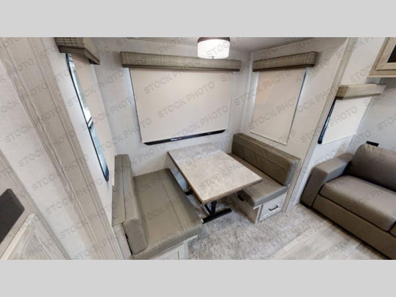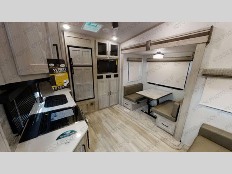 Get away with your spouse to relax, unwind and explore the outdoors after getting a good night's sleep on the walk-around queen bed in the front bedroom which also includes a dresser and a slide out wardrobe with shelves. You might even like to add the TV option. The full bathroom provides a shower with a seat for maximum comfort. You can choose to cook inside with full amenities or outdoors on the outside camp kitchen. There is a pass-through storage compartment to hold your camp chairs and such, plus plenty of storage throughout the inside like the pantry below the LED TV. Other features you are sure to enjoy include a ceiling fan, the 39" booth dinette for dining and gaming, and the 60" hide-a-bed sofa.