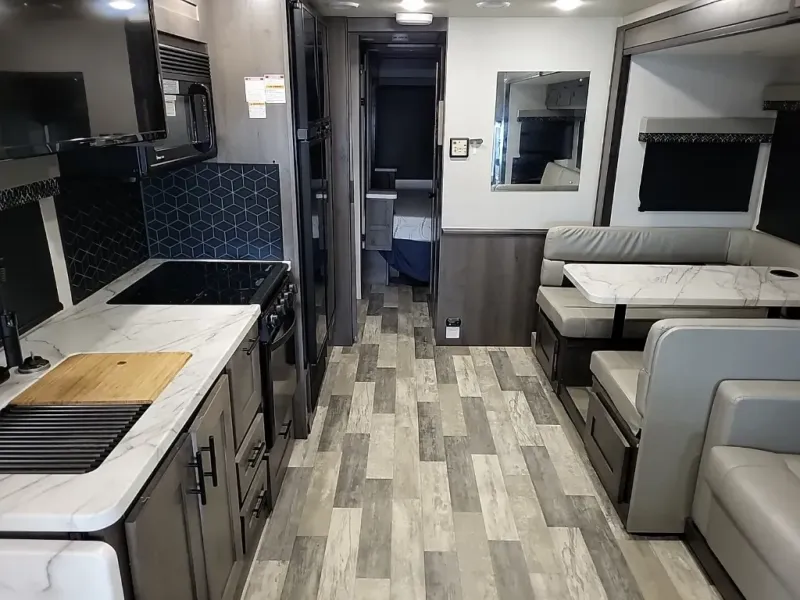 Whether you travel with your spouse or with your grandkids or maybe you enjoy taking your friends on adventures, this FR3 Class A gas motorhome allows you to travel in style with plenty of additional sleeping choices from the power overhead bunk to the furniture once they are set up a night. You can dine at the wrap-around booth dinette, relax on the hide-a-bed sofa, and make full meals in the kitchen which also includes a residential microwave and countertop extension. The separated bathroom allows someone to take a shower while another freshens up in the sink and toilet room, or maybe you decide to close this area off within the bedroom. Every night you can sleep like a king while watching the LED TV in the bedroom, and maybe you decided to add the washer/dryer option to keep everything clean while on the road.