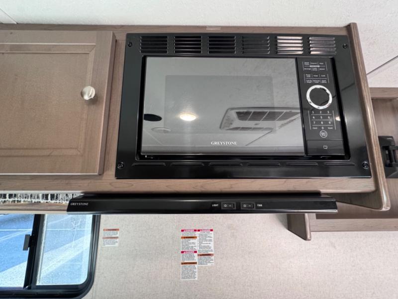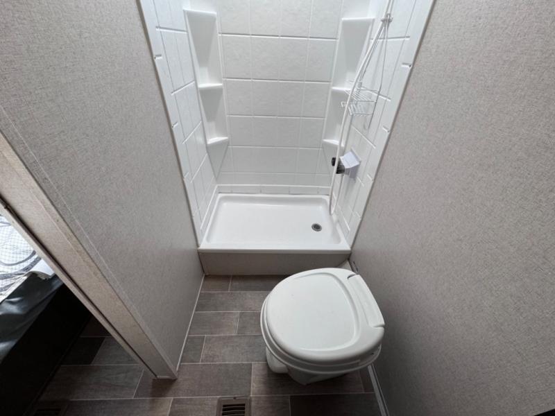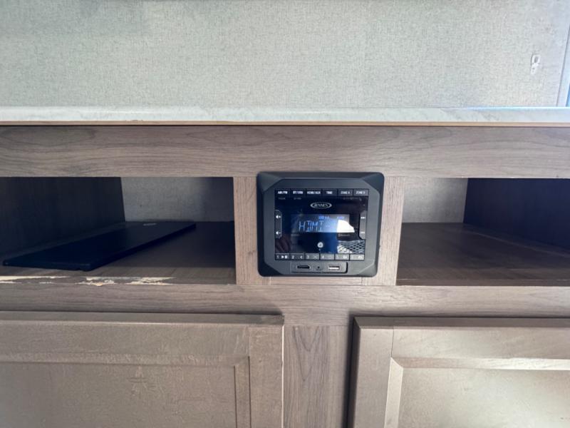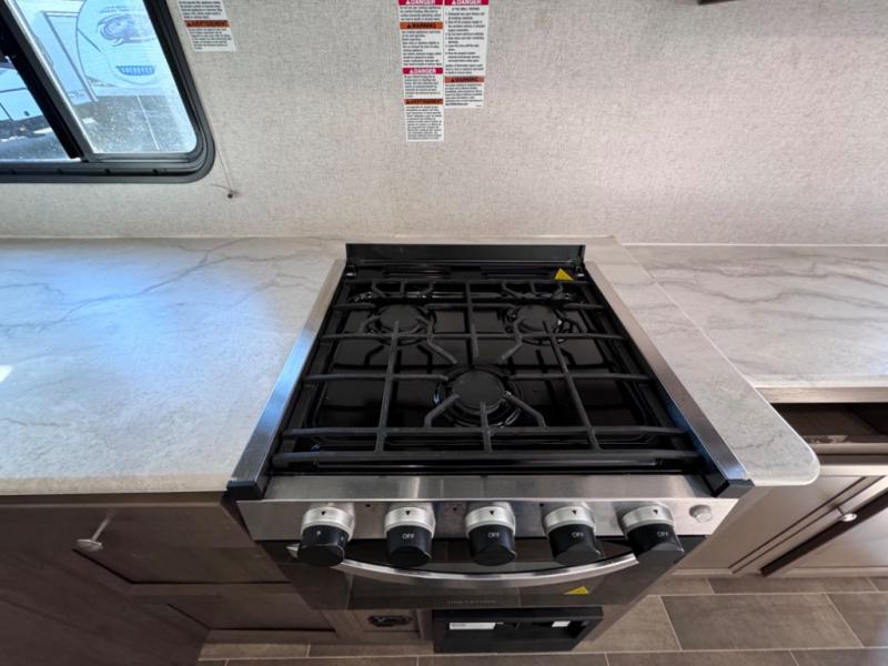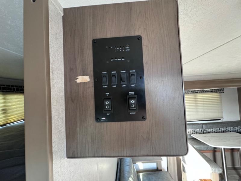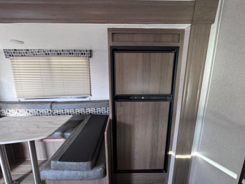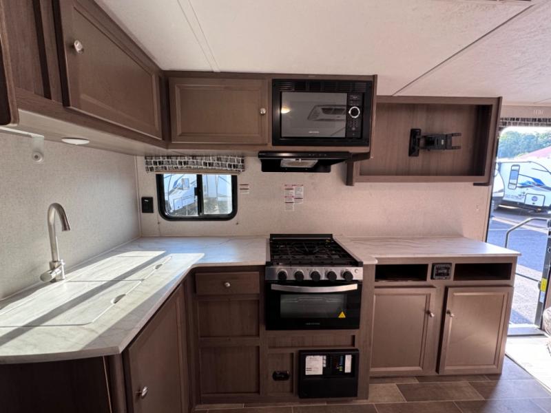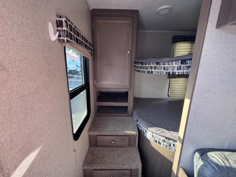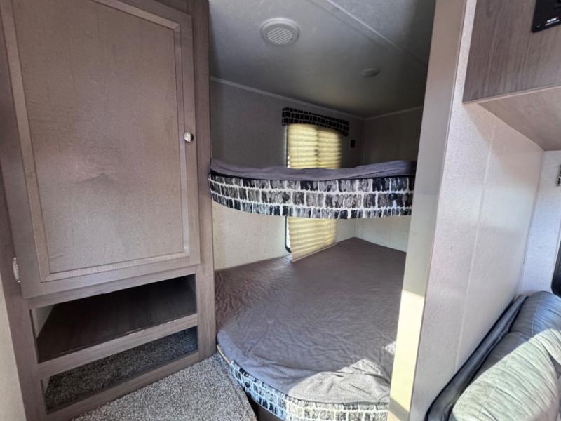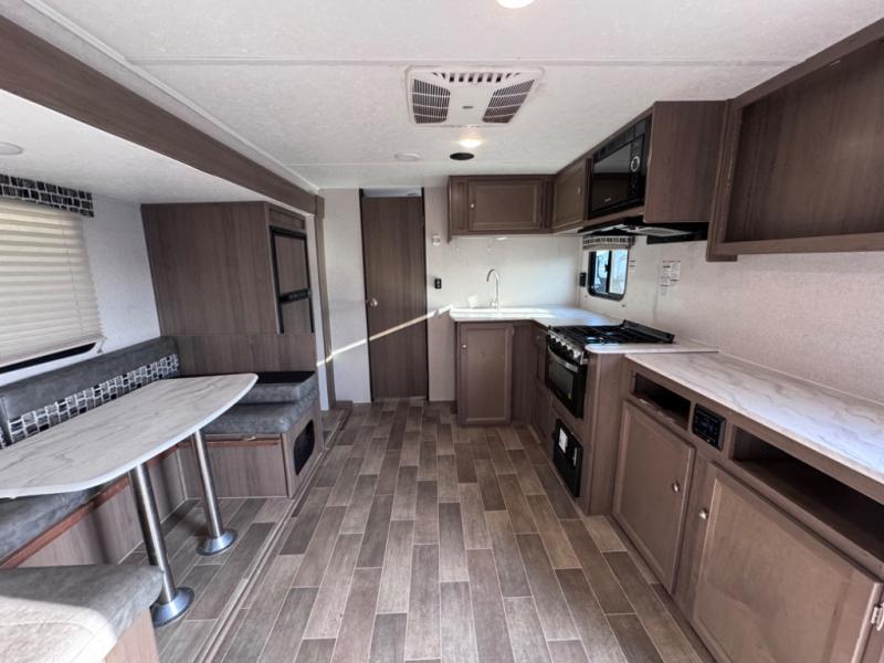 Make your self right at home in this travel trailer that can comfortably sleep nine people each night. The three burner cooktop with an oven allows you to cook a casserole if you wish or make a few meals using the outside camp kitchen, and the U-shaped dinette provides a place everyone can sit around. You may even use this furniture to play a game of cards after you clean up. You'll also find additional seating on the sofa, and the slide out in the main living area will give the dog space to stretch out. The front bedroom has its own exterior entry door, a king bed, and easy access into the walk-through bath, and the kids will love the double size bunk beds and steps at the back.