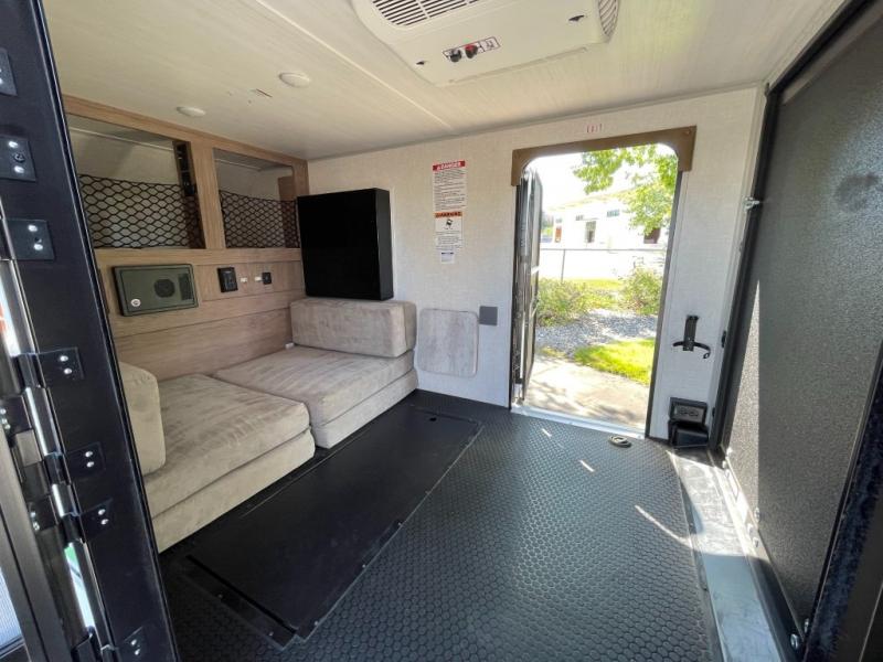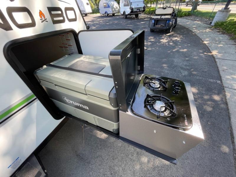 This 10 Series model comes in under 2,000 lbs. offering plenty of storage throughout for your gear, an optional batwing awning to enjoy the outside with some protection from the elements, plus an outdoor kitchen slide with cooktop and 12V/110 refrigerator to enjoy a great meal even without an open fire. There is also a 60" x 82" lounger inside for two to sleep comfortably, and you can access from each side to the outside because of the entry doors on either side of the trailer. And, the industry-exclusive Rhino roof rack equipment, the optional NOBO nest rooftop tent, and the most ground clearance in its class allow you to explore beyond the limits!