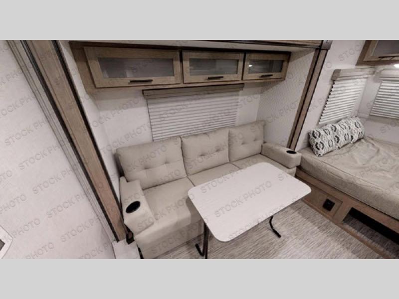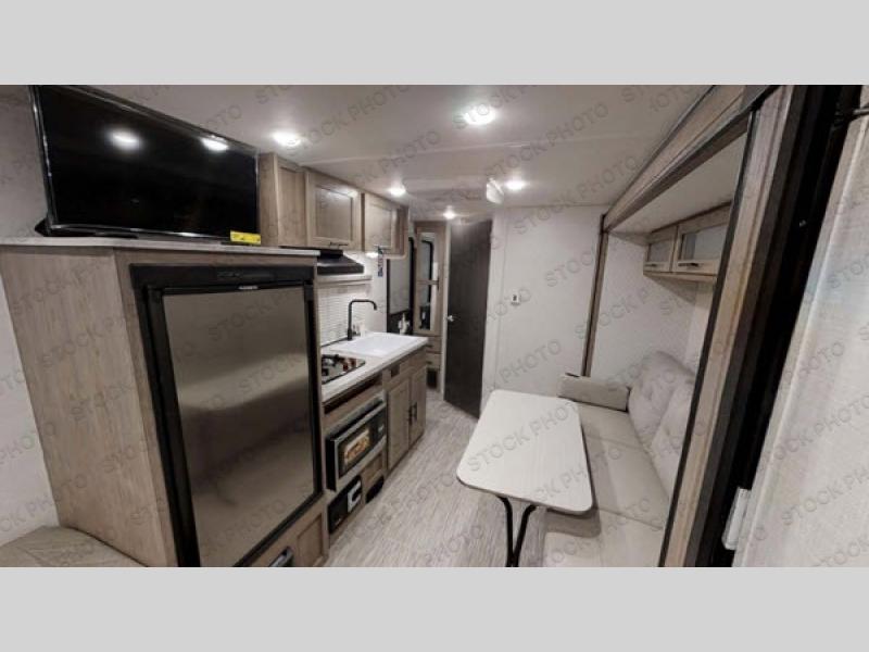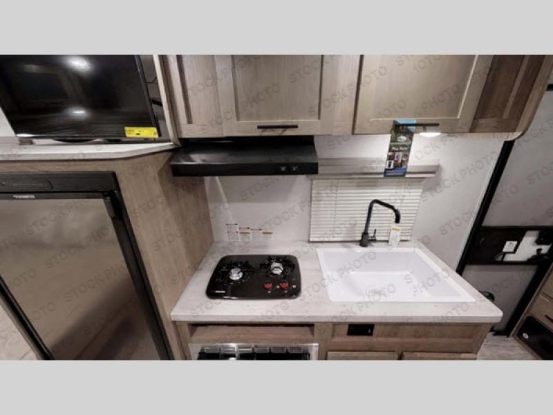 The 60" x 22" panoramic front window allows you to see out into the campgrounds or the mountains depending on where you decide to set up camp! After hiking the trails or climbing the cliffs, you can get cleaned up in the radius shower in the full bathroom and take a nap on either the sofa slide or the RV queen bed. When you are ready for a warm meal, the galley kitchen offers a two-burner stovetop and a 5-cu. ft. refrigerator. You will find storage throughout the inside as well as in the pass-through compartment outside and on the roof with the Rhino rack RVT track!