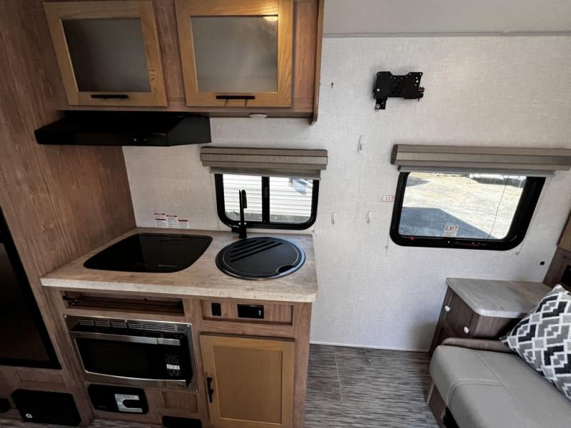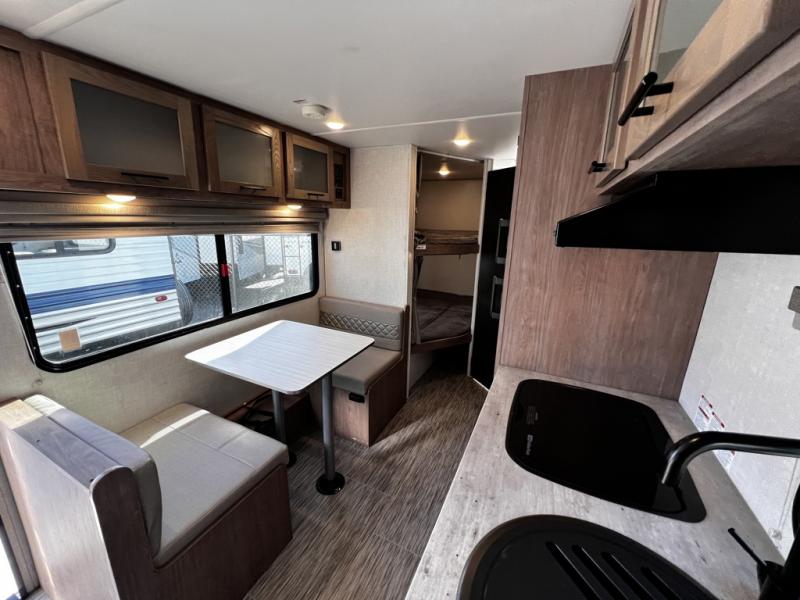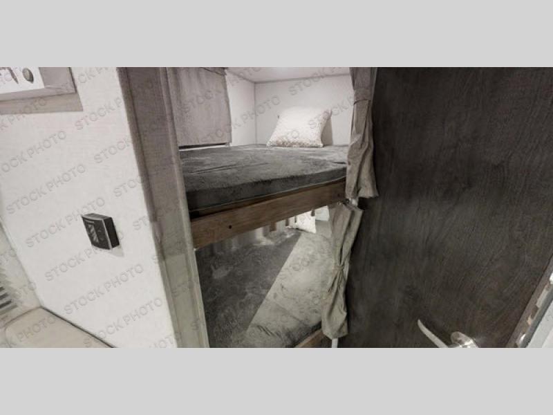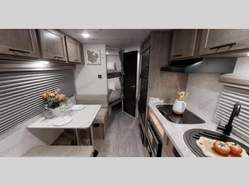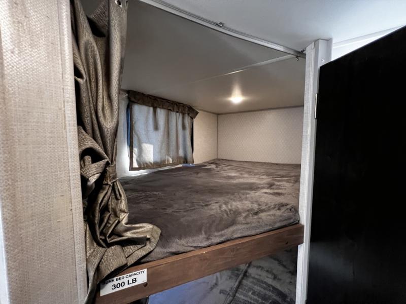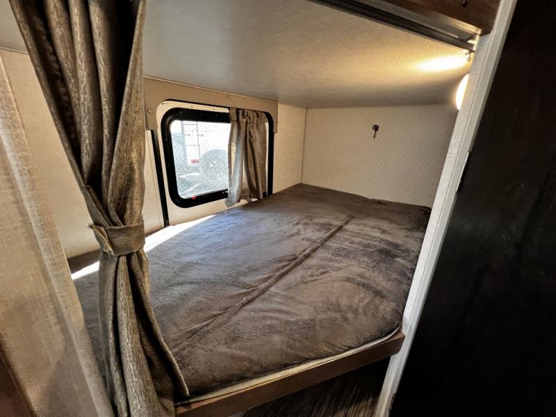This family-friendly trailer offers sleeping space for five with the queen Murphy bed, the two bunk beds and the dinette once folded down for the evening. The cook can prepare dinner on the two-burner cooktop and easily clean up using the deep bowl sink. The refrigerator and pantry offer food storage, and you will find more places to stow clothes and camping gear throughout the inside and outside. The adventure storage door allows you to place items from the outside to the inside just under the bunks, and the pass-through compartment offers storage for fishing poles and such. Plus, the Rhino rack roof system allows you to stow your kayak and more.