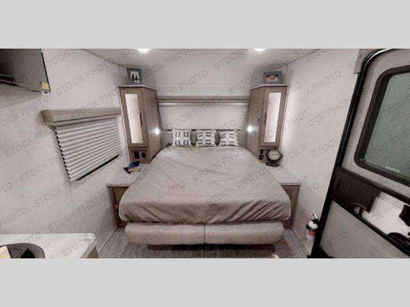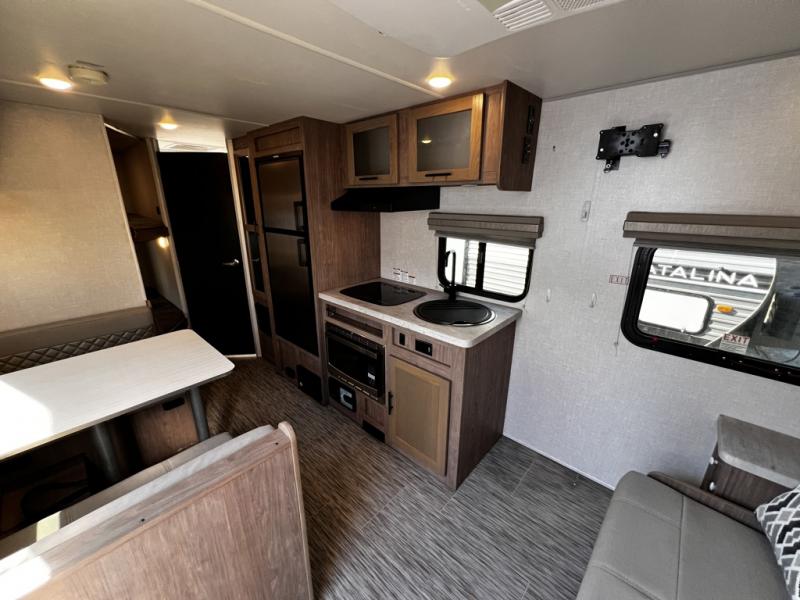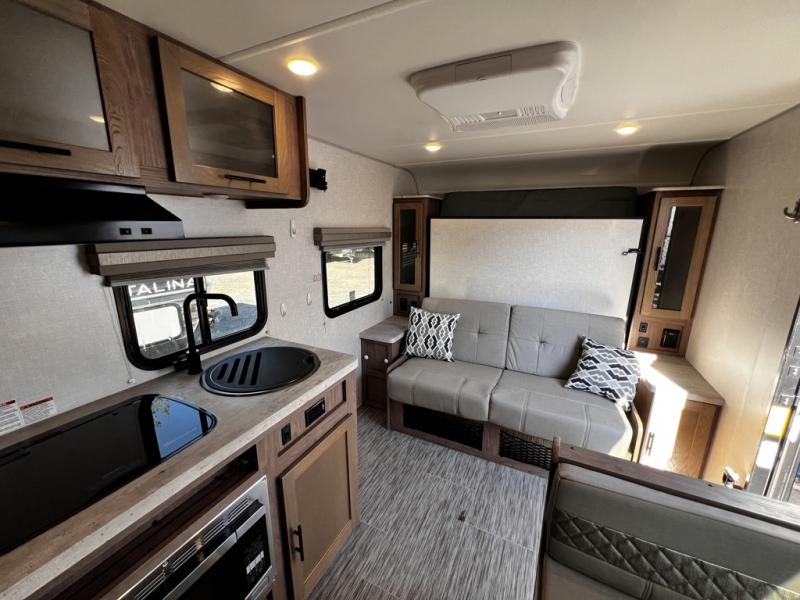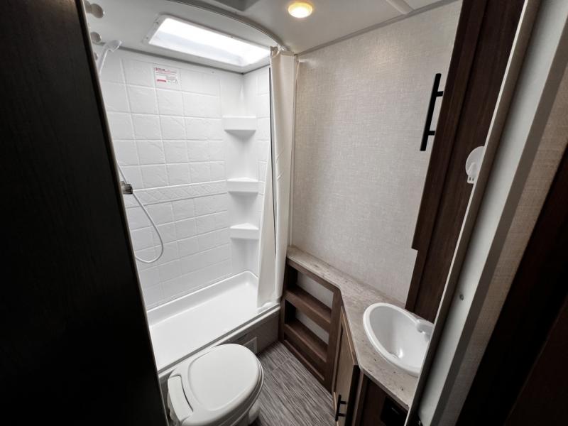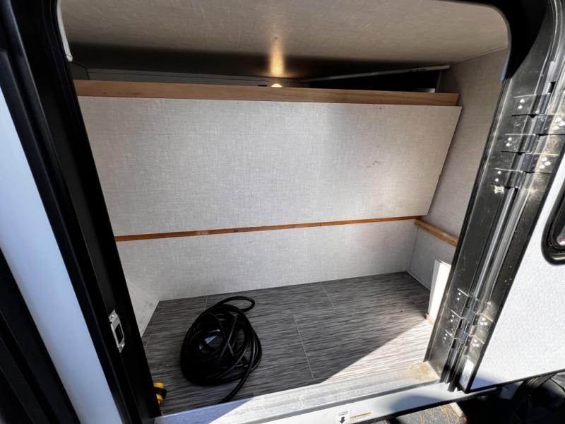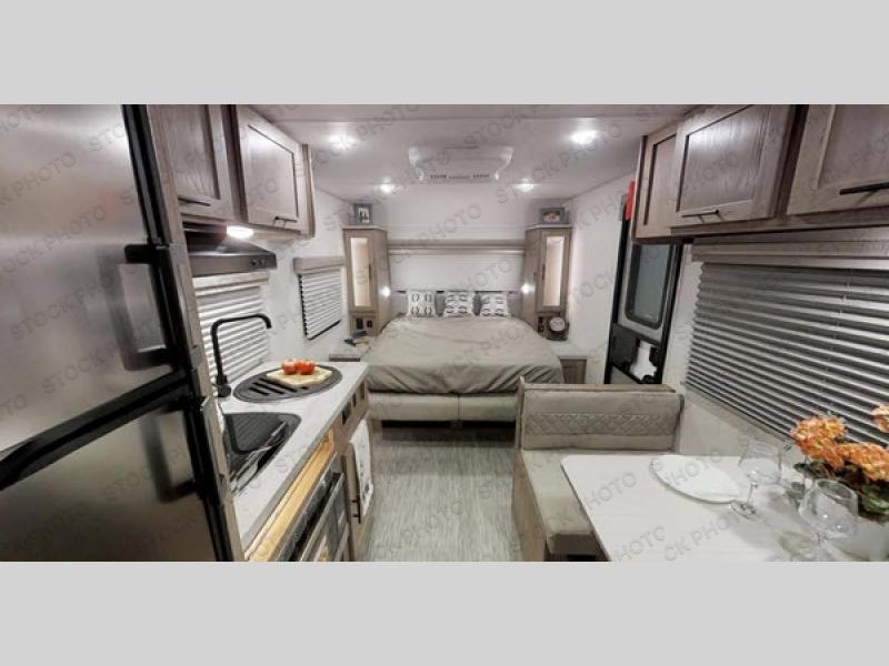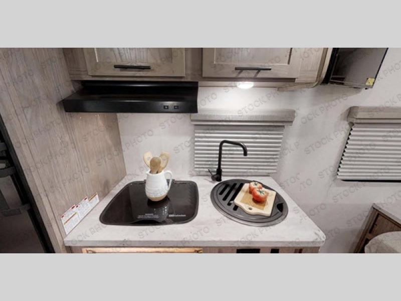 This family-friendly trailer offers sleeping space for five with the queen Murphy bed, the two bunk beds and the dinette once folded down for the evening. The cook can prepare dinner on the two-burner cooktop and easily clean up using the deep bowl sink. The refrigerator and pantry offer food storage, and you will find more places to stow clothes and camping gear throughout the inside and outside. The adventure storage door allows you to place items from the outside to the inside just under the bunks, and the pass-through compartment offers storage for fishing poles and such. Plus, the Rhino rack roof system allows you to stow your kayak and more.