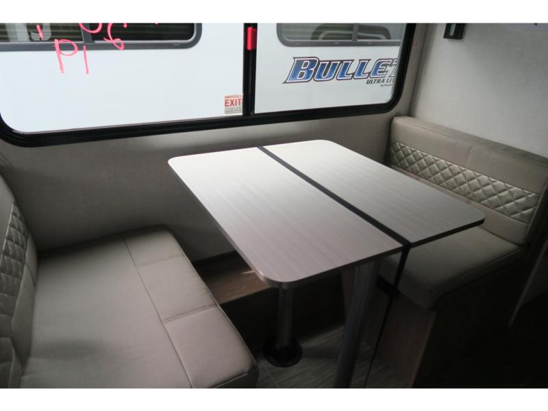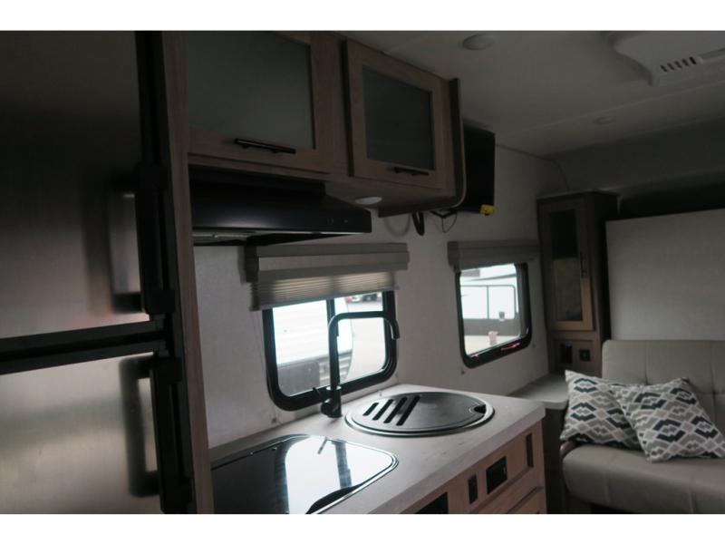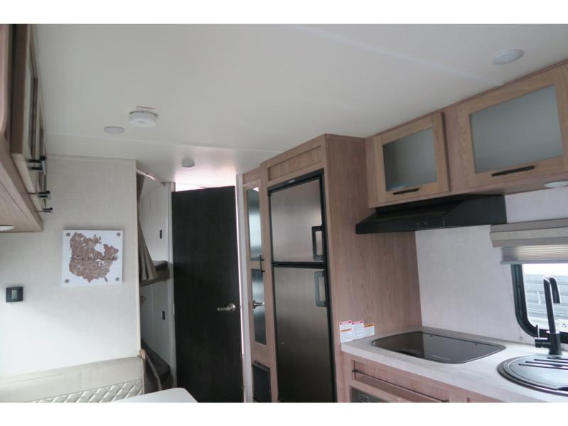 This family-friendly trailer offers sleeping space for five with the queen Murphy bed, the two bunk beds and the dinette once folded down for the evening. The cook can prepare dinner on the two-burner cooktop and easily clean up using the deep bowl sink. The refrigerator and pantry offer food storage, and you will find more places to stow clothes and camping gear throughout the inside and outside. The adventure storage door allows you to place items from the outside to the inside just under the bunks, and the pass-through compartment offers storage for fishing poles and such. Plus, the Rhino rack roof system allows you to stow your kayak and more.