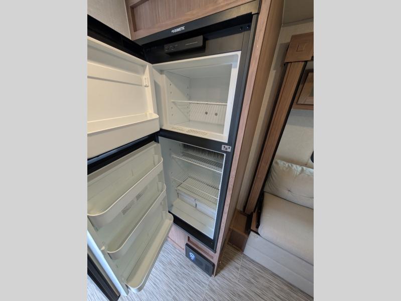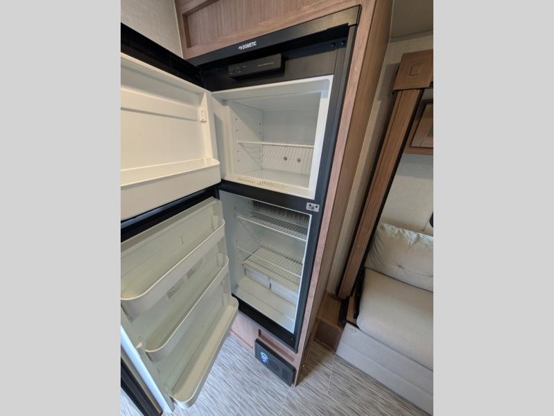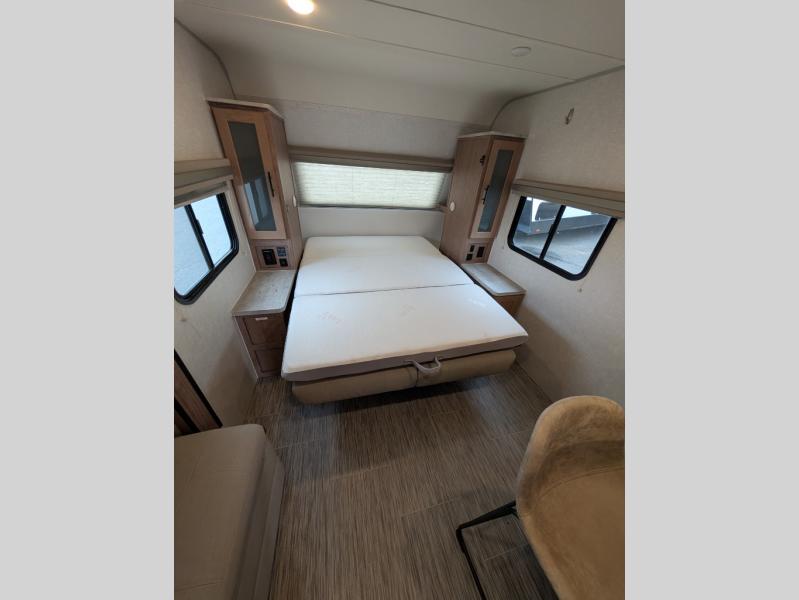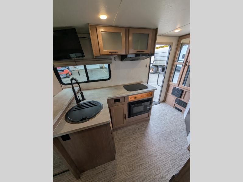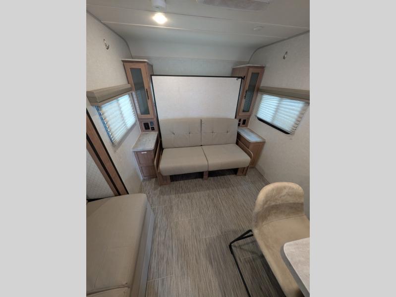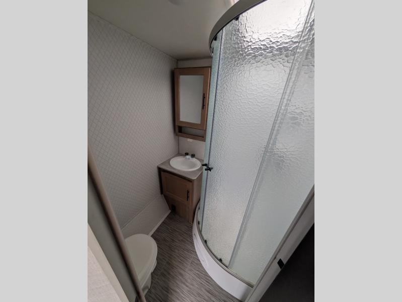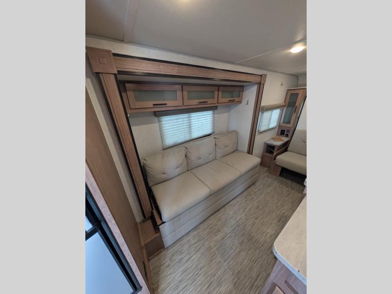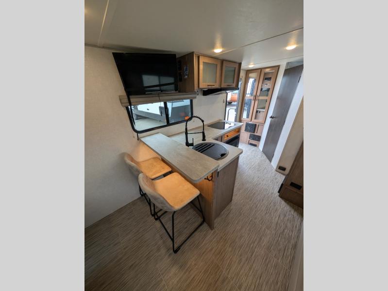 If you haven't experienced the versatility of a Murphy queen bed that can fold out when you need it at night and hide away during the day when you need the sofa, give it a try! You will also find a sofa on the single slide that pushes out to reveal more interior living space. The breakfast bar provides countertop space for dining or visiting with the cook. This can be the perfect couple's trailer, yet a child or guest can sleep on the sofa. Everyone can take turns getting cleaned up in the radius shower in the rear corner bathroom, and some campers can hang out outdoors under the 16' power awning that offers an outdoor living area once you add your camping chairs.