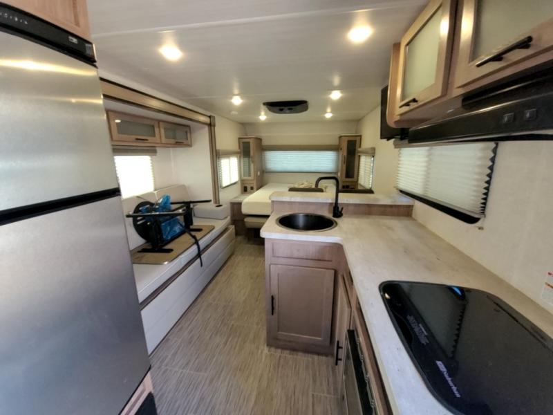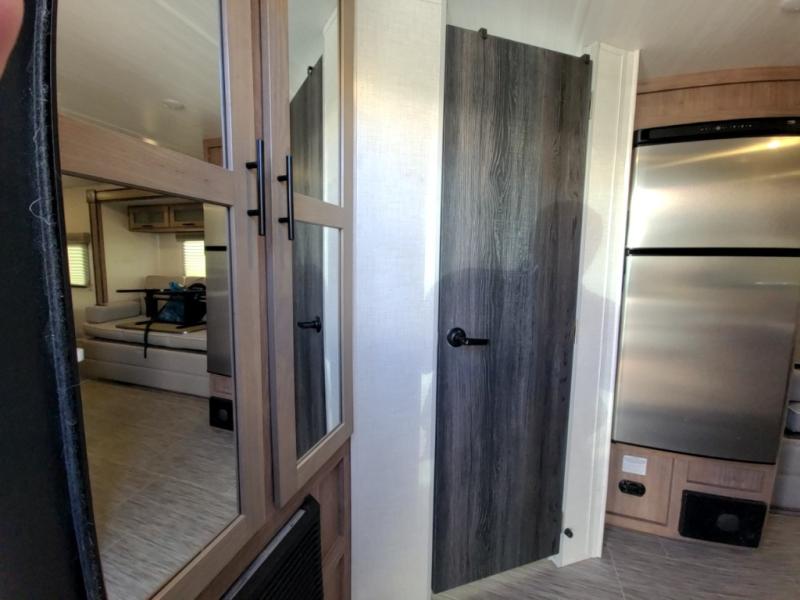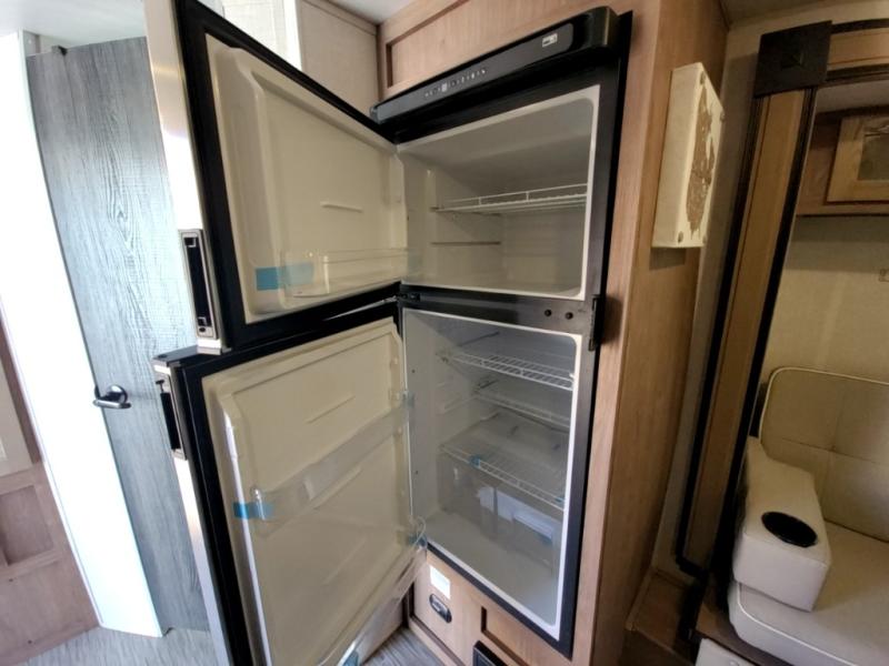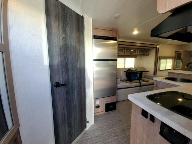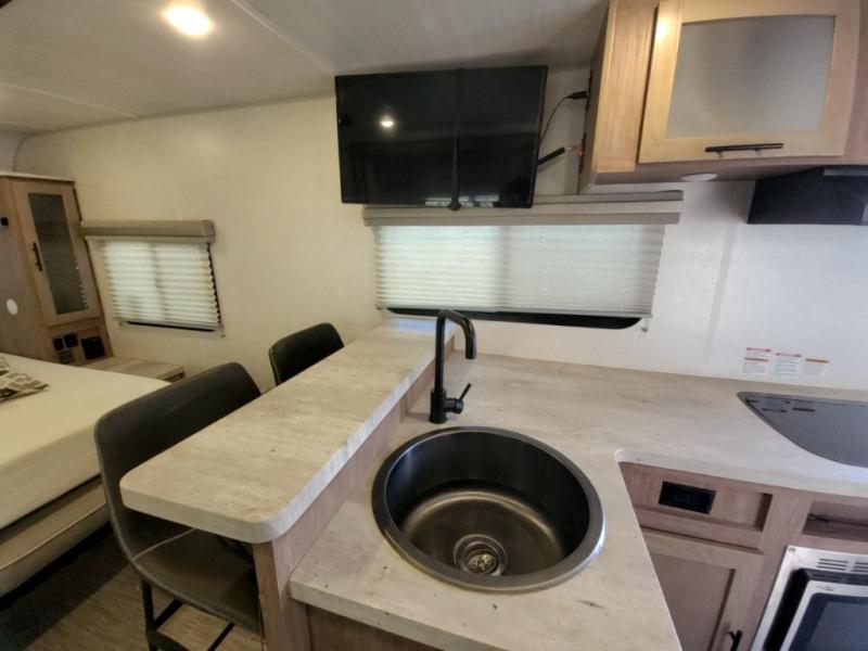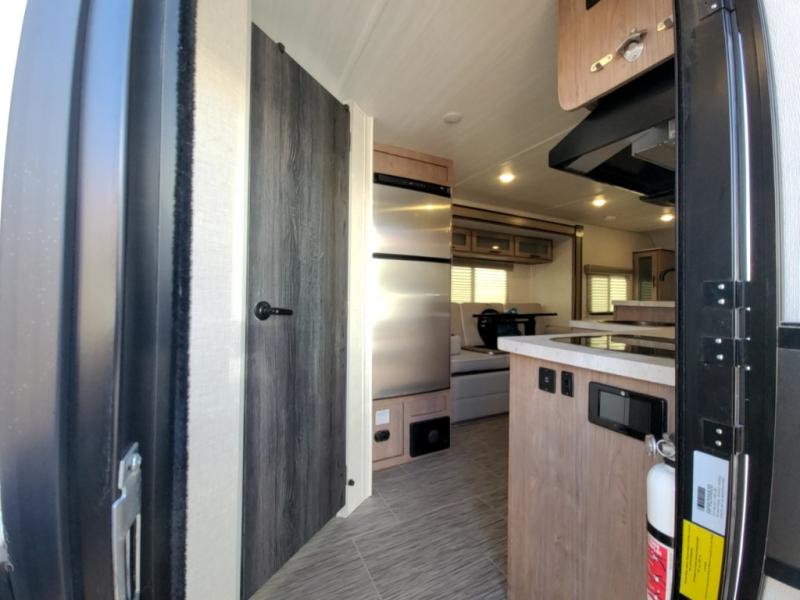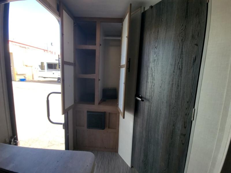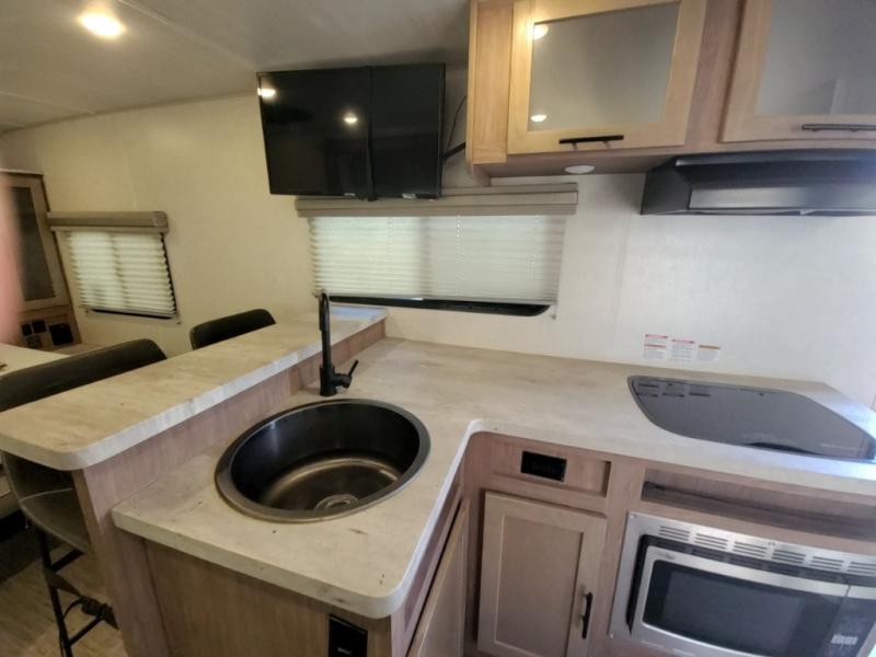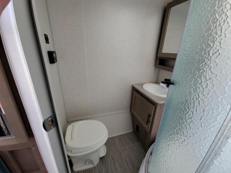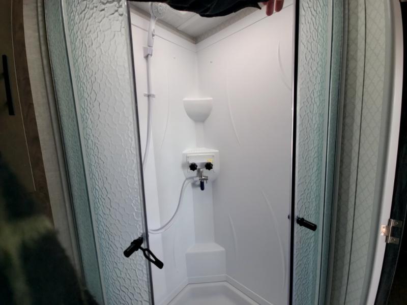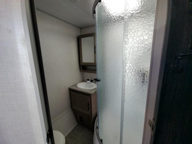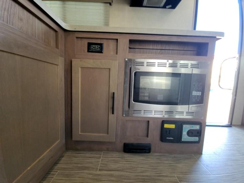 If you haven't experienced the versatility of a Murphy queen bed that can fold out when you need it at night and hide away during the day when you need the sofa, give it a try! You will also find a sofa on the single slide that pushes out to reveal more interior living space. The breakfast bar provides countertop space for dining or visiting with the cook. This can be the perfect couple's trailer, yet a child or guest can sleep on the sofa. Everyone can take turns getting cleaned up in the radius shower in the rear corner bathroom, and some campers can hang out outdoors under the 16' power awning that offers an outdoor living area once you add your camping chairs.