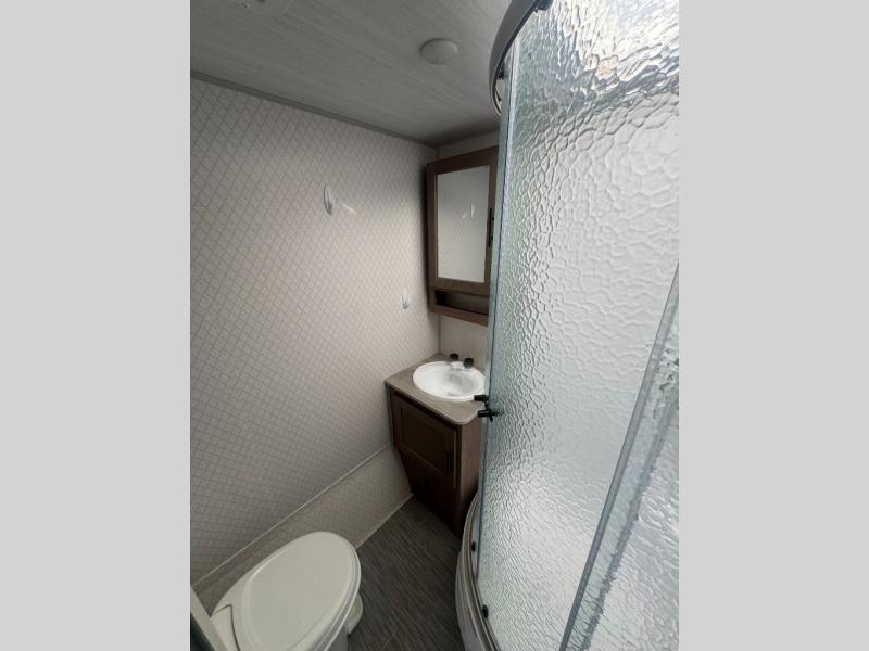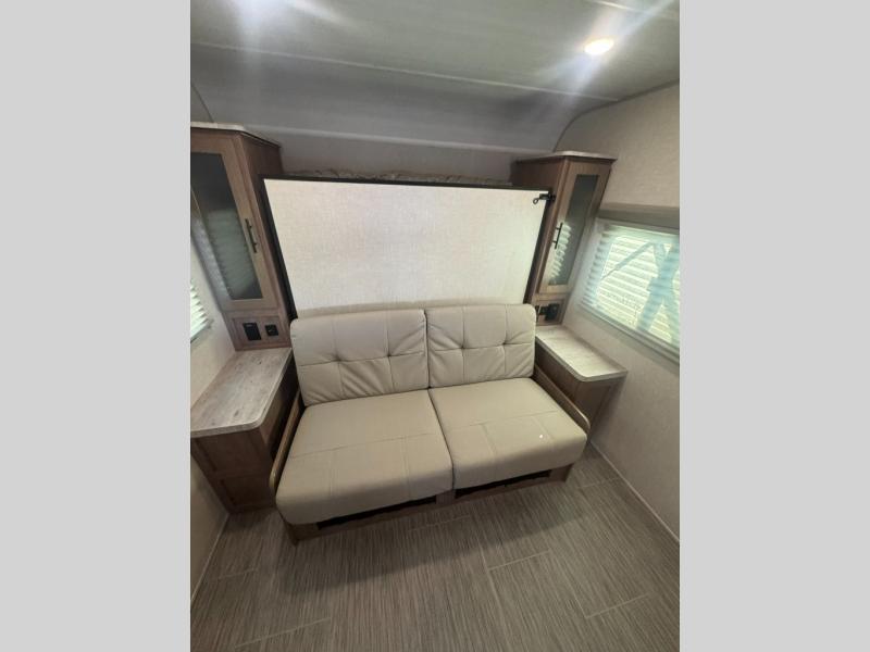 If you haven't experienced the versatility of a Murphy queen bed that can fold out when you need it at night and hide away during the day when you need the sofa, give it a try! You will also find a sofa on the single slide that pushes out to reveal more interior living space. The breakfast bar provides countertop space for dining or visiting with the cook. This can be the perfect couple's trailer, yet a child or guest can sleep on the sofa. Everyone can take turns getting cleaned up in the radius shower in the rear corner bathroom, and some campers can hang out outdoors under the 16' power awning that offers an outdoor living area once you add your camping chairs.
