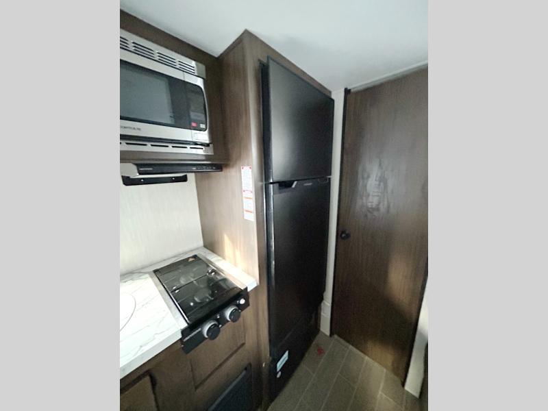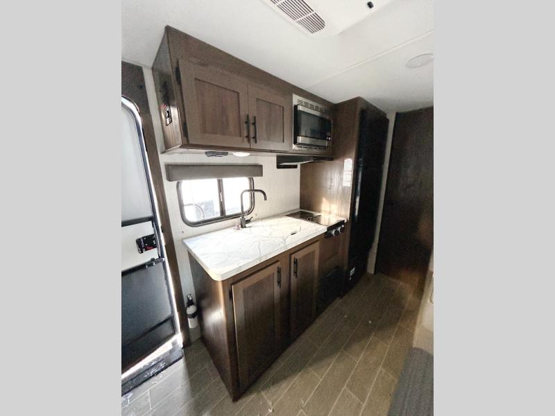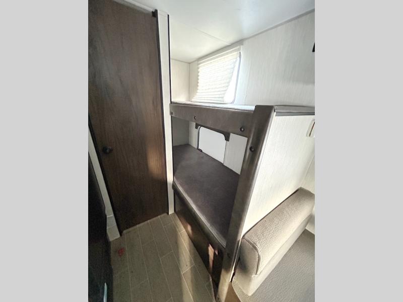 Imagine your kids on the rear bunk beds in this Patriot Edition travel trailer while you enjoy the front queen bed before everyone gets up to make breakfast and head out for a hike. The kitchen includes a high-output cooktop and microwave, as well as a refrigerator to store your leftovers and a sink to wash the dishes. You will find storage in the overhead cabinets, and there is a shelf by the queen bed. Your hiking gear can also be stowed out in the outside storage.