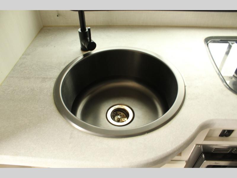 Don’t let the size fool you — this R Pod is fully loaded for your culinary adventures. Enjoy a two-burner recessed cooktop, convection microwave, large refrigerator, and deep stainless steel sink. The solid-surface countertops and high-end finishes make this galley both functional and stylish.